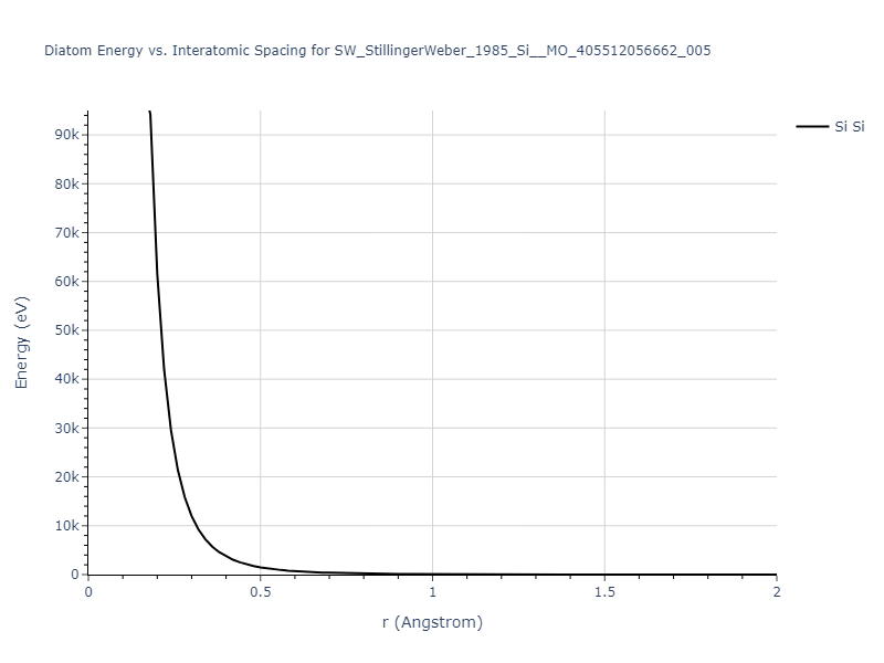 Plots of the potential energy vs interatomic spacing, r, are shown below for all diatom sets associated with the interatomic potential. This calculation provides insights into the functional form of the potential's two-body interactions. A system consisting of only two atoms is created, and the potential energy is evaluated for the atoms separated by 0.02 Å <= r <= 6.0> Å in intervals of 0.02 Å. Two plots are shown: one for the "standard" interaction distance range, and one for small values of r. The small r plot is useful for determining whether the potential is suitable for radiation studies.
