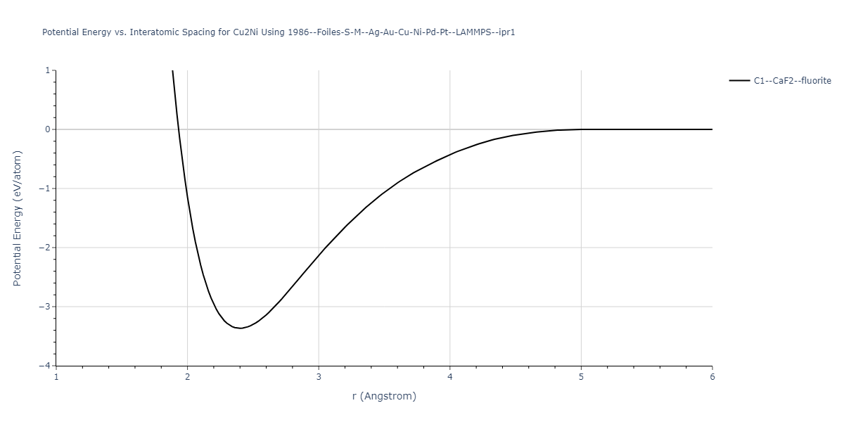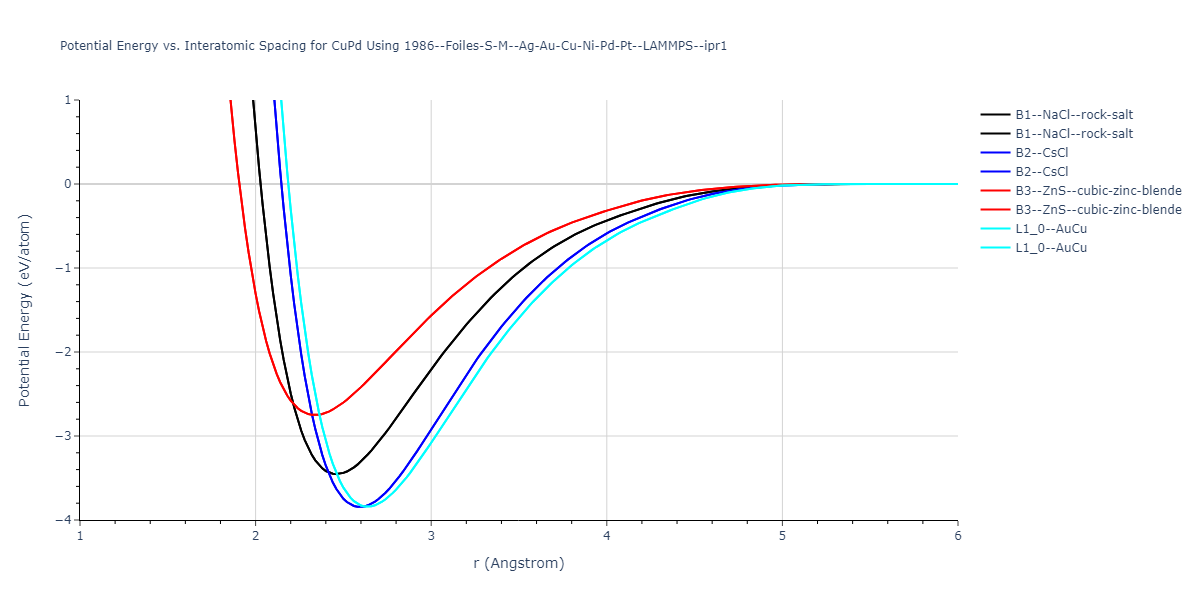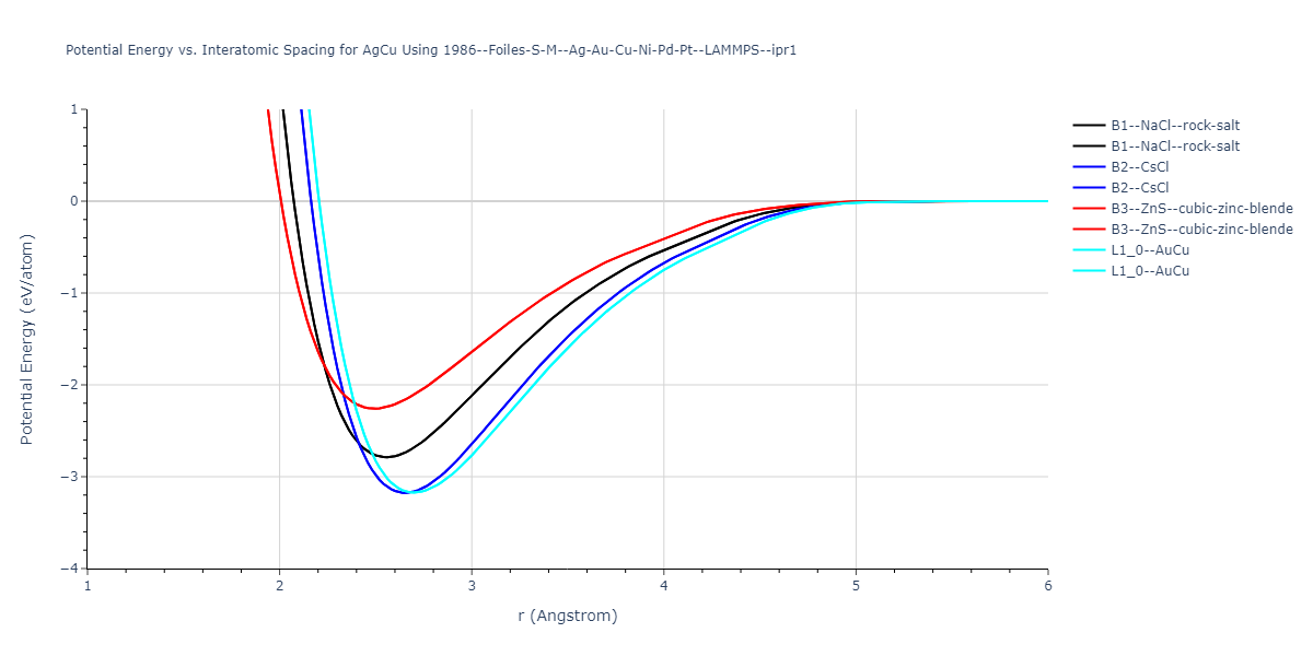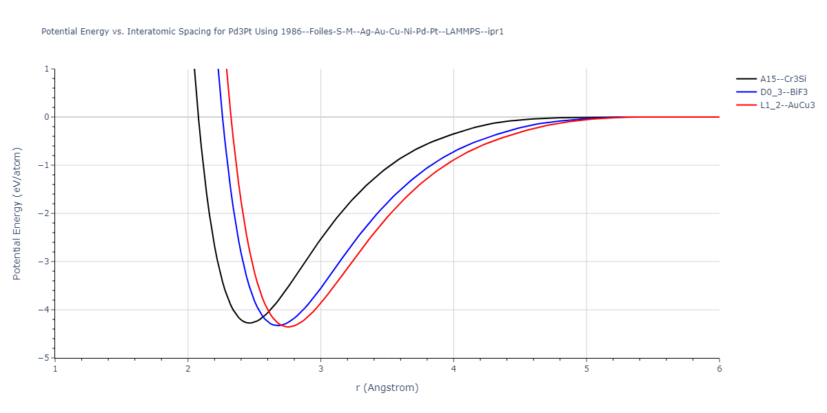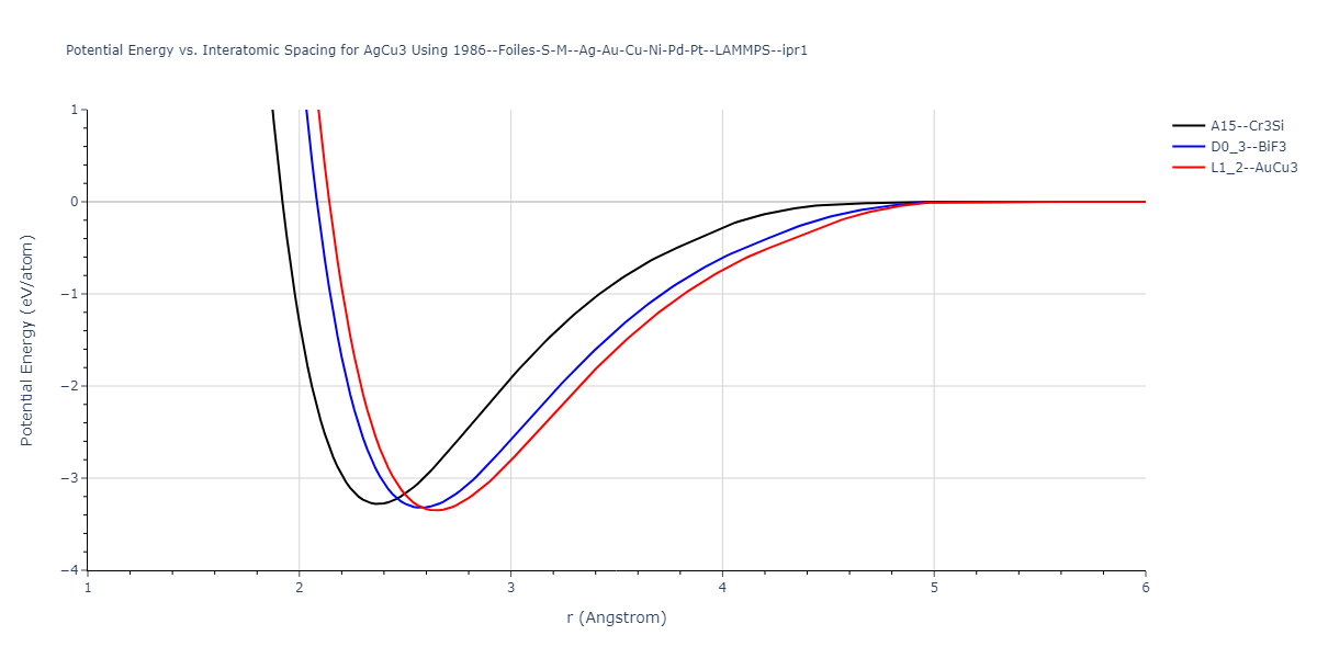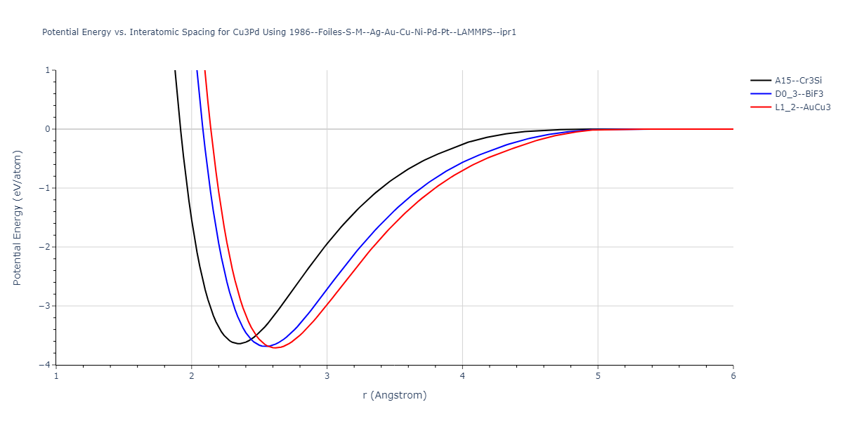 Plots of potential energy vs interatomic spacing, r, are shown below for a number of crystal structures. The structures are generated based on the ideal atomic positions and b/a and c/a lattice parameter ratios for a given crystal prototype. The size of the system is then uniformly scaled, and the energy calculated without relaxing the system. To obtain these plots, values of r are evaluated every 0.02 Å up to 6 Å.