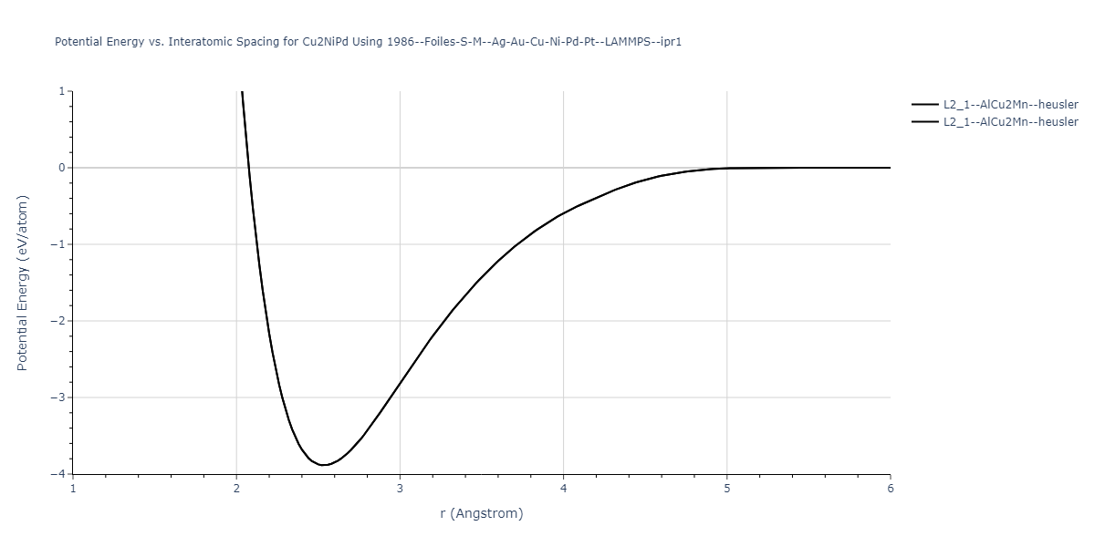 Plots of the potential energy vs interatomic spacing, r, are shown below for all diatom sets associated with the interatomic potential. This calculation provides insights into the functional form of the potential's two-body interactions. A system consisting of only two atoms is created, and the potential energy is evaluated for the atoms separated by 0.02 Å <= r <= 6.0> Å in intervals of 0.02 Å. Two plots are shown: one for the "standard" interaction distance range, and one for small values of r. The small r plot is useful for determining whether the potential is suitable for radiation studies.