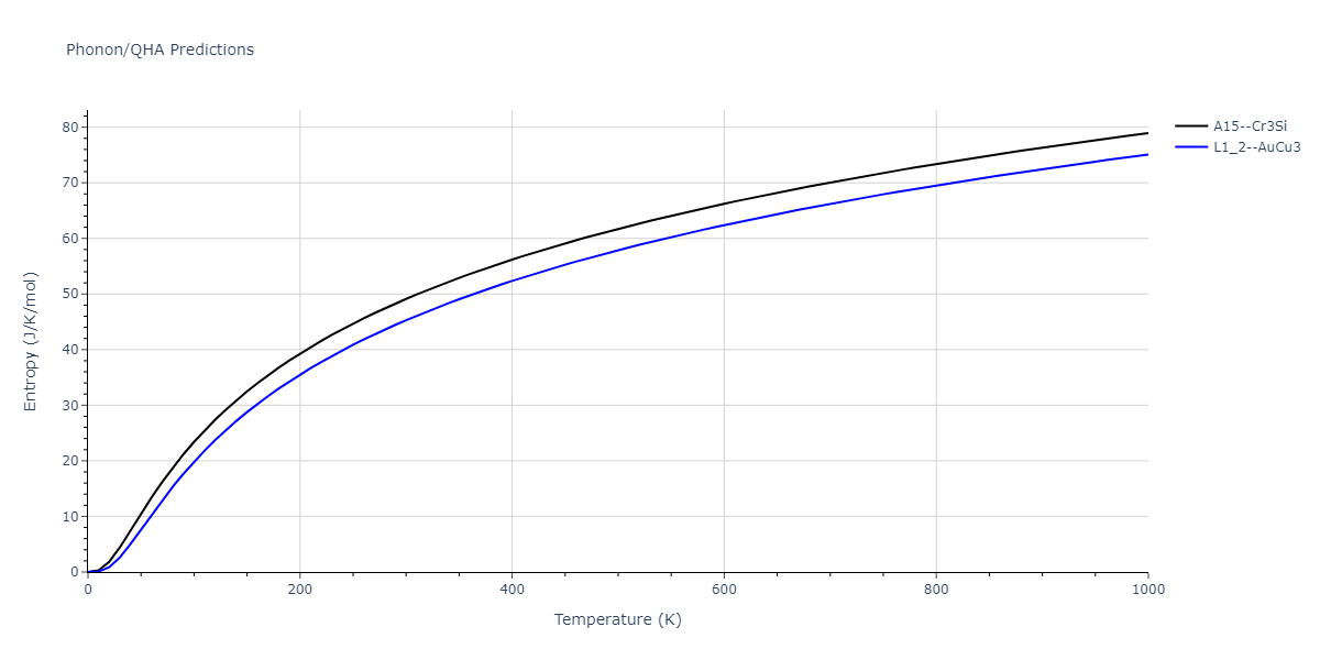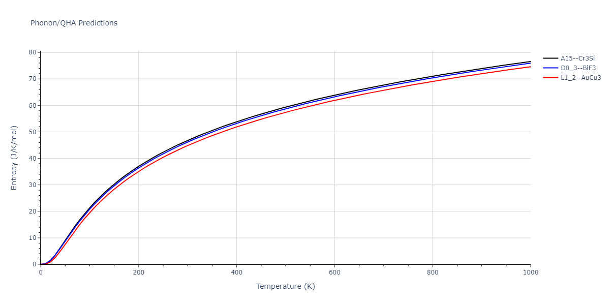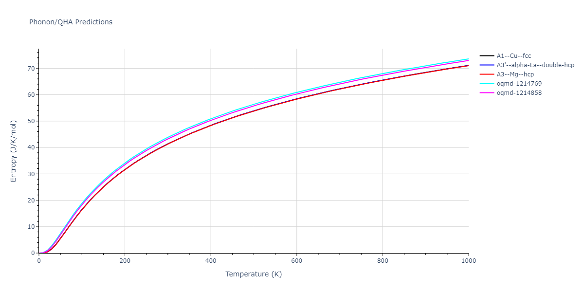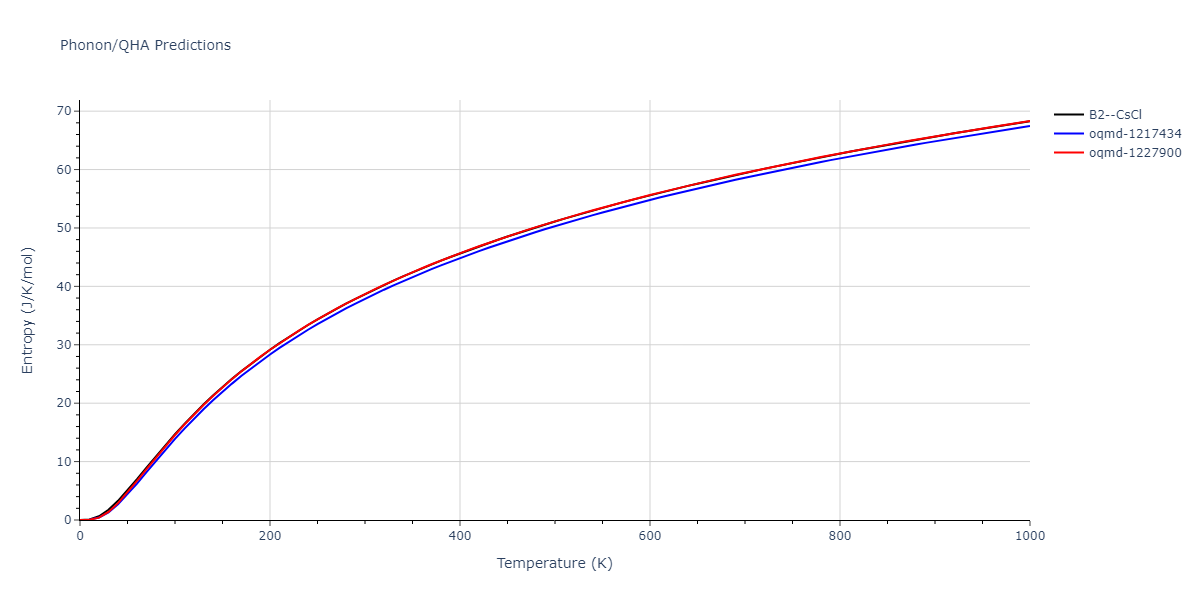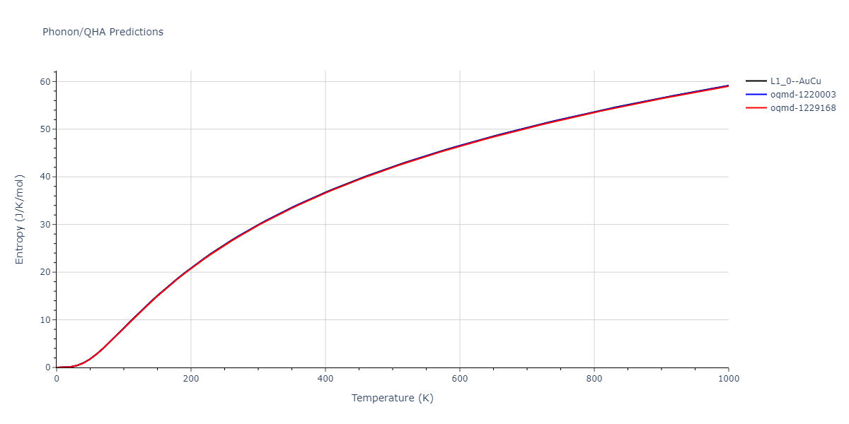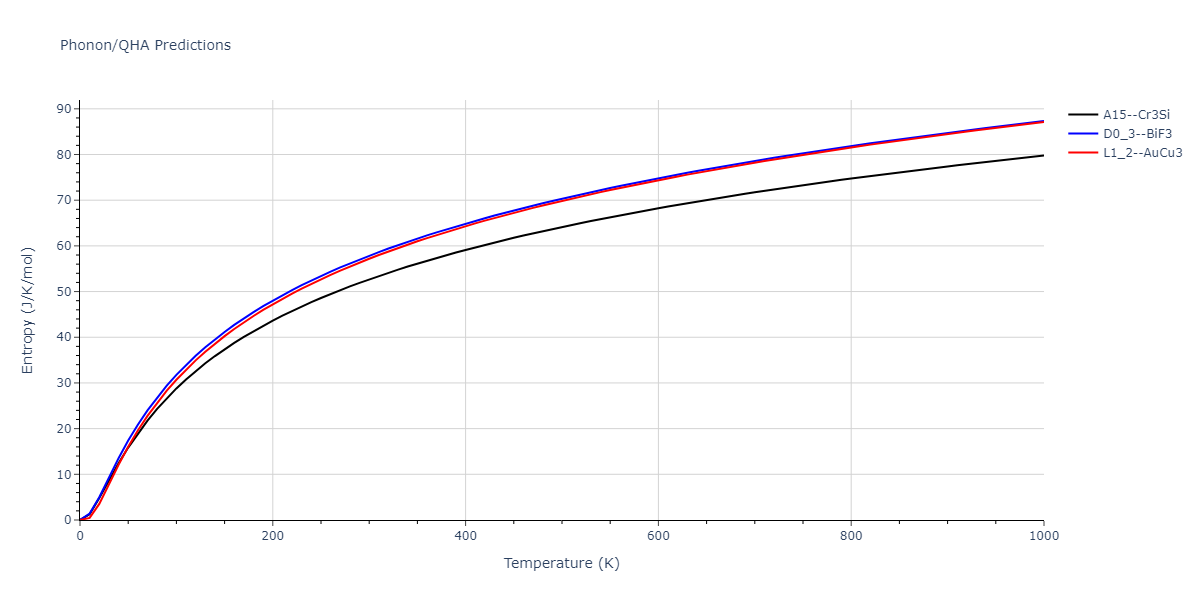 The Gibbs energies of the phases are estimated using thermodynamic integration between the interatomic potential in question and a simpler model with known Gibbs free energy values. For solids, the reference model is an Einstein solid, while for liquids it is the Uhlenbeck-Ford potential. Besides a short run at the start of the solid calculations to estimate Einstein model spring constants, the two calculations proceed similarly. Starting with the final relaxation configurations, the systems are stabilized for 25,000 steps. Then, over the next 50,000 steps the potential is swapped out for the reference potential. The system is then stabilized for another 25,000 steps with the reference model before a reverse swap of 50,000 steps is performed. The simulation ends with one final 25,000 step stabilization period. From the simulation, the irreversible work of transformation is estimated and used to compute the absolute Gibbs free energy of the target phase and potential relative to the reference potential. Entropy is estimated as the difference in enthalpy and Gibbs free energy and divided by temperature.