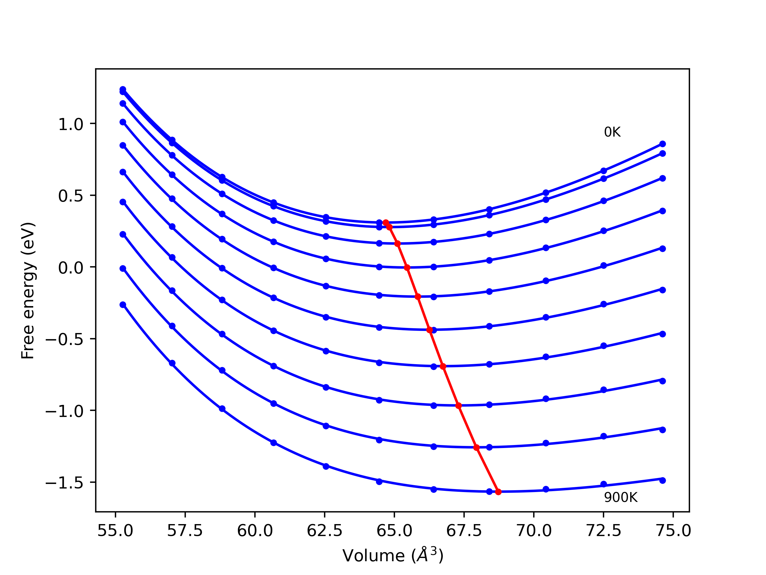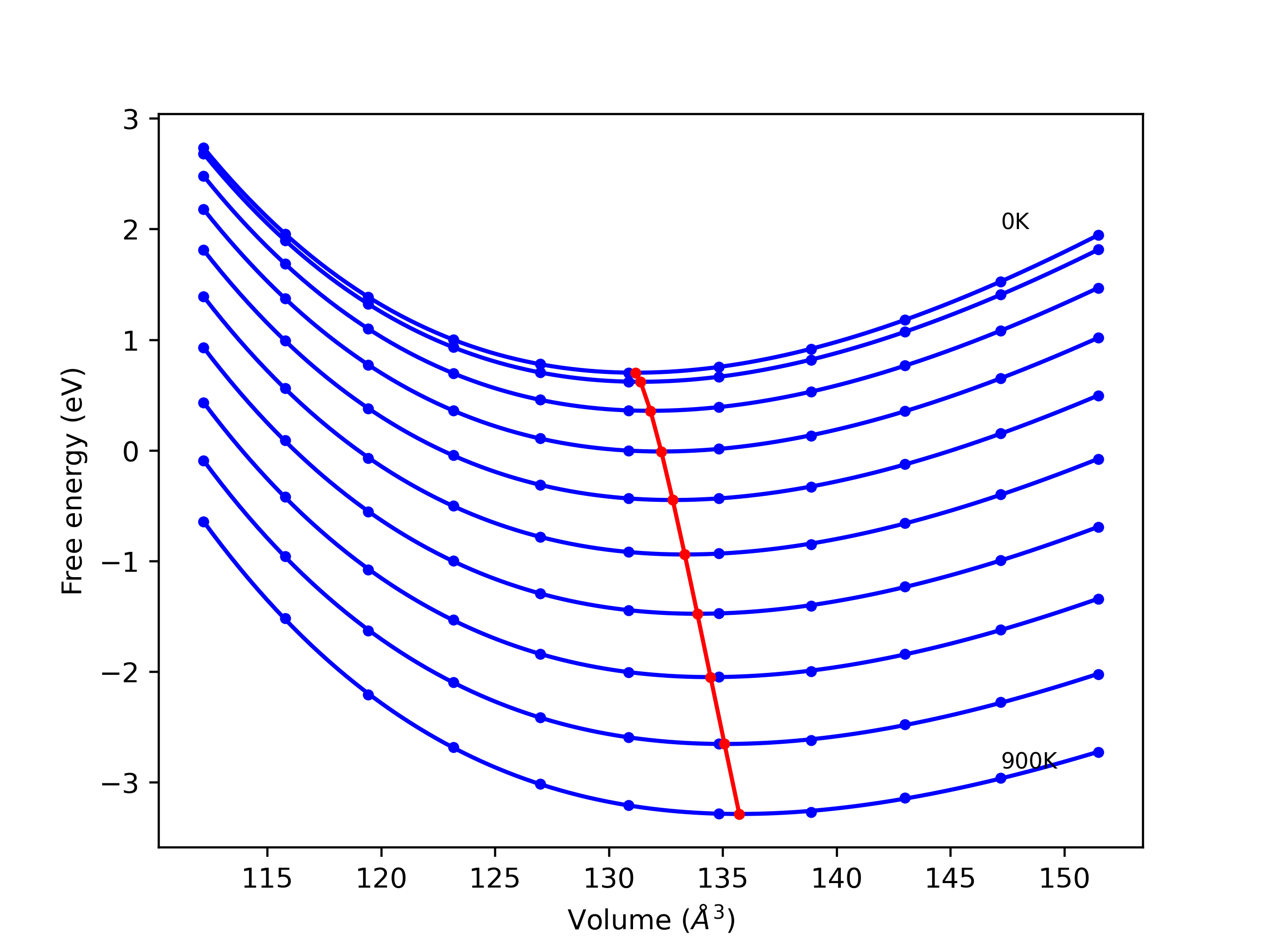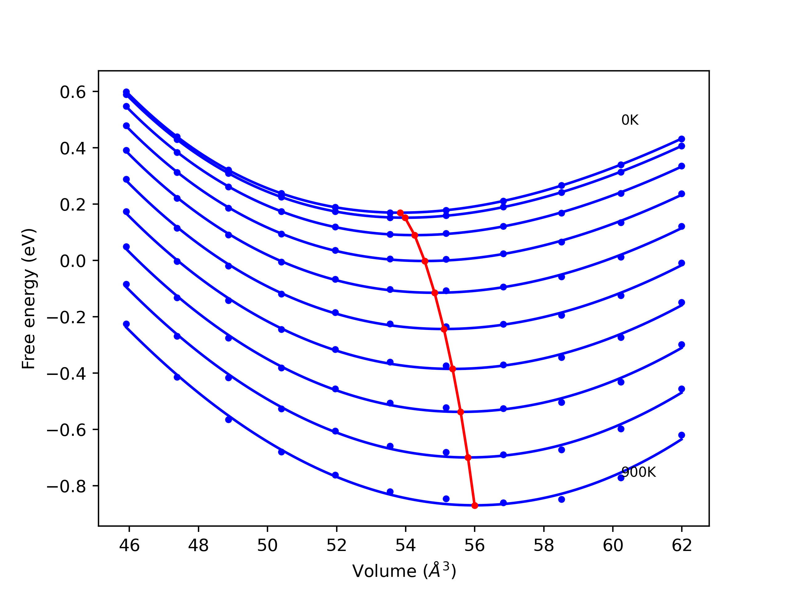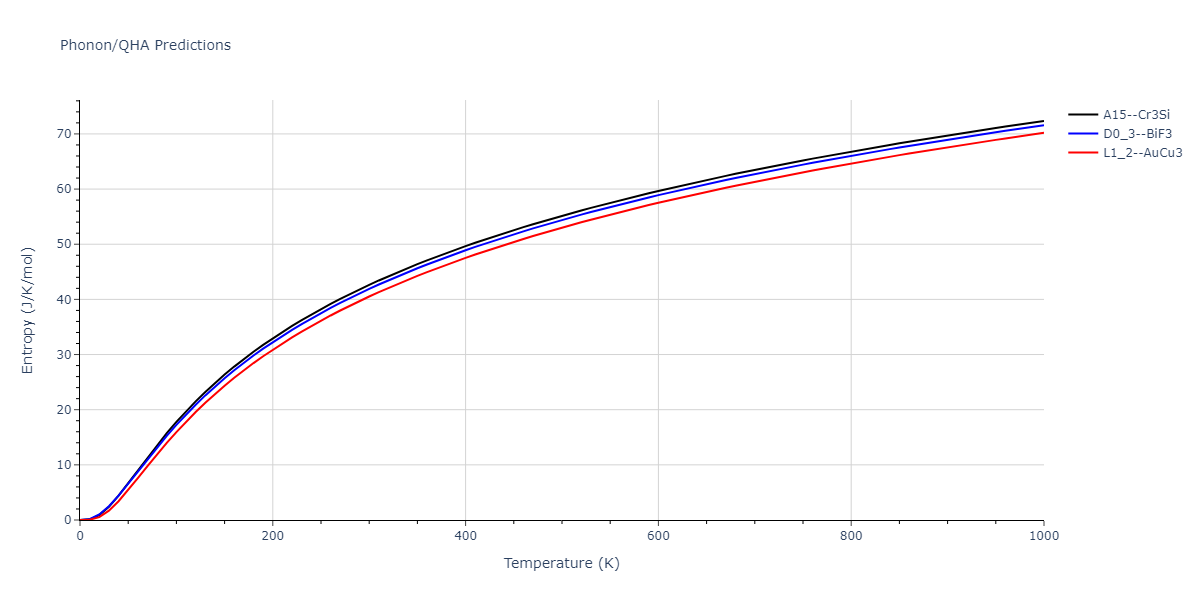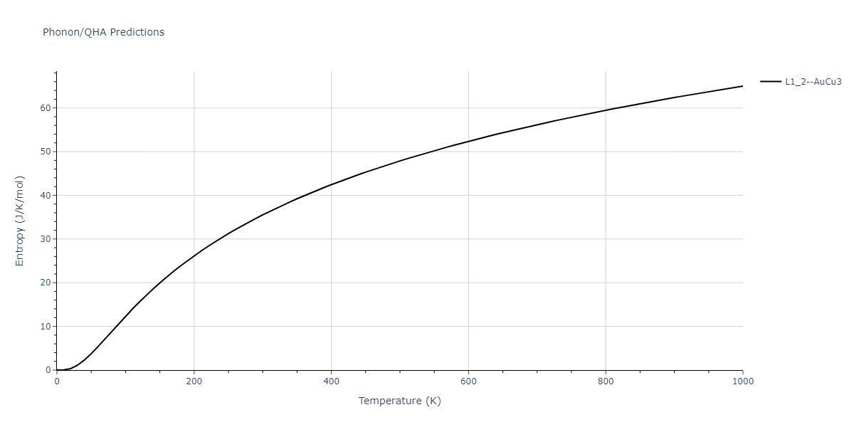 The Gibbs energies of the phases are estimated using thermodynamic integration between the interatomic potential in question and a simpler model with known Gibbs free energy values. For solids, the reference model is an Einstein solid, while for liquids it is the Uhlenbeck-Ford potential. Besides a short run at the start of the solid calculations to estimate Einstein model spring constants, the two calculations proceed similarly. Starting with the final relaxation configurations, the systems are stabilized for 25,000 steps. Then, over the next 50,000 steps the potential is swapped out for the reference potential. The system is then stabilized for another 25,000 steps with the reference model before a reverse swap of 50,000 steps is performed. The simulation ends with one final 25,000 step stabilization period. From the simulation, the irreversible work of transformation is estimated and used to compute the absolute Gibbs free energy of the target phase and potential relative to the reference potential. Entropy is estimated as the difference in enthalpy and Gibbs free energy and divided by temperature.