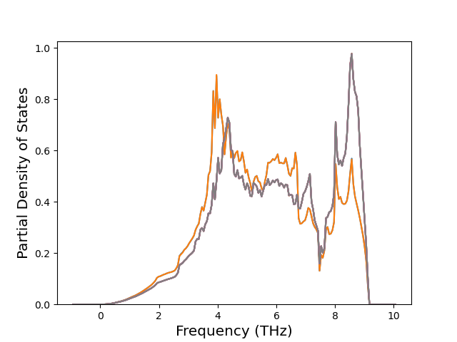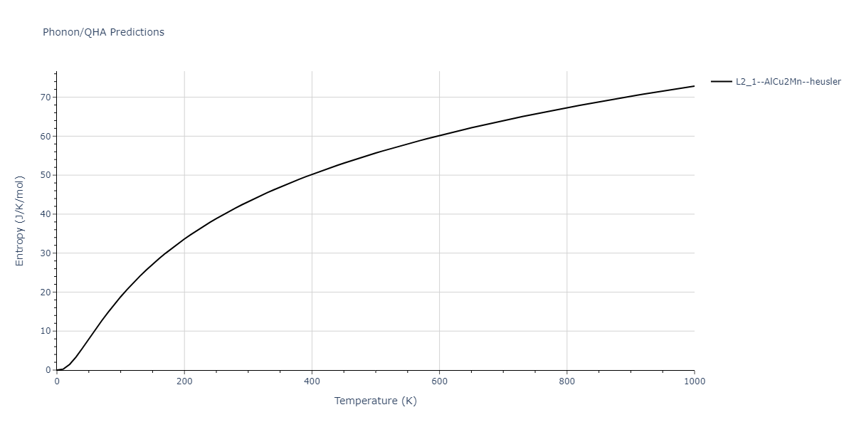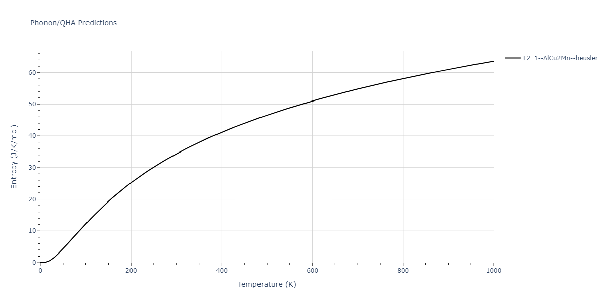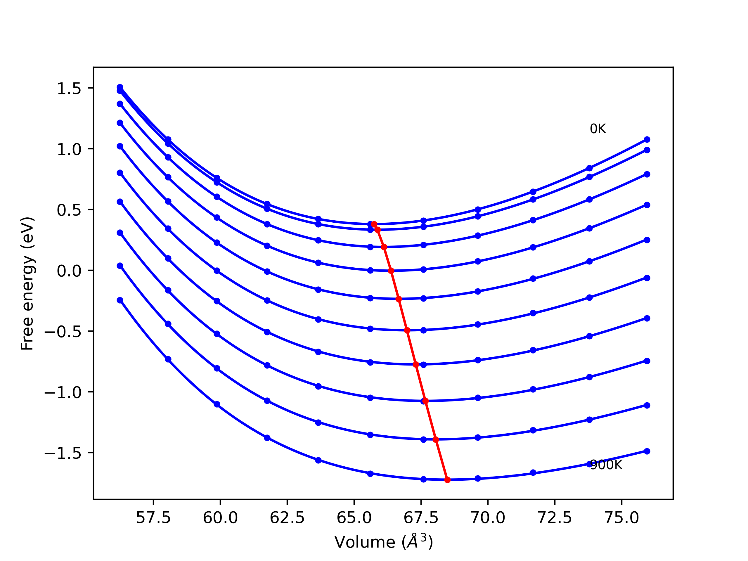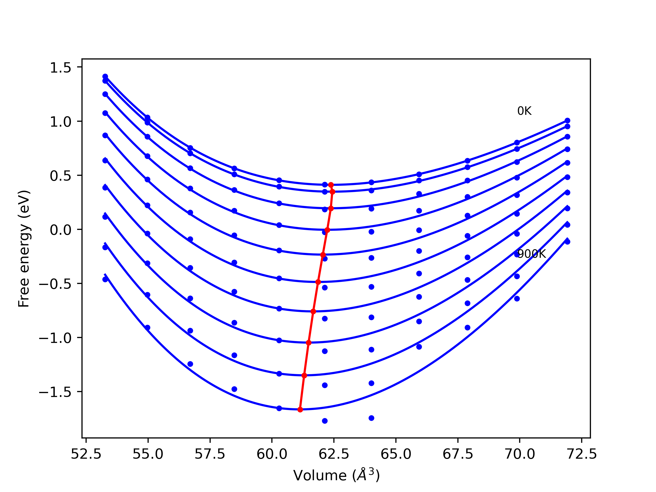 The Gibbs energies of the phases are estimated using thermodynamic integration between the interatomic potential in question and a simpler model with known Gibbs free energy values. For solids, the reference model is an Einstein solid, while for liquids it is the Uhlenbeck-Ford potential. Besides a short run at the start of the solid calculations to estimate Einstein model spring constants, the two calculations proceed similarly. Starting with the final relaxation configurations, the systems are stabilized for 25,000 steps. Then, over the next 50,000 steps the potential is swapped out for the reference potential. The system is then stabilized for another 25,000 steps with the reference model before a reverse swap of 50,000 steps is performed. The simulation ends with one final 25,000 step stabilization period. From the simulation, the irreversible work of transformation is estimated and used to compute the absolute Gibbs free energy of the target phase and potential relative to the reference potential. Entropy is estimated as the difference in enthalpy and Gibbs free energy and divided by temperature.