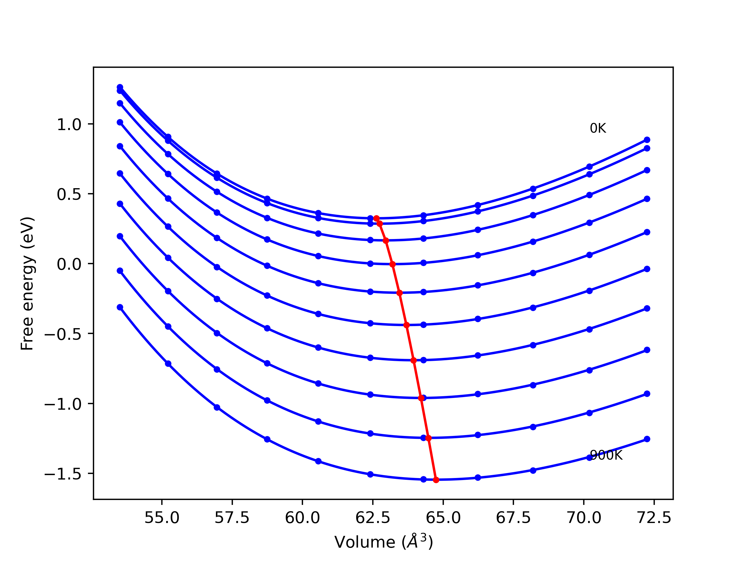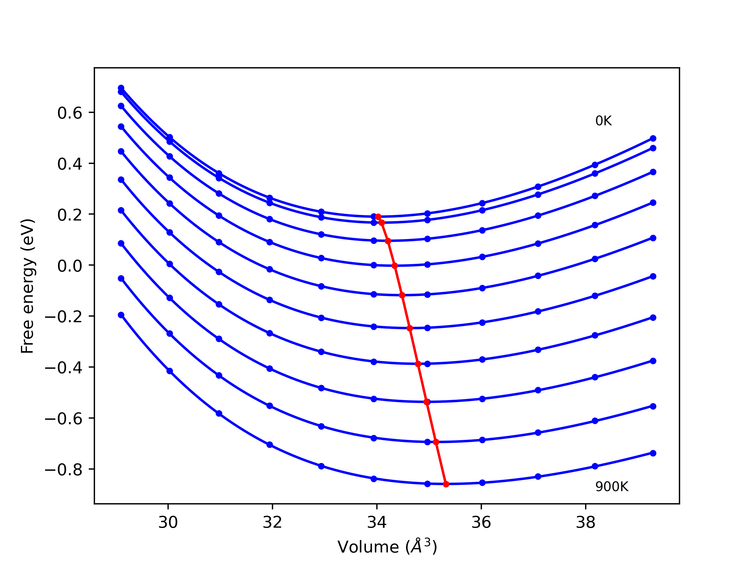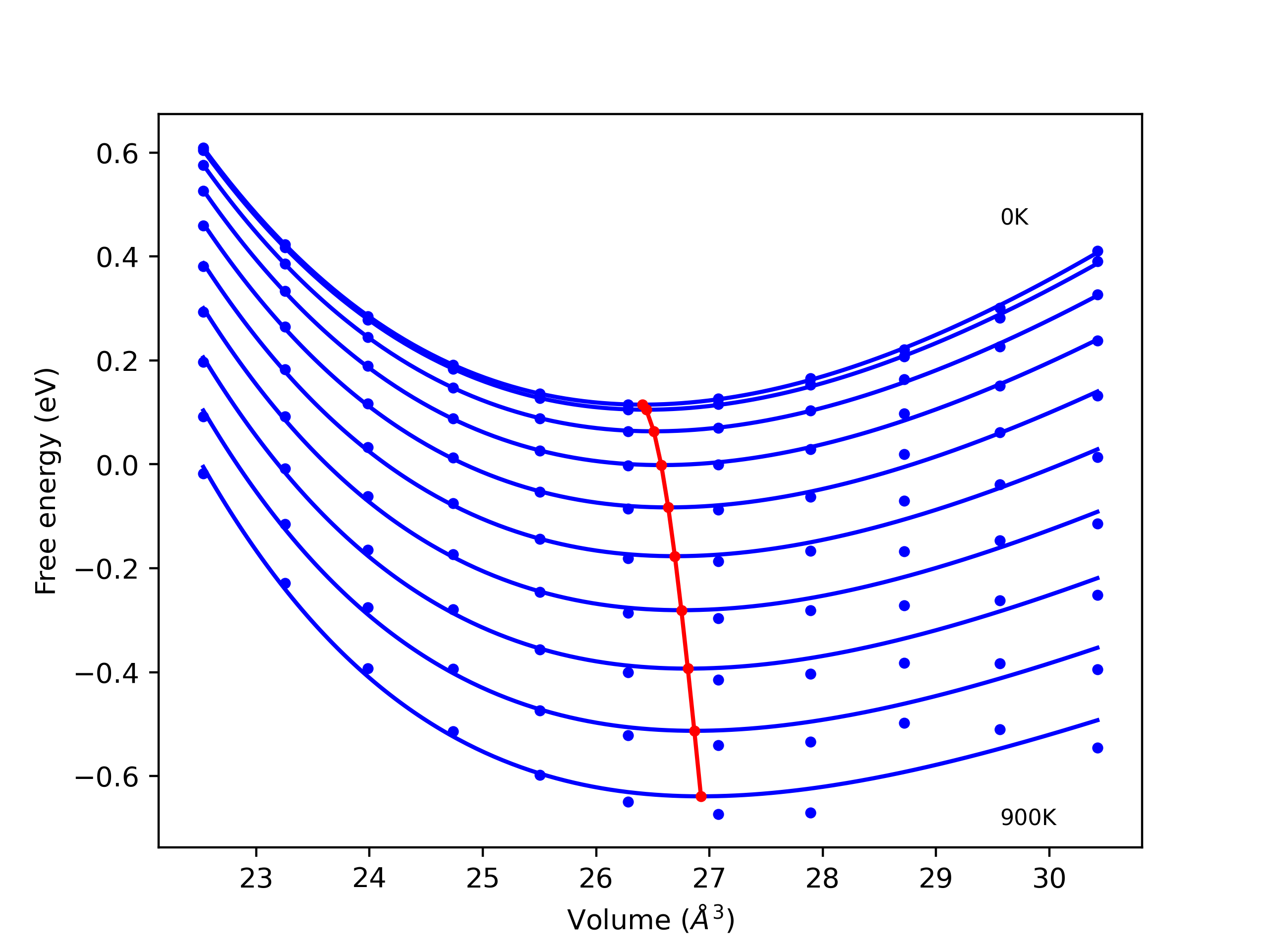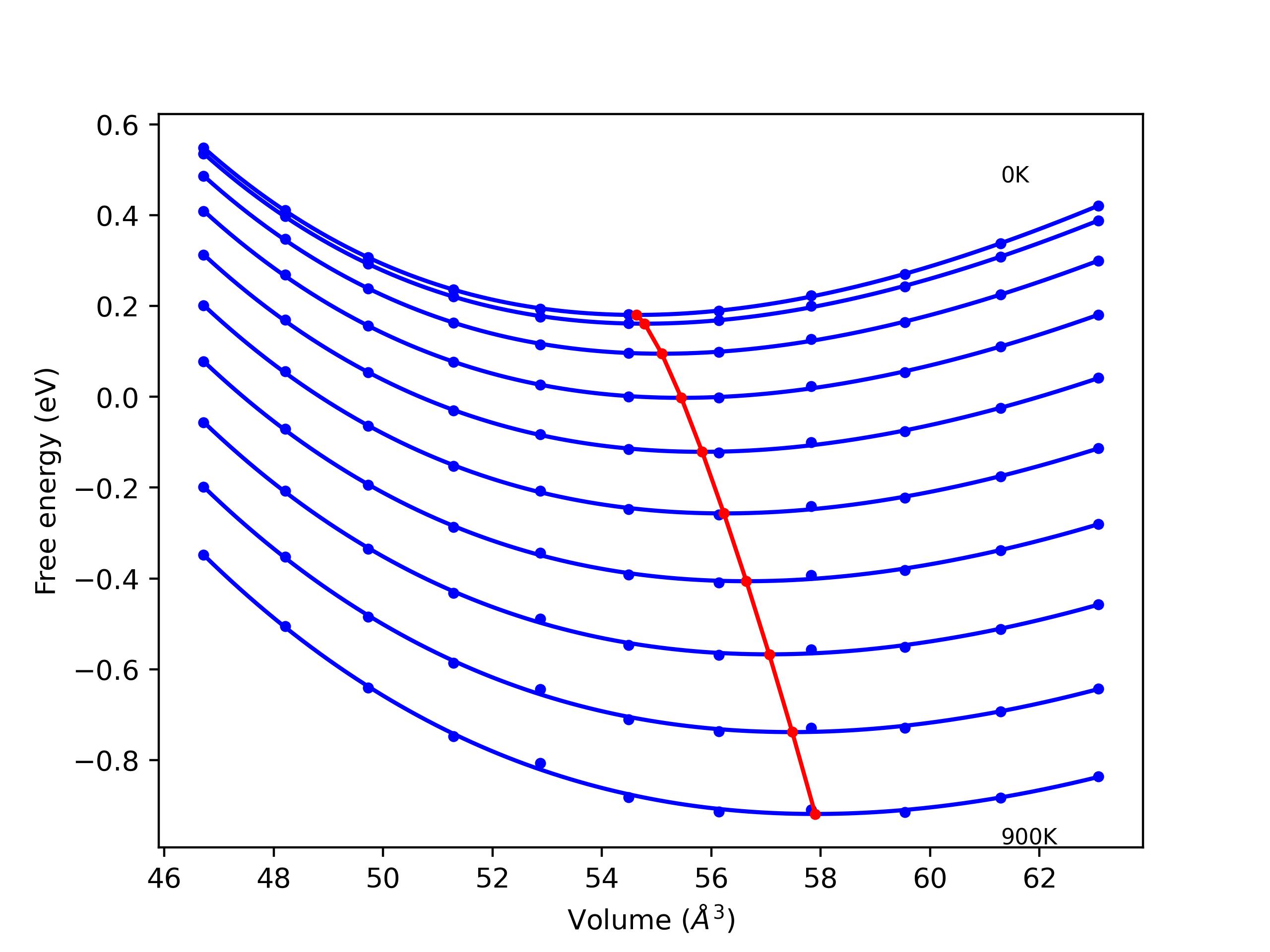 Plots of lattice and elastic constants are shown as a function of temperature. The 0K points were taken from the Crystal Structure Predictions and the Elastic Constants Predictions sections above for the unique crystal structures relaxed with the "dynamic" method. Starting from the 0 K relaxed crystal unit cells, supercell systems are created by replicating all three dimensions by the same multiplier to achieve at least 4000 atoms. The systems are then relaxed at 50 K and zero pressure using 1 million NPT steps. Lattice constants are estimated by averaging the measured box dimensions. Temperatures are iteratively increased by 50 K, with each subsequent relaxation calculation starting from the final atomic configuration at the previous temperature and relaxing for another 1 million steps.