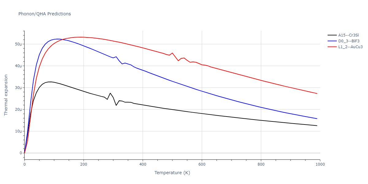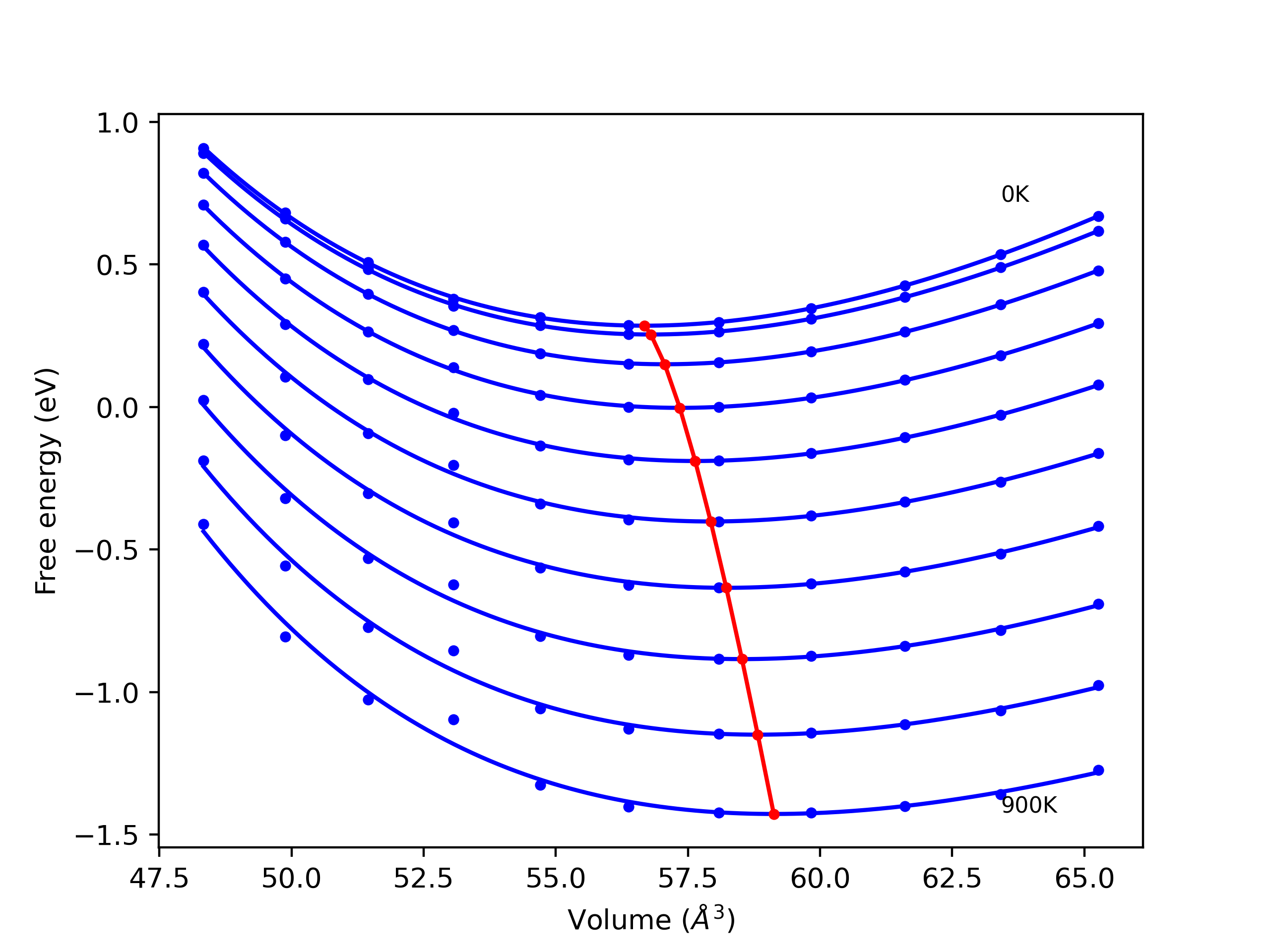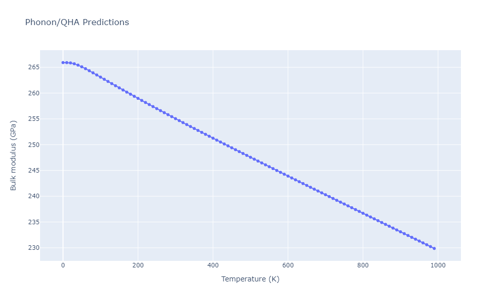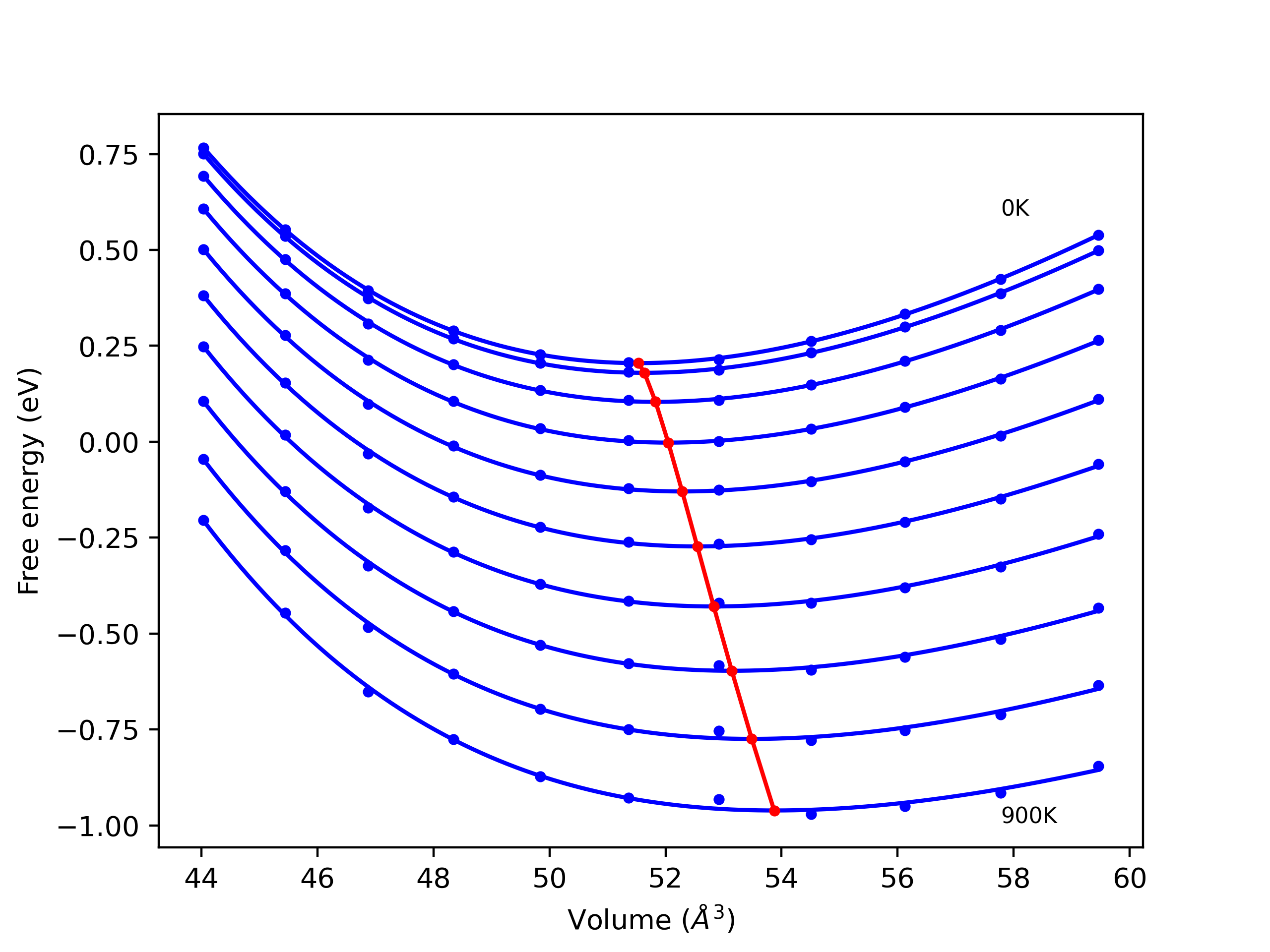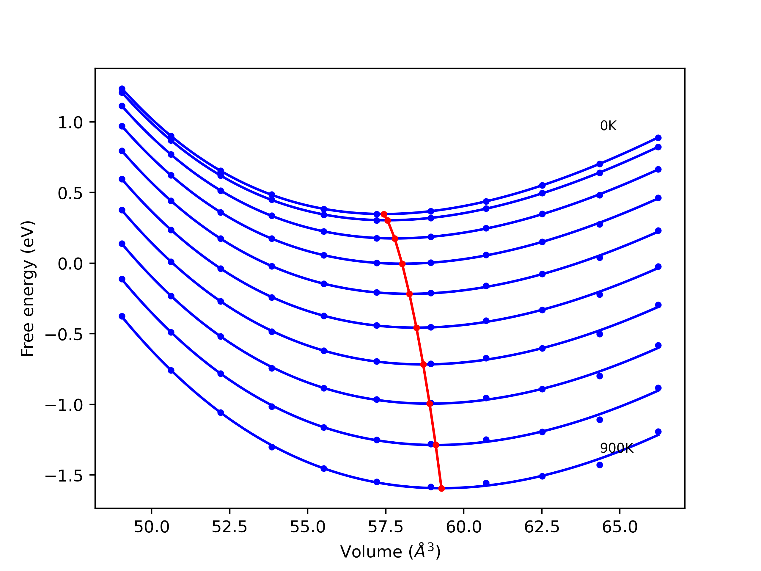 Plots of lattice and elastic constants are shown as a function of temperature. The 0K points were taken from the Crystal Structure Predictions and the Elastic Constants Predictions sections above for the unique crystal structures relaxed with the "dynamic" method. Starting from the 0 K relaxed crystal unit cells, supercell systems are created by replicating all three dimensions by the same multiplier to achieve at least 4000 atoms. The systems are then relaxed at 50 K and zero pressure using 1 million NPT steps. Lattice constants are estimated by averaging the measured box dimensions. Temperatures are iteratively increased by 50 K, with each subsequent relaxation calculation starting from the final atomic configuration at the previous temperature and relaxing for another 1 million steps.