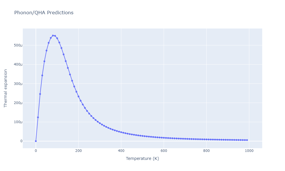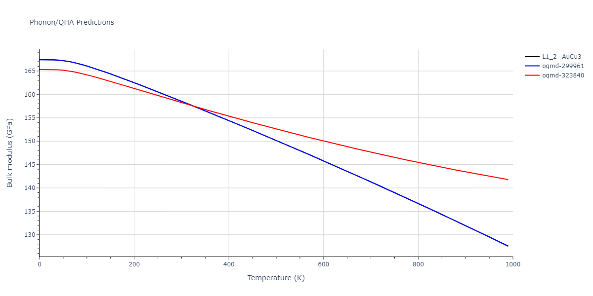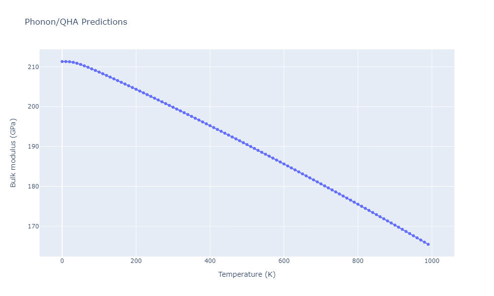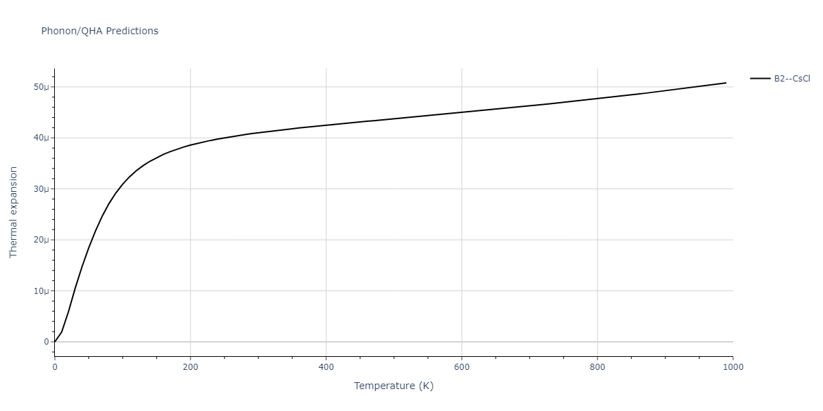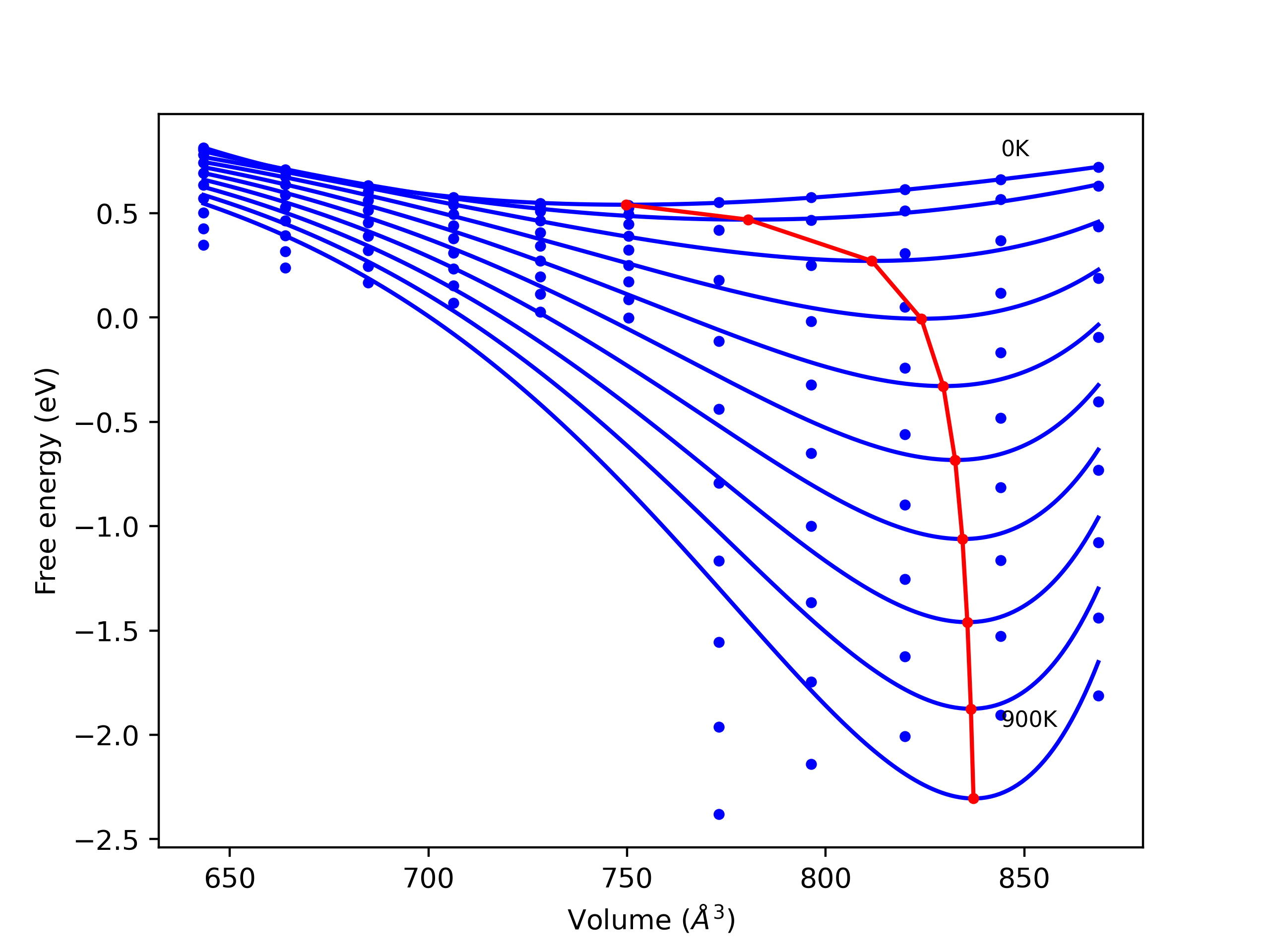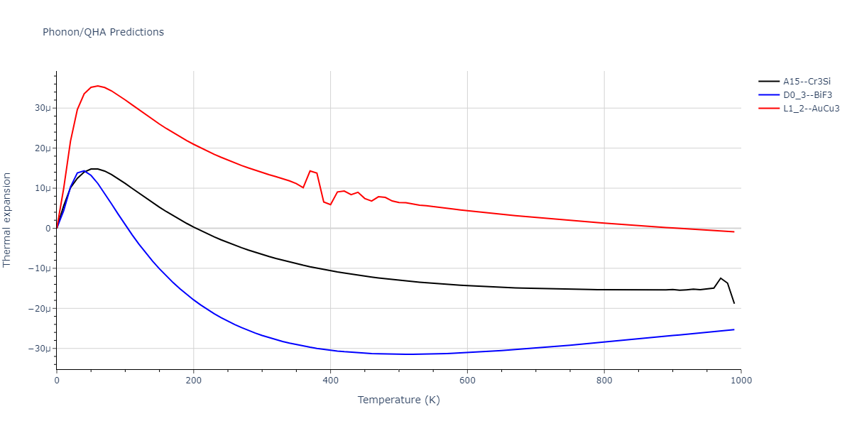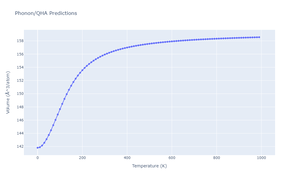 Plots of lattice and elastic constants are shown as a function of temperature. The 0K points were taken from the Crystal Structure Predictions and the Elastic Constants Predictions sections above for the unique crystal structures relaxed with the "dynamic" method. Starting from the 0 K relaxed crystal unit cells, supercell systems are created by replicating all three dimensions by the same multiplier to achieve at least 4000 atoms. The systems are then relaxed at 50 K and zero pressure using 1 million NPT steps. Lattice constants are estimated by averaging the measured box dimensions. Temperatures are iteratively increased by 50 K, with each subsequent relaxation calculation starting from the final atomic configuration at the previous temperature and relaxing for another 1 million steps.
