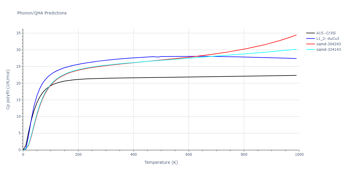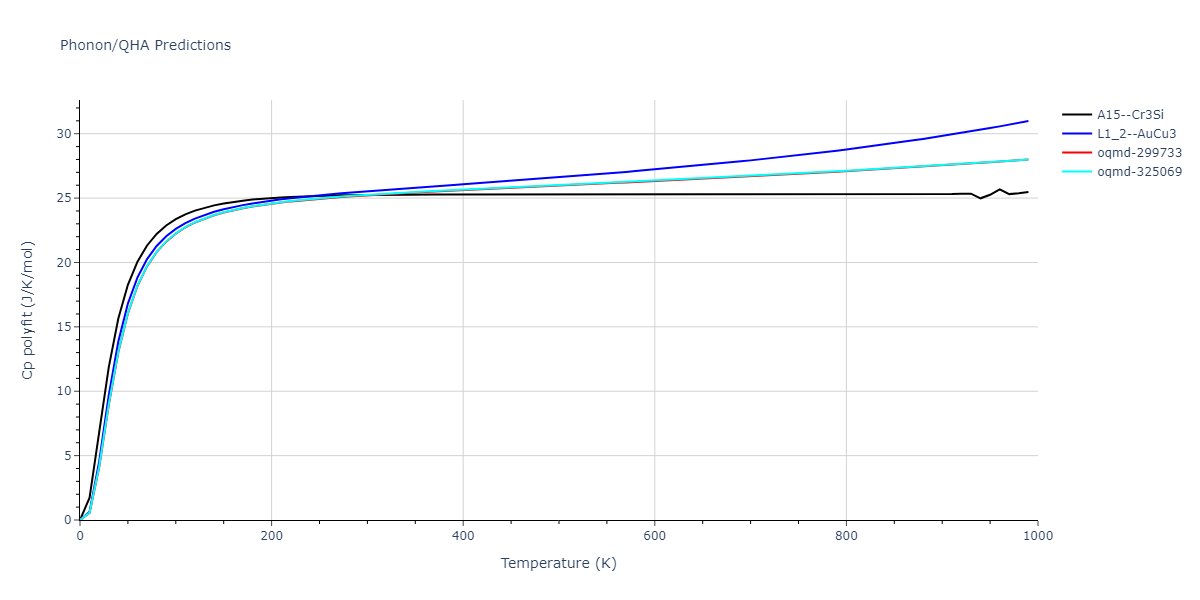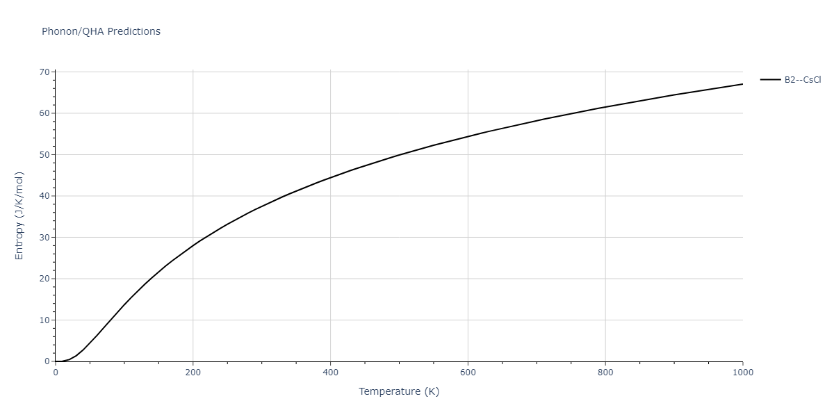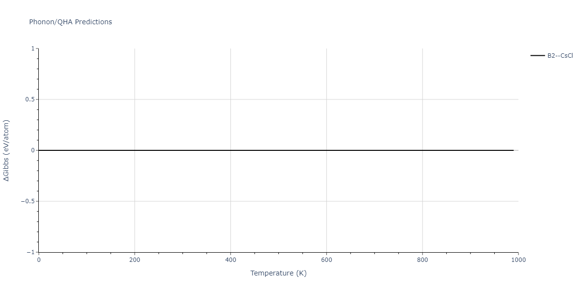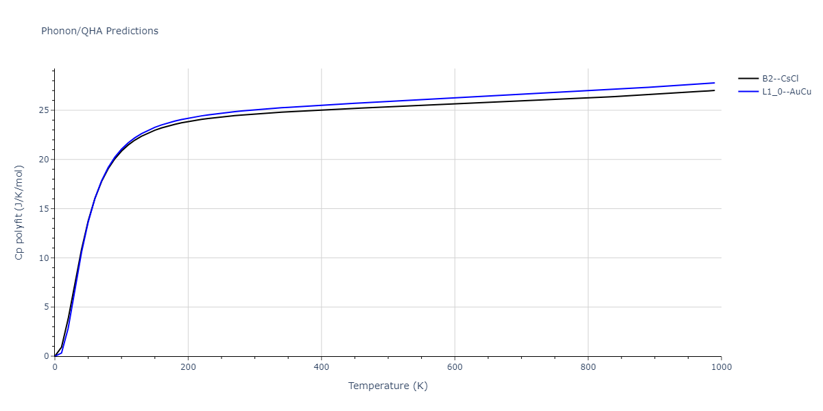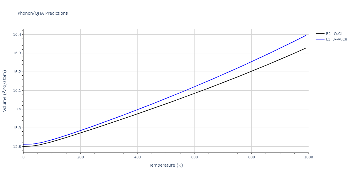 Plots of internal energy, Gibbs free energy, entropy, heat capacity and volume are shown here as a function of temperature for various crystal structures and liquid phases. The included crystal structures correspond to those in the Solid Structures vs. Temperature section, and the liquid phases to those in the Liquid Properties section. Internal energy and volume are taken from the associated structure relaxations mentioned in those previous sections. Constant pressure heat capacity is estimated using 3-point numerical derivatives of enthalpy versus temperature. Note that since all simulations done here are at 0 pressure, internal energy and enthalpy are equivalent.