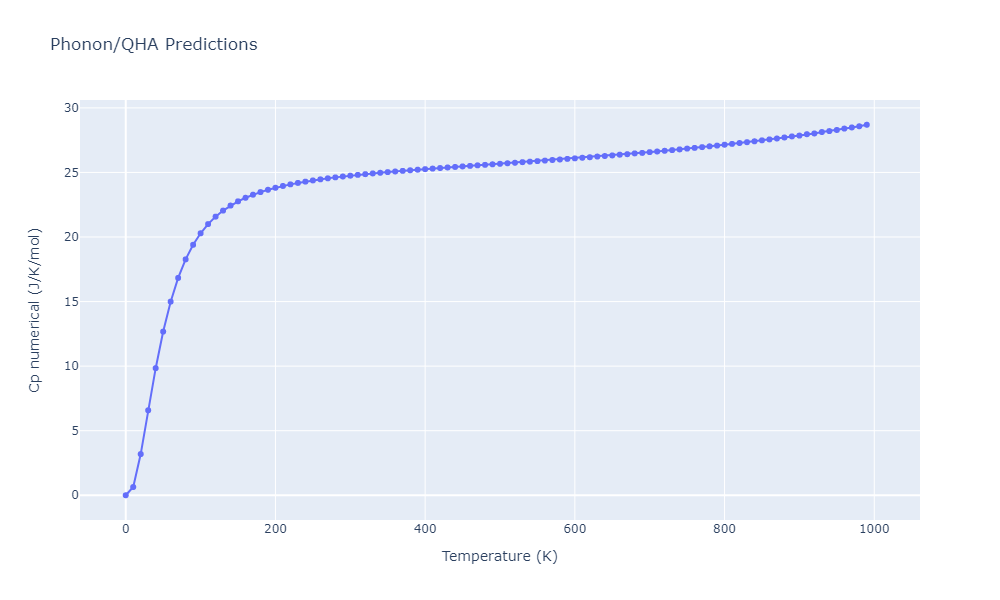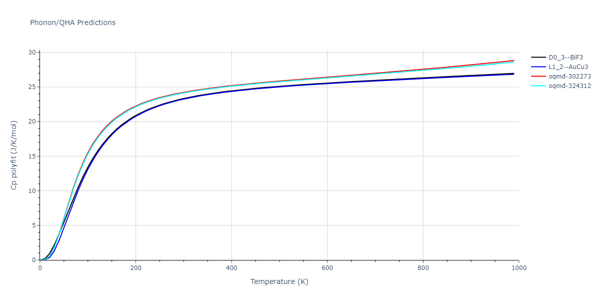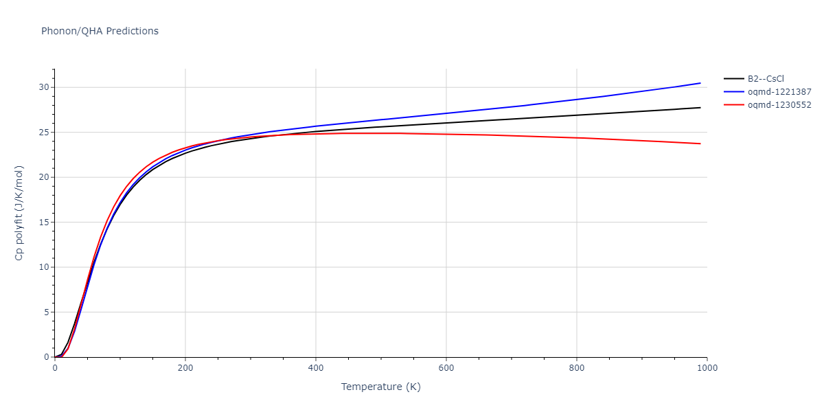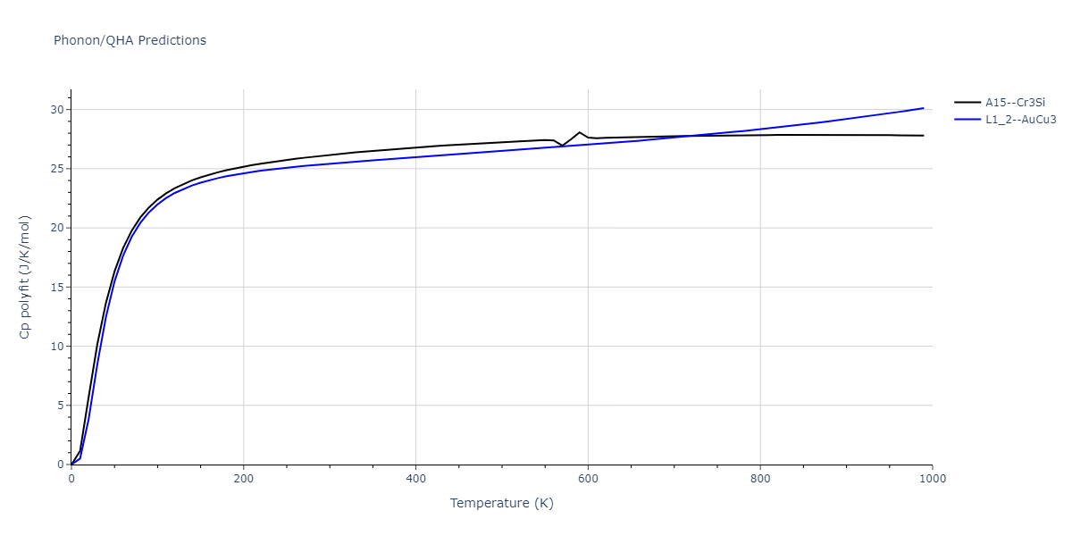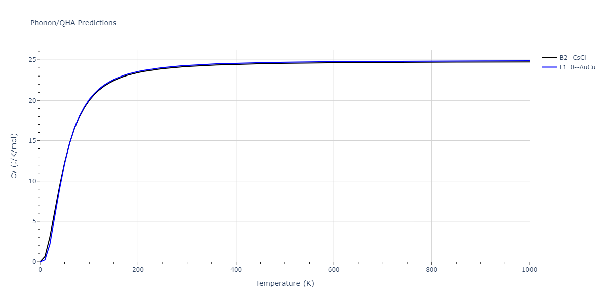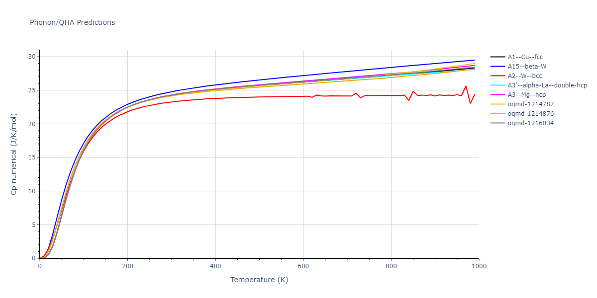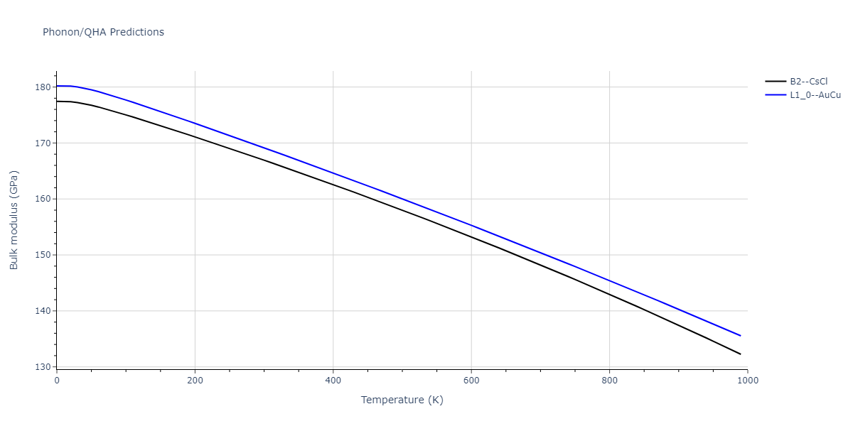 Plots of internal energy, Gibbs free energy, entropy, heat capacity and volume are shown here as a function of temperature for various crystal structures and liquid phases. The included crystal structures correspond to those in the Solid Structures vs. Temperature section, and the liquid phases to those in the Liquid Properties section. Internal energy and volume are taken from the associated structure relaxations mentioned in those previous sections. Constant pressure heat capacity is estimated using 3-point numerical derivatives of enthalpy versus temperature. Note that since all simulations done here are at 0 pressure, internal energy and enthalpy are equivalent.