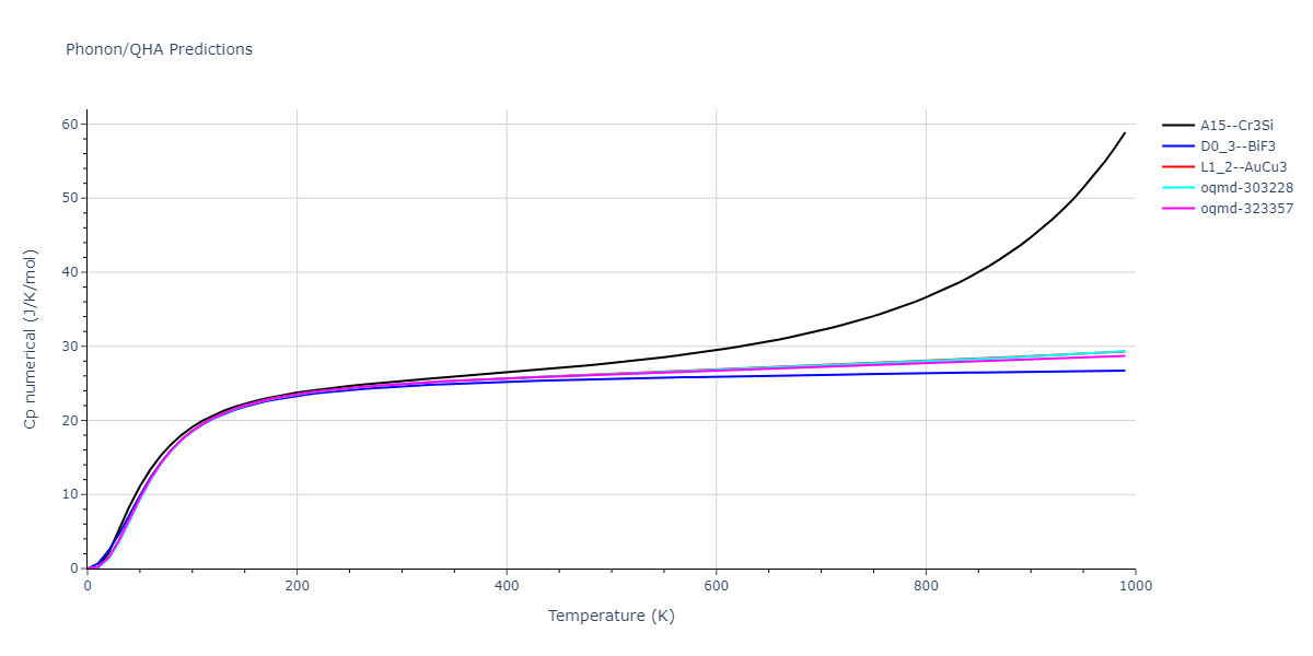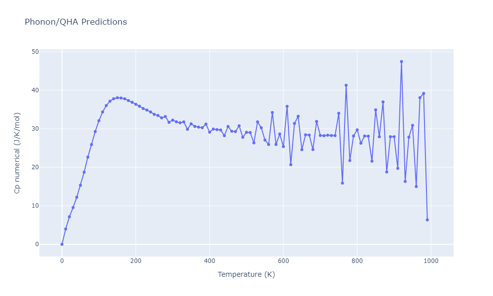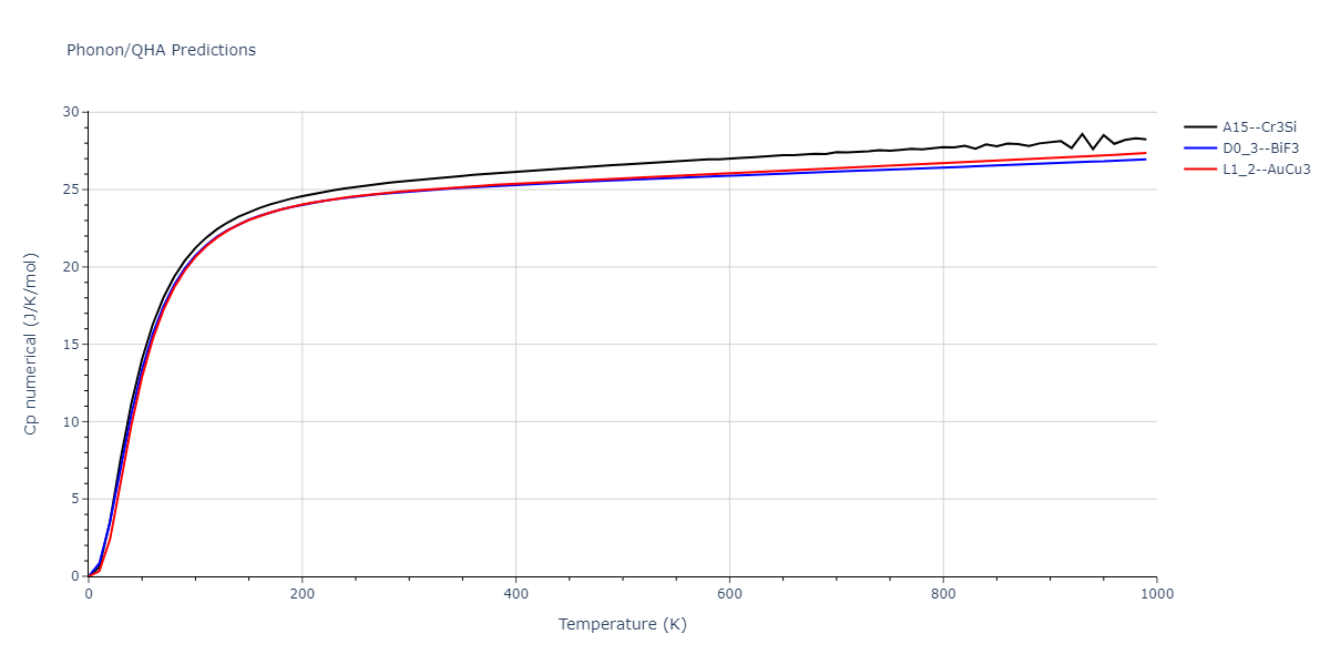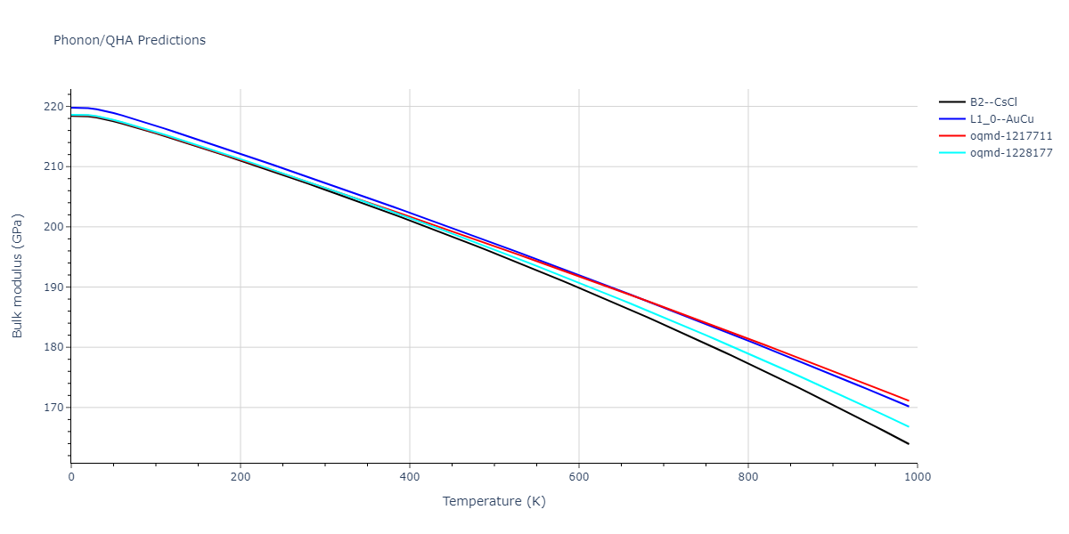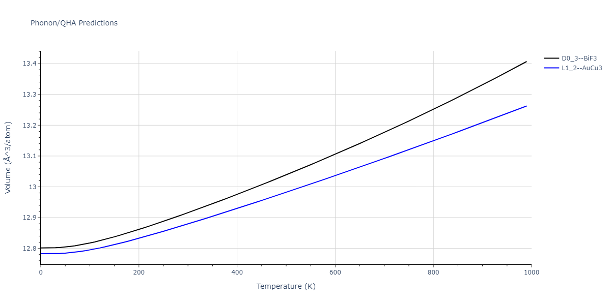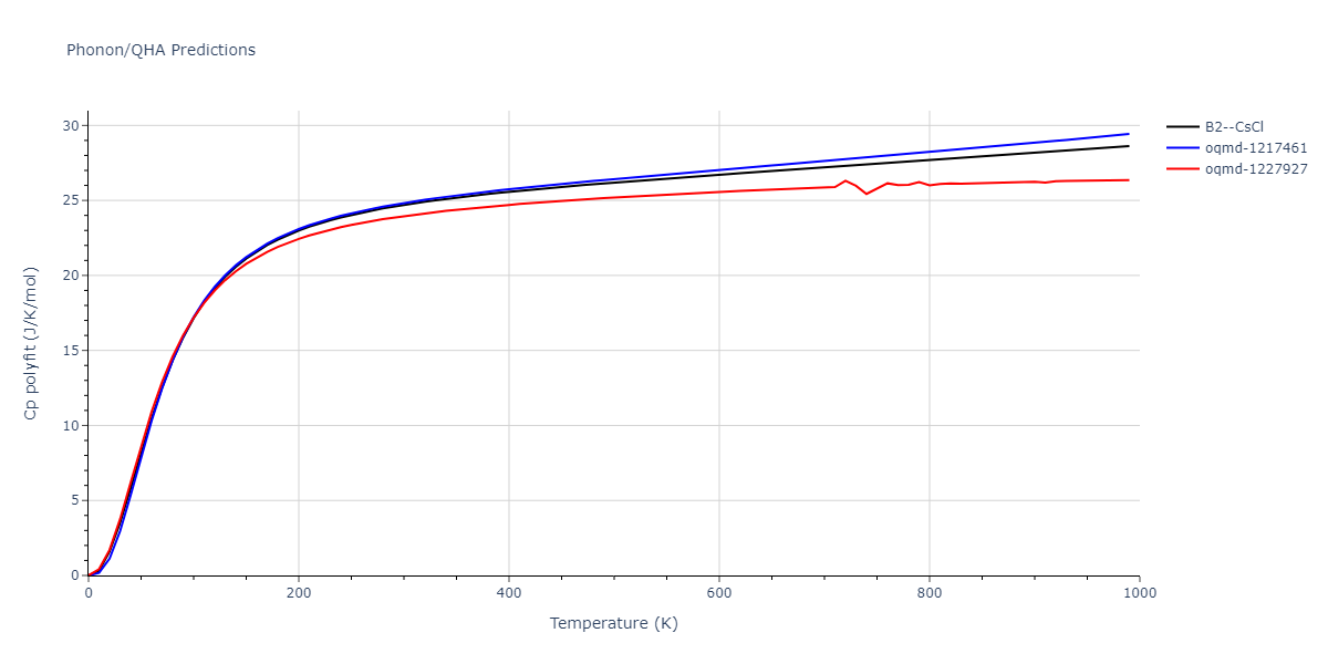 Plots of internal energy, Gibbs free energy, entropy, heat capacity and volume are shown here as a function of temperature for various crystal structures and liquid phases. The included crystal structures correspond to those in the Solid Structures vs. Temperature section, and the liquid phases to those in the Liquid Properties section. Internal energy and volume are taken from the associated structure relaxations mentioned in those previous sections. Constant pressure heat capacity is estimated using 3-point numerical derivatives of enthalpy versus temperature. Note that since all simulations done here are at 0 pressure, internal energy and enthalpy are equivalent.