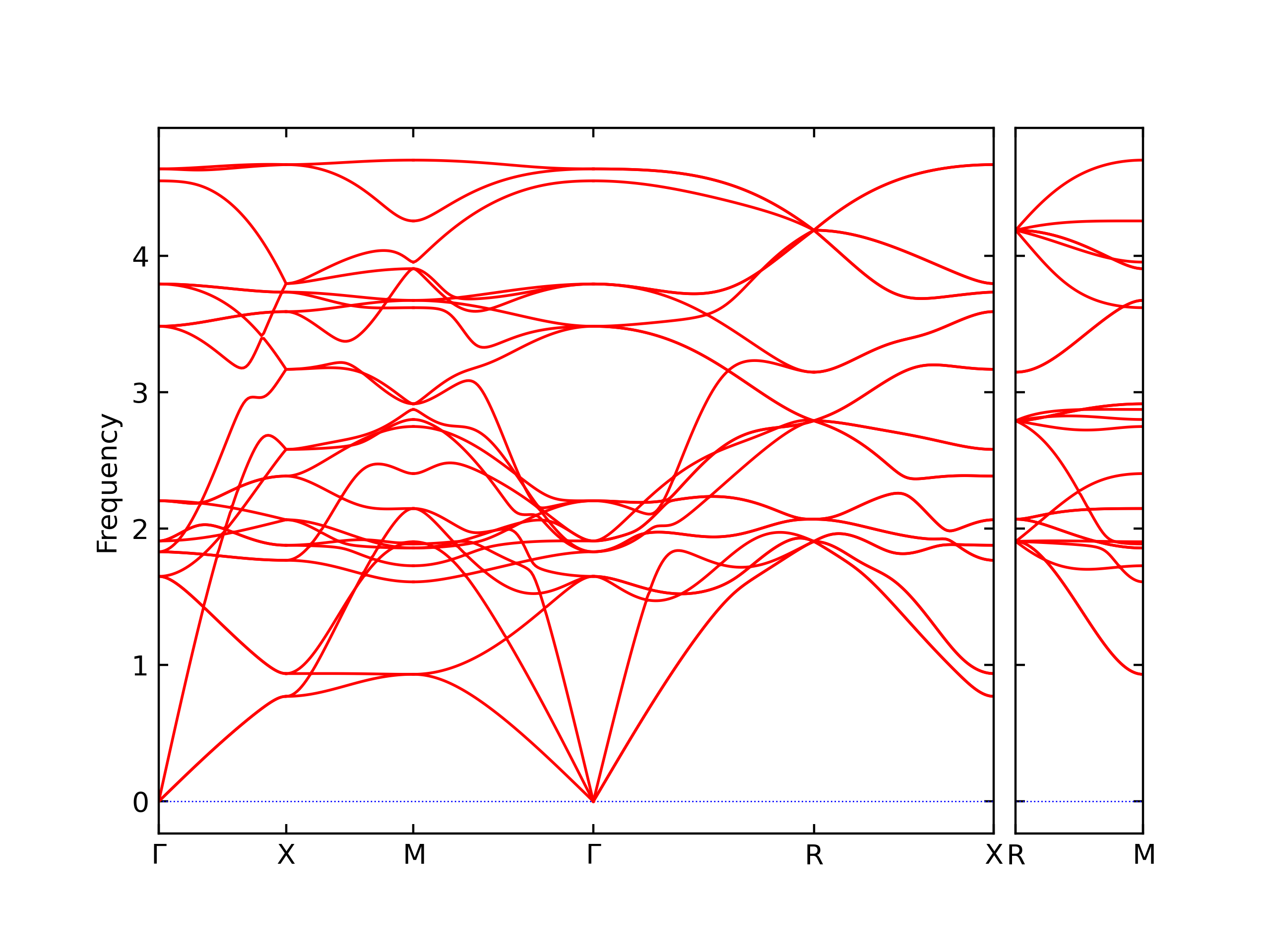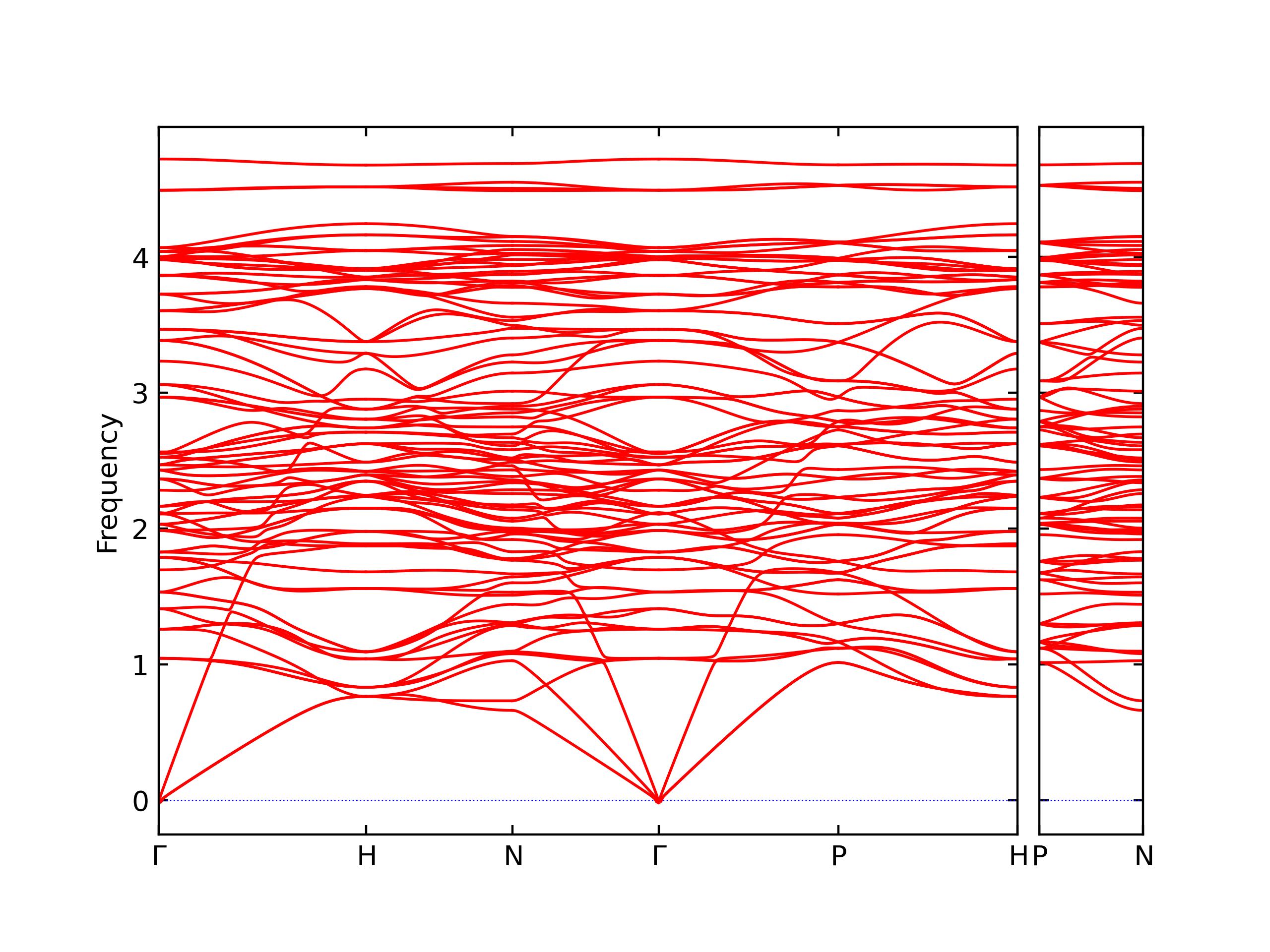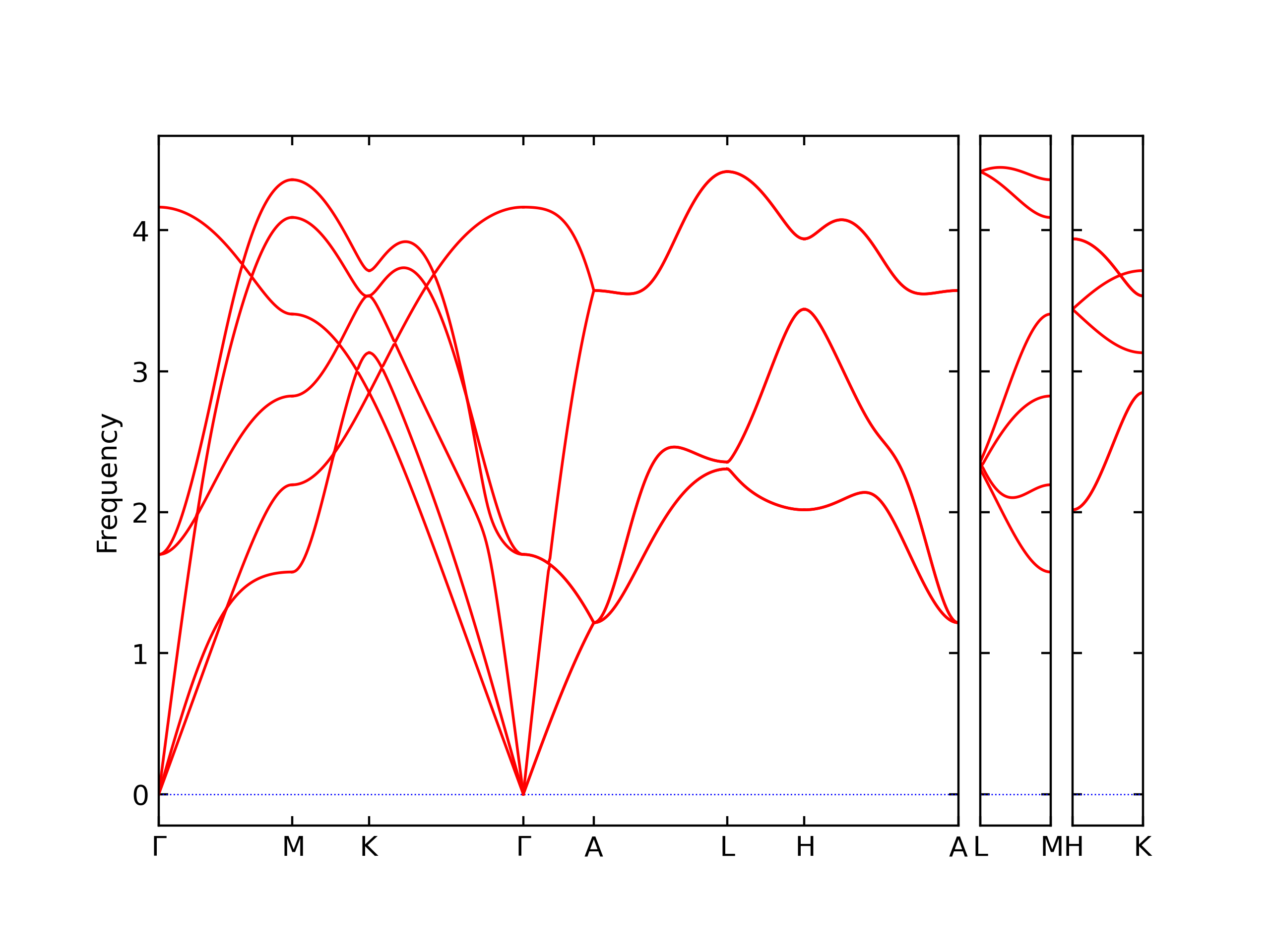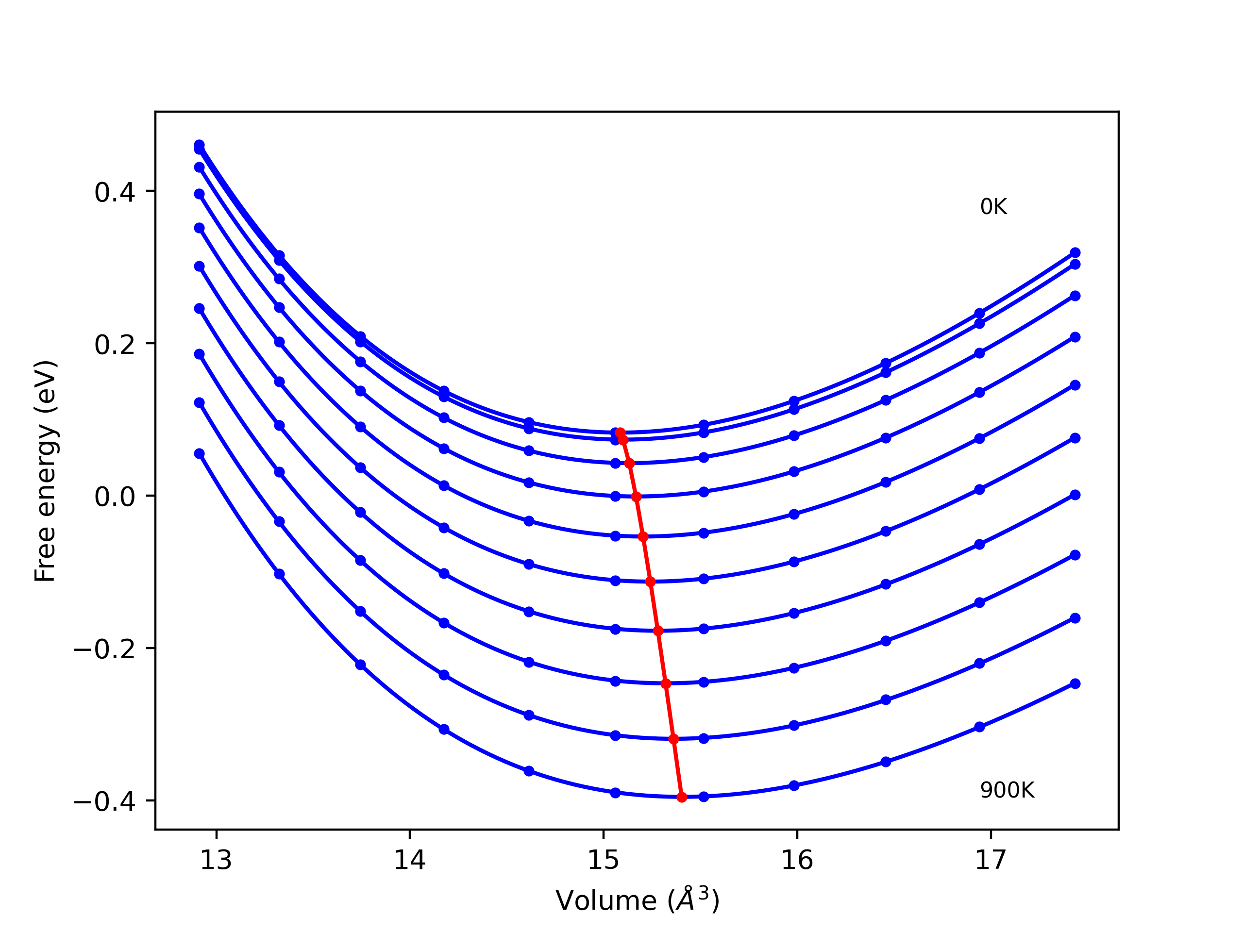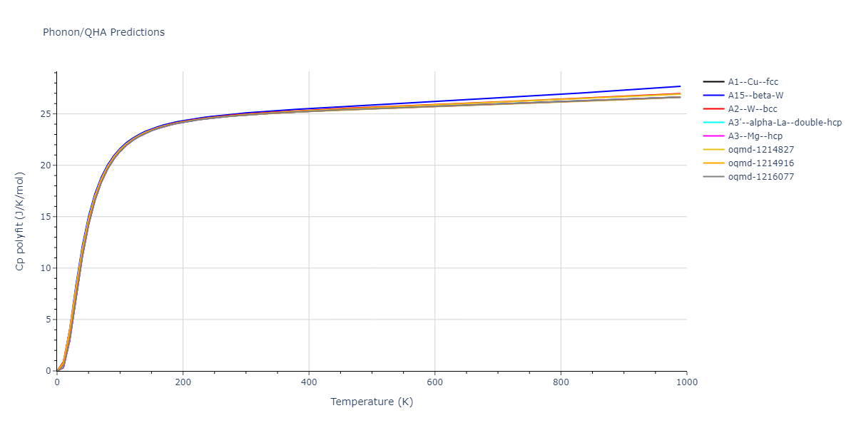 Phonon band structures and crystal properties estimated from quasi-harmonic approximation (QHA) calculations are displayed for select crystals. The calculations were performed using phonopy and LAMMPS. For the phonon calculations, 3x3 supercells of the potential-specific relaxed crystals were used. The QHA calculations were based on 11 strain states ranging from -0.05 to 0.05.