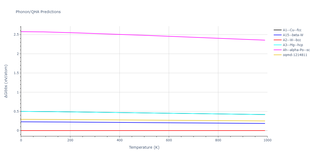 Phonon band structures and crystal properties estimated from quasi-harmonic approximation (QHA) calculations are displayed for select crystals. The calculations were performed using phonopy and LAMMPS. For the phonon calculations, 3x3 supercells of the potential-specific relaxed crystals were used. The QHA calculations were based on 11 strain states ranging from -0.05 to 0.05.