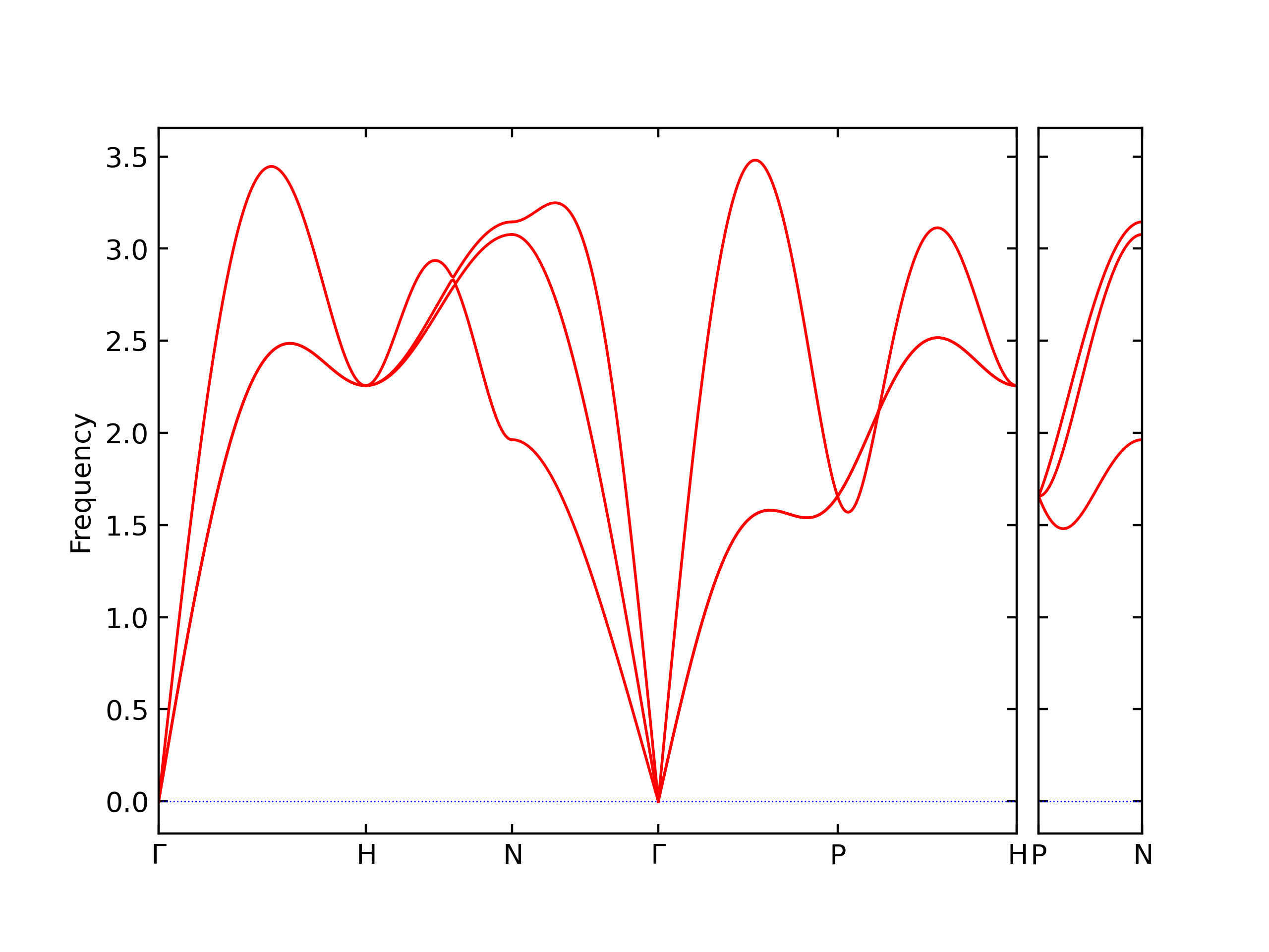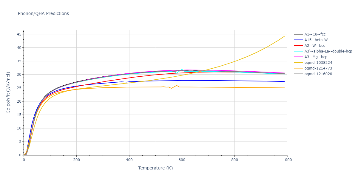 Phonon band structures and crystal properties estimated from quasi-harmonic approximation (QHA) calculations are displayed for select crystals. The calculations were performed using phonopy and LAMMPS. For the phonon calculations, 3x3 supercells of the potential-specific relaxed crystals were used. The QHA calculations were based on 11 strain states ranging from -0.05 to 0.05.