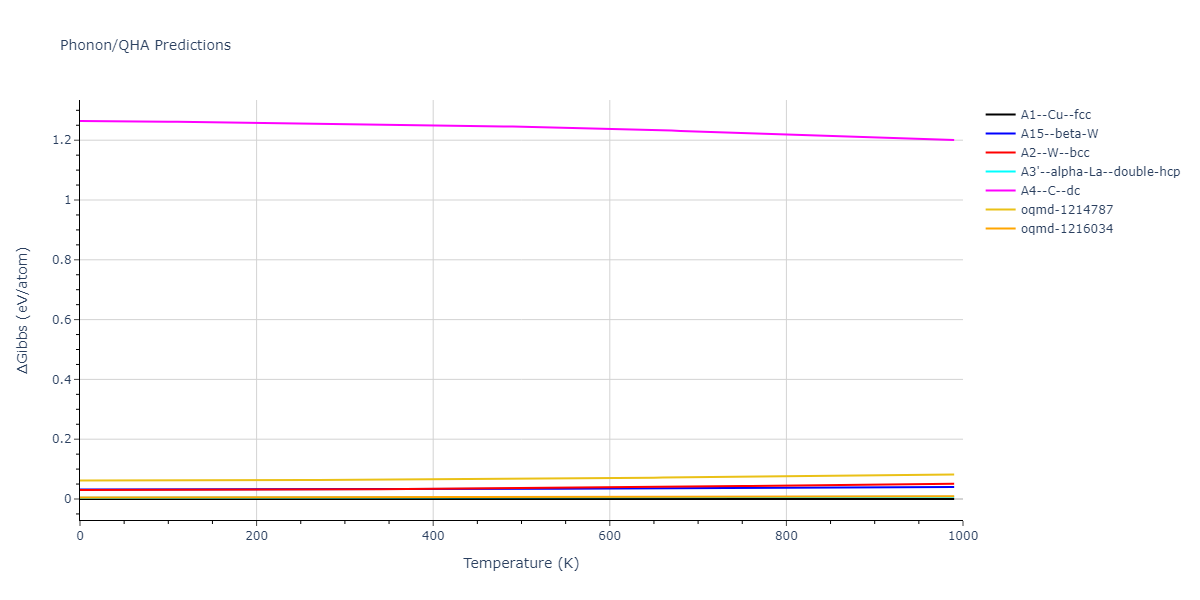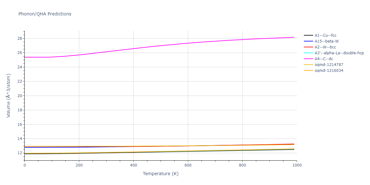 Phonon band structures and crystal properties estimated from quasi-harmonic approximation (QHA) calculations are displayed for select crystals. The calculations were performed using phonopy and LAMMPS. For the phonon calculations, 3x3 supercells of the potential-specific relaxed crystals were used. The QHA calculations were based on 11 strain states ranging from -0.05 to 0.05.