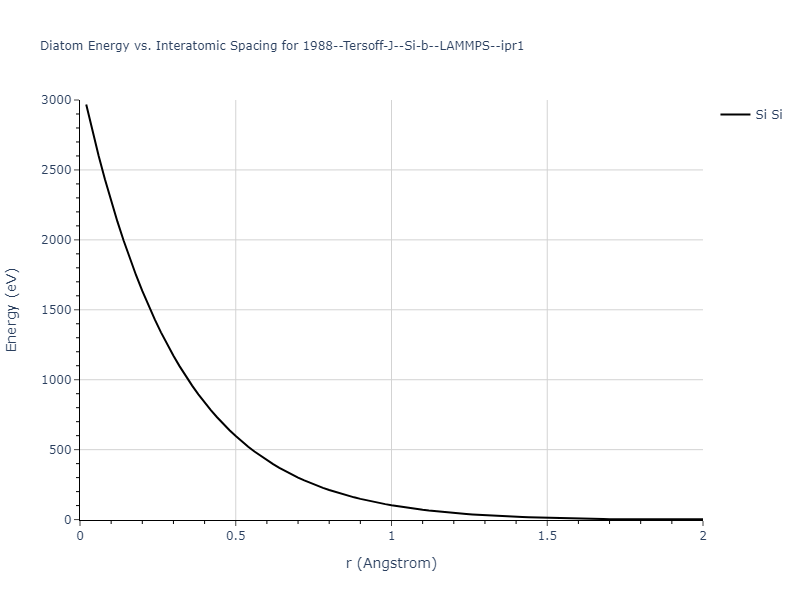 Plots of the potential energy vs interatomic spacing, r, are shown below for all diatom sets associated with the interatomic potential. This calculation provides insights into the functional form of the potential's two-body interactions. A system consisting of only two atoms is created, and the potential energy is evaluated for the atoms separated by 0.02 Å <= r <= 6.0> Å in intervals of 0.02 Å. Two plots are shown: one for the "standard" interaction distance range, and one for small values of r. The small r plot is useful for determining whether the potential is suitable for radiation studies.