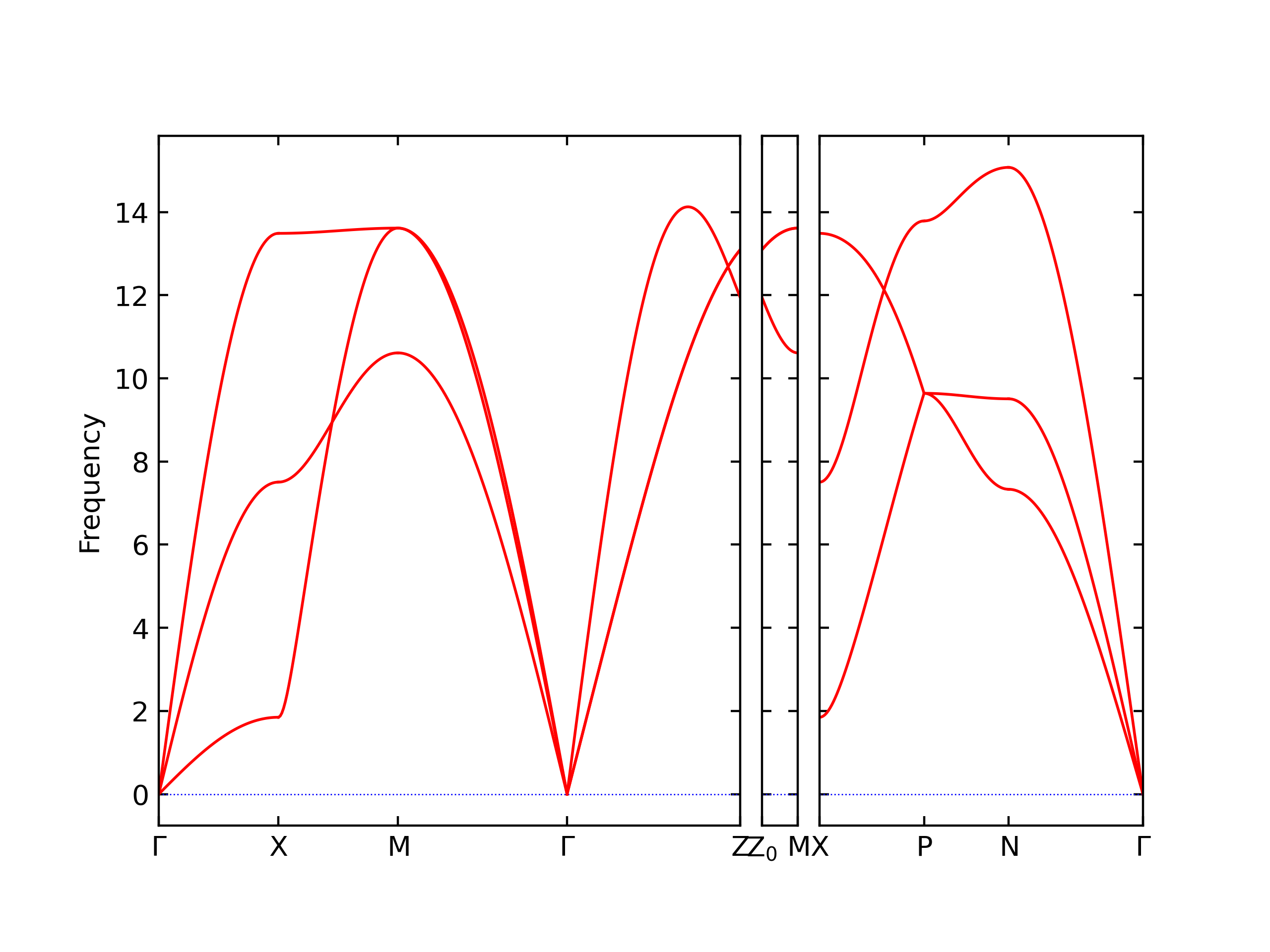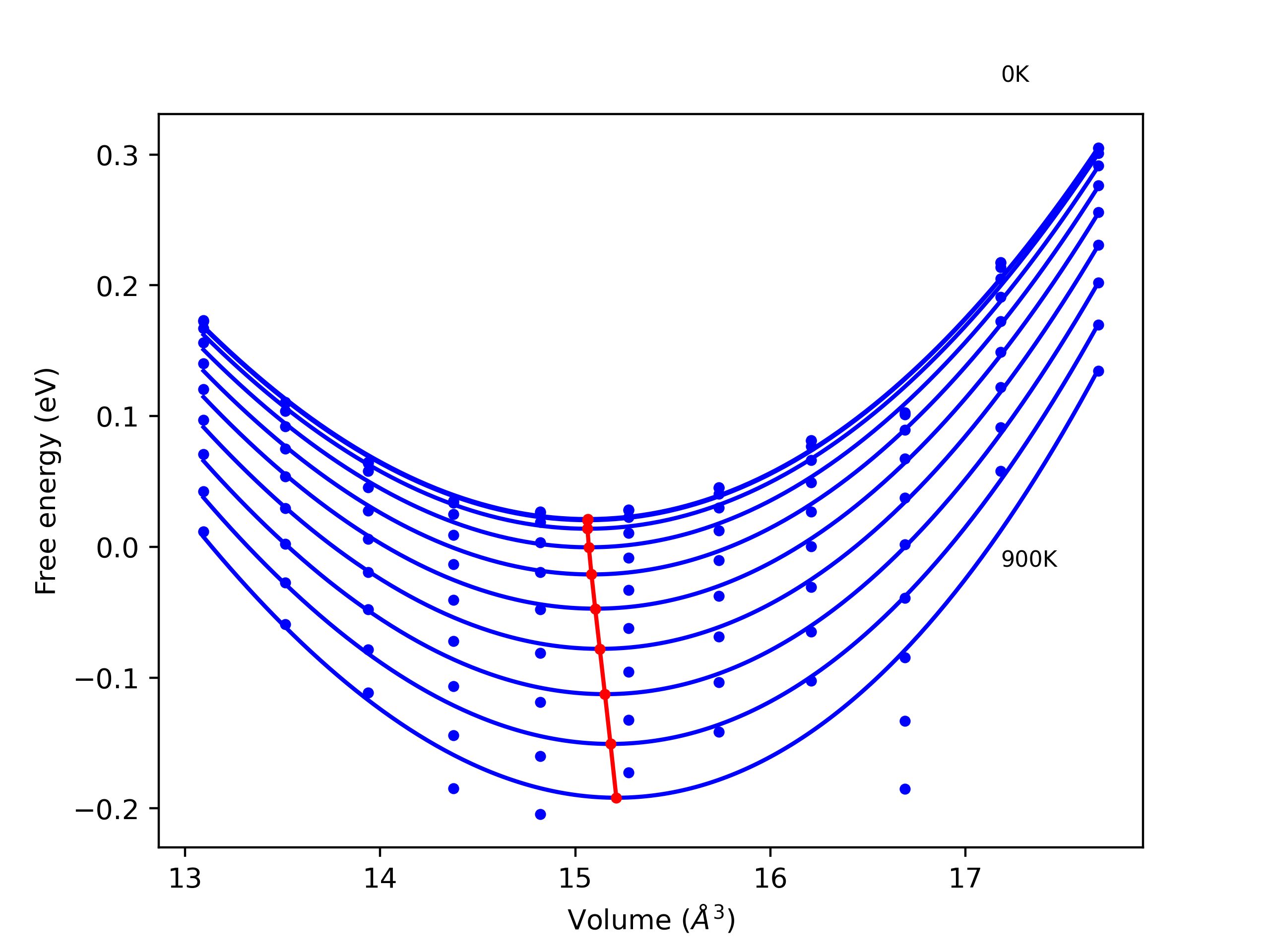 Phonon band structures and crystal properties estimated from quasi-harmonic approximation (QHA) calculations are displayed for select crystals. The calculations were performed using phonopy and LAMMPS. For the phonon calculations, 3x3 supercells of the potential-specific relaxed crystals were used. The QHA calculations were based on 11 strain states ranging from -0.05 to 0.05.