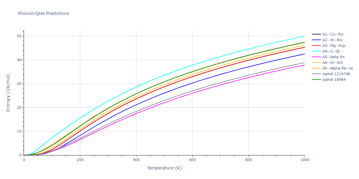 The Gibbs energies of the phases are estimated using thermodynamic integration between the interatomic potential in question and a simpler model with known Gibbs free energy values. For solids, the reference model is an Einstein solid, while for liquids it is the Uhlenbeck-Ford potential. Besides a short run at the start of the solid calculations to estimate Einstein model spring constants, the two calculations proceed similarly. Starting with the final relaxation configurations, the systems are stabilized for 25,000 steps. Then, over the next 50,000 steps the potential is swapped out for the reference potential. The system is then stabilized for another 25,000 steps with the reference model before a reverse swap of 50,000 steps is performed. The simulation ends with one final 25,000 step stabilization period. From the simulation, the irreversible work of transformation is estimated and used to compute the absolute Gibbs free energy of the target phase and potential relative to the reference potential. Entropy is estimated as the difference in enthalpy and Gibbs free energy and divided by temperature.