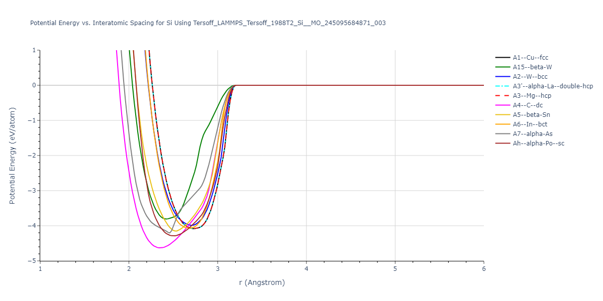 Plots of potential energy vs interatomic spacing, r, are shown below for a number of crystal structures. The structures are generated based on the ideal atomic positions and b/a and c/a lattice parameter ratios for a given crystal prototype. The size of the system is then uniformly scaled, and the energy calculated without relaxing the system. To obtain these plots, values of r are evaluated every 0.02 Å up to 6 Å.