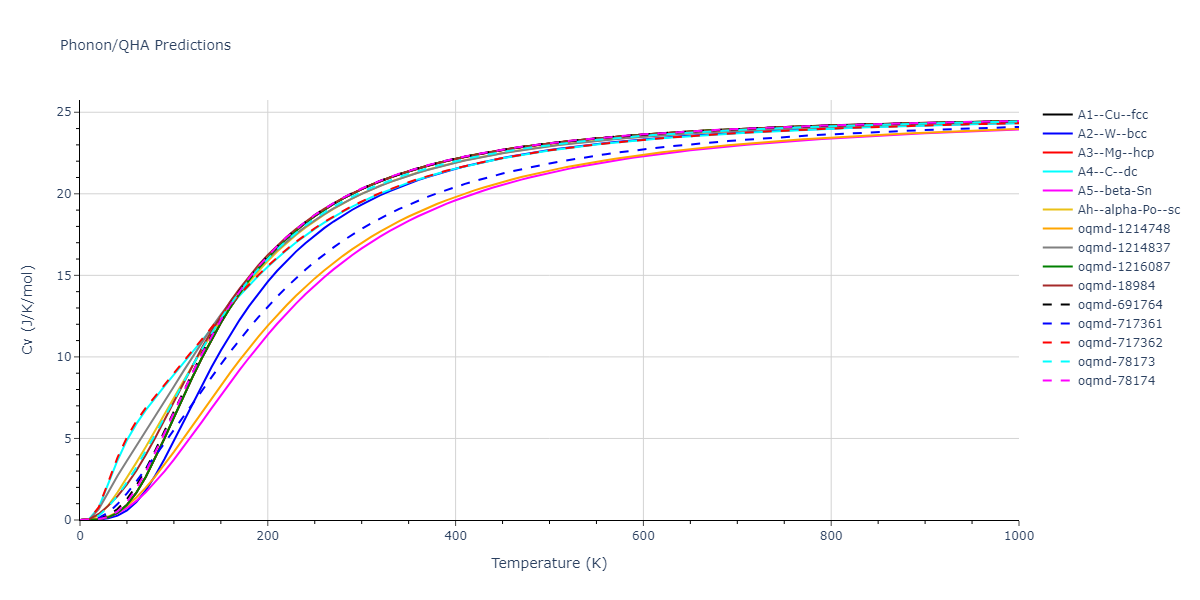Phonon band structures and crystal properties estimated from quasi-harmonic approximation (QHA) calculations are displayed for select crystals. The calculations were performed using phonopy and LAMMPS. For the phonon calculations, 3x3 supercells of the potential-specific relaxed crystals were used. The QHA calculations were based on 11 strain states ranging from -0.05 to 0.05.