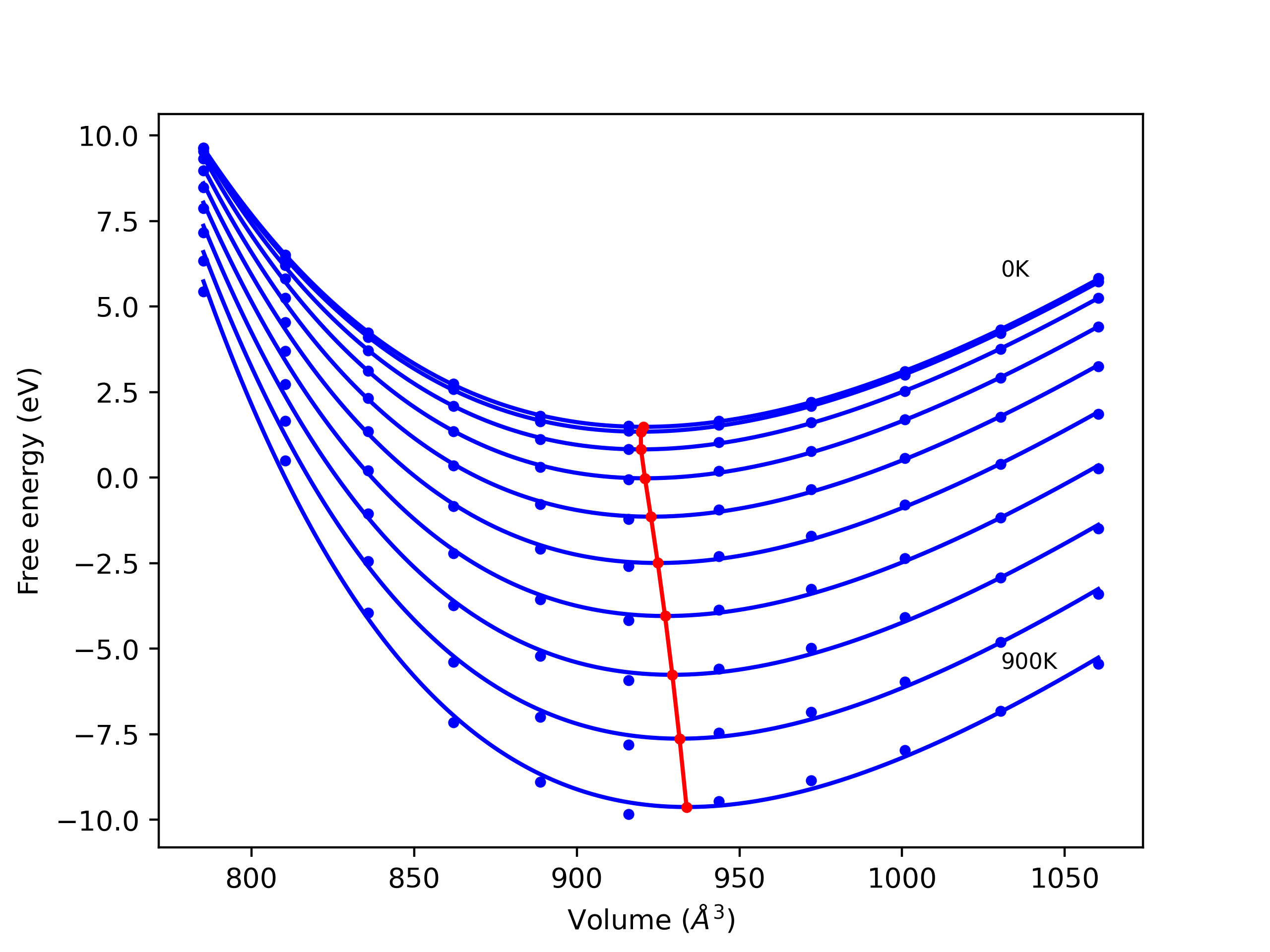 The Gibbs energies of the phases are estimated using thermodynamic integration between the interatomic potential in question and a simpler model with known Gibbs free energy values. For solids, the reference model is an Einstein solid, while for liquids it is the Uhlenbeck-Ford potential. Besides a short run at the start of the solid calculations to estimate Einstein model spring constants, the two calculations proceed similarly. Starting with the final relaxation configurations, the systems are stabilized for 25,000 steps. Then, over the next 50,000 steps the potential is swapped out for the reference potential. The system is then stabilized for another 25,000 steps with the reference model before a reverse swap of 50,000 steps is performed. The simulation ends with one final 25,000 step stabilization period. From the simulation, the irreversible work of transformation is estimated and used to compute the absolute Gibbs free energy of the target phase and potential relative to the reference potential. Entropy is estimated as the difference in enthalpy and Gibbs free energy and divided by temperature.