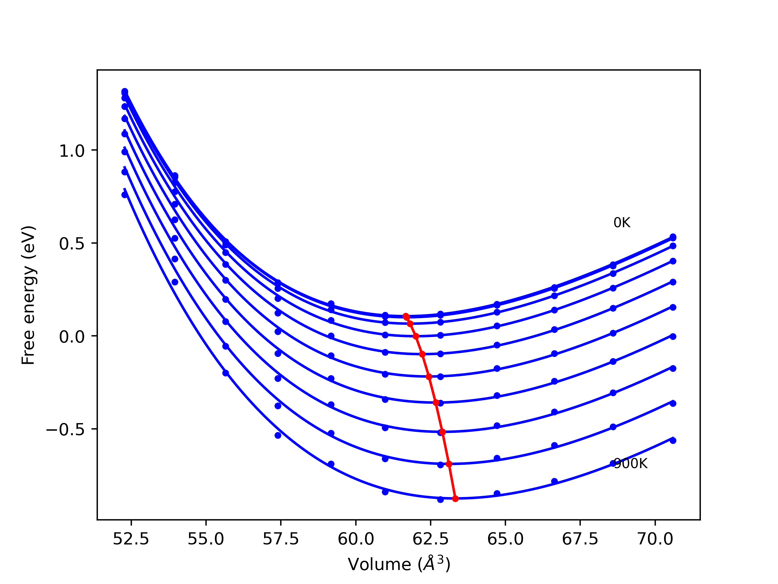 Plots of lattice and elastic constants are shown as a function of temperature. The 0K points were taken from the Crystal Structure Predictions and the Elastic Constants Predictions sections above for the unique crystal structures relaxed with the "dynamic" method. Starting from the 0 K relaxed crystal unit cells, supercell systems are created by replicating all three dimensions by the same multiplier to achieve at least 4000 atoms. The systems are then relaxed at 50 K and zero pressure using 1 million NPT steps. Lattice constants are estimated by averaging the measured box dimensions. Temperatures are iteratively increased by 50 K, with each subsequent relaxation calculation starting from the final atomic configuration at the previous temperature and relaxing for another 1 million steps.