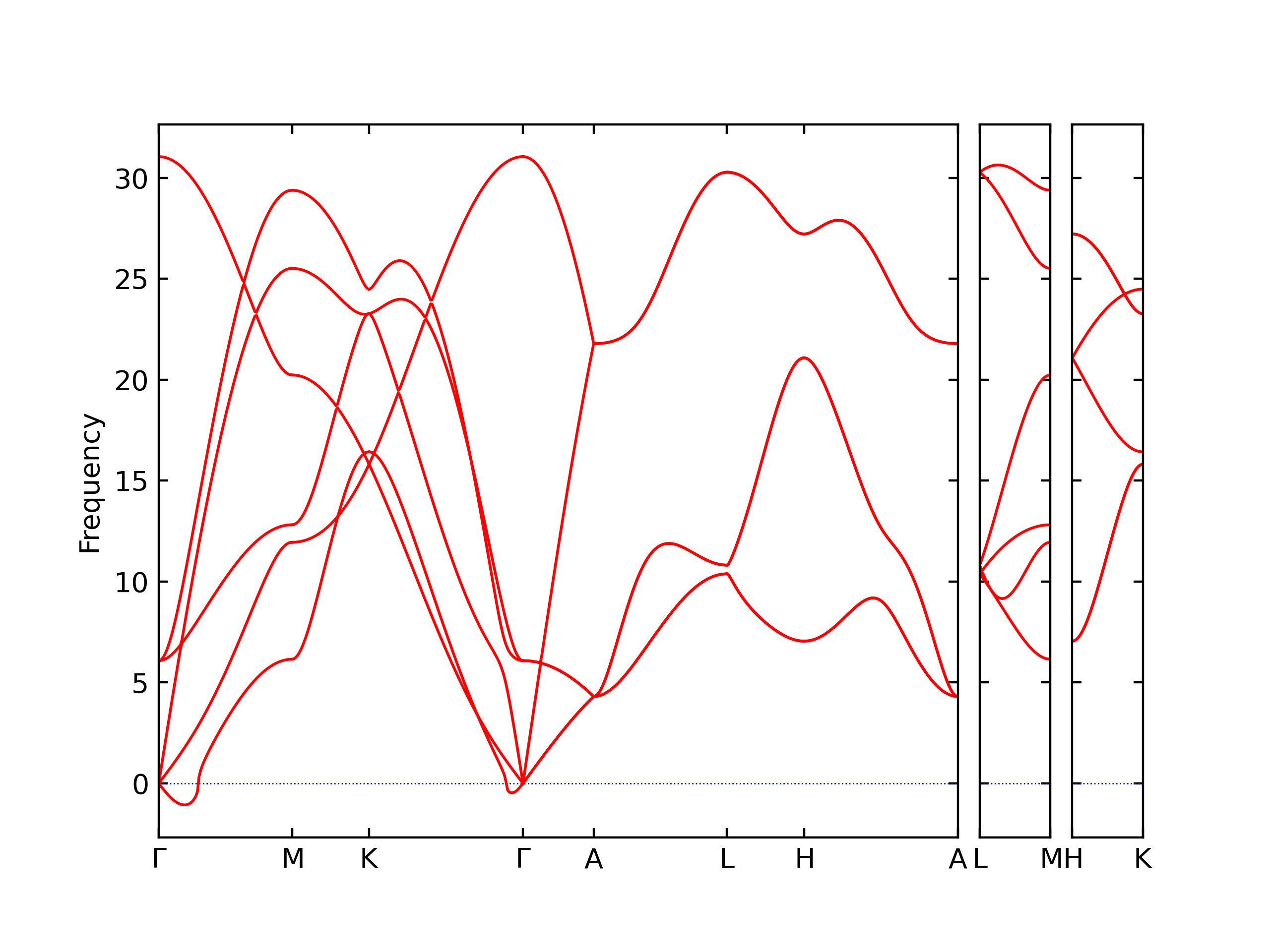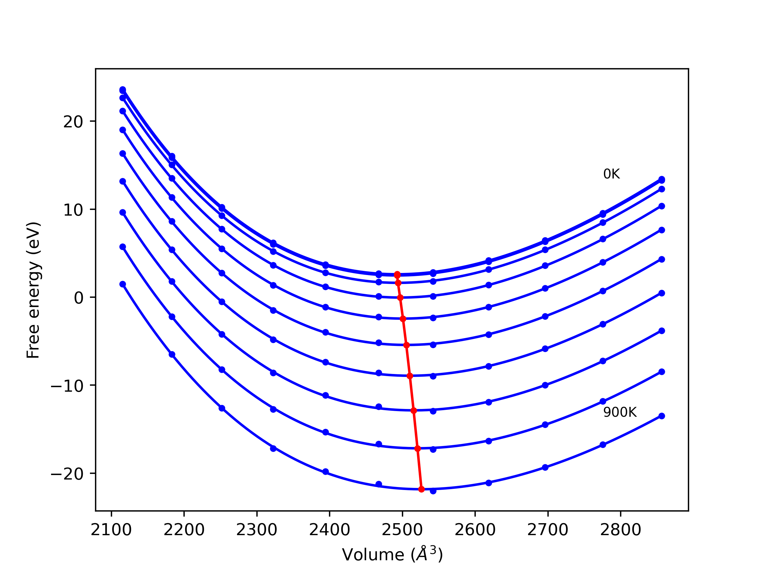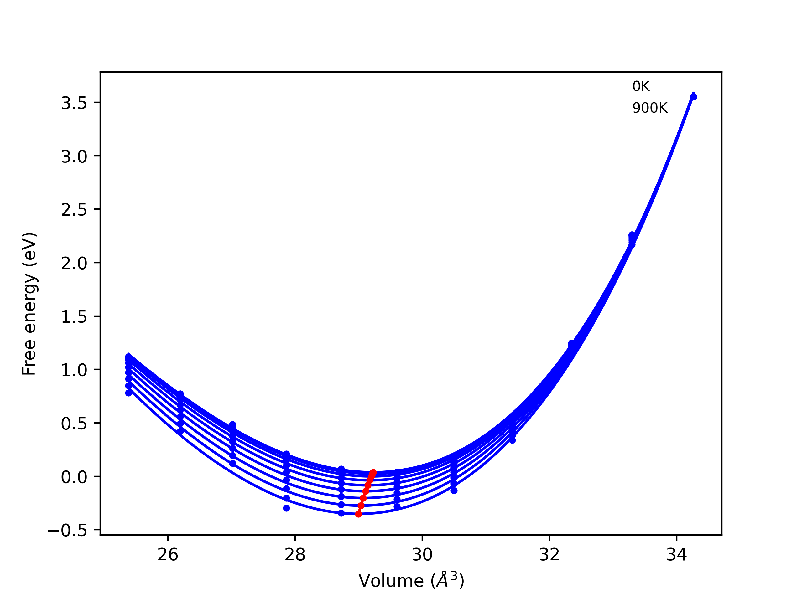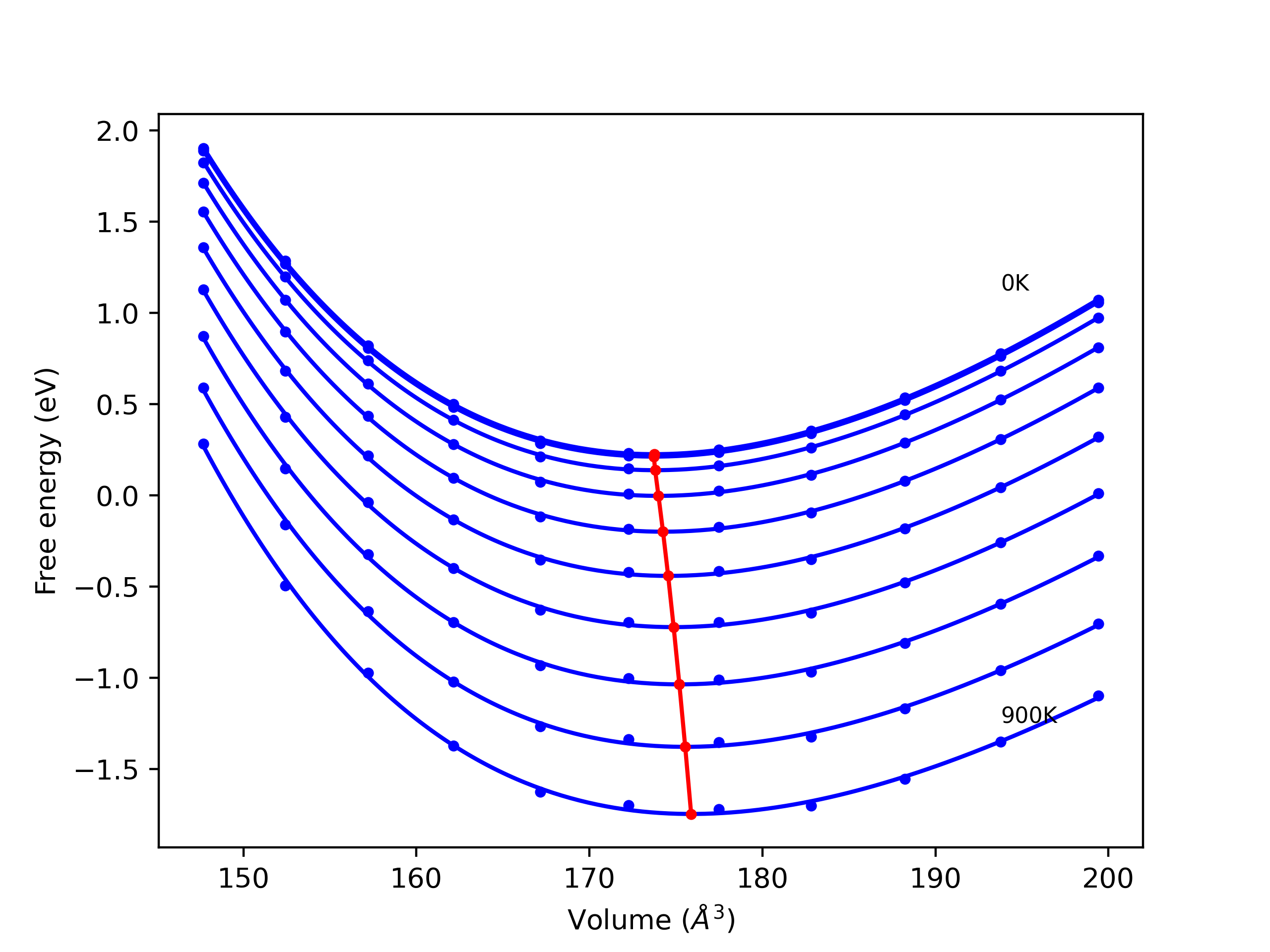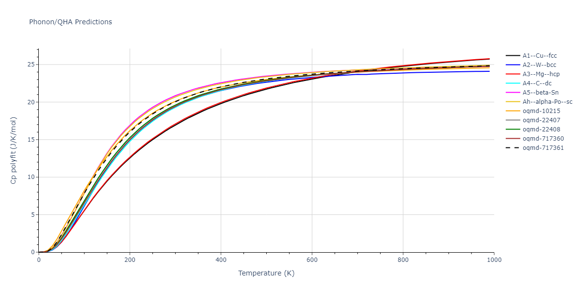 Phonon band structures and crystal properties estimated from quasi-harmonic approximation (QHA) calculations are displayed for select crystals. The calculations were performed using phonopy and LAMMPS. For the phonon calculations, 3x3 supercells of the potential-specific relaxed crystals were used. The QHA calculations were based on 11 strain states ranging from -0.05 to 0.05.