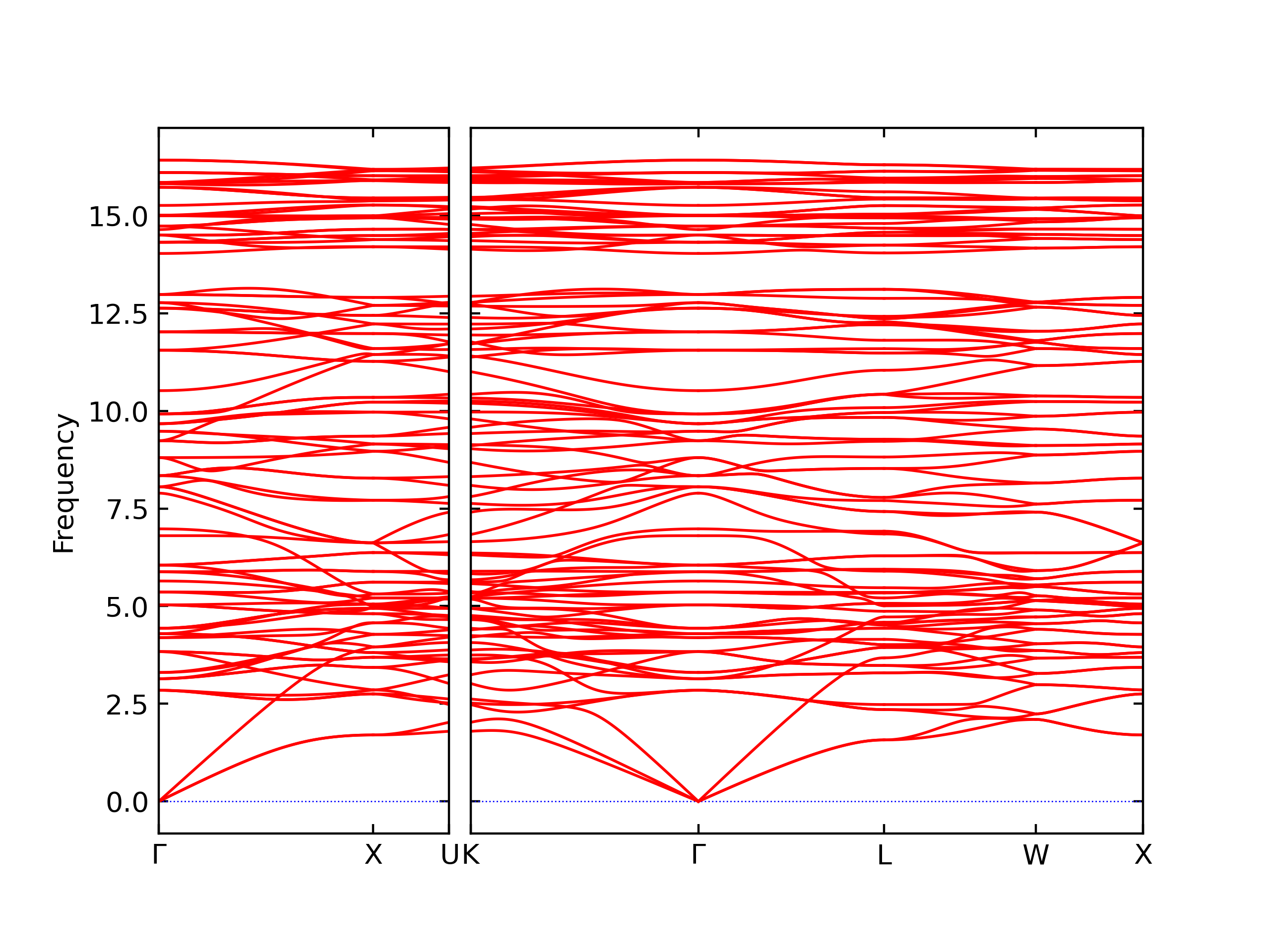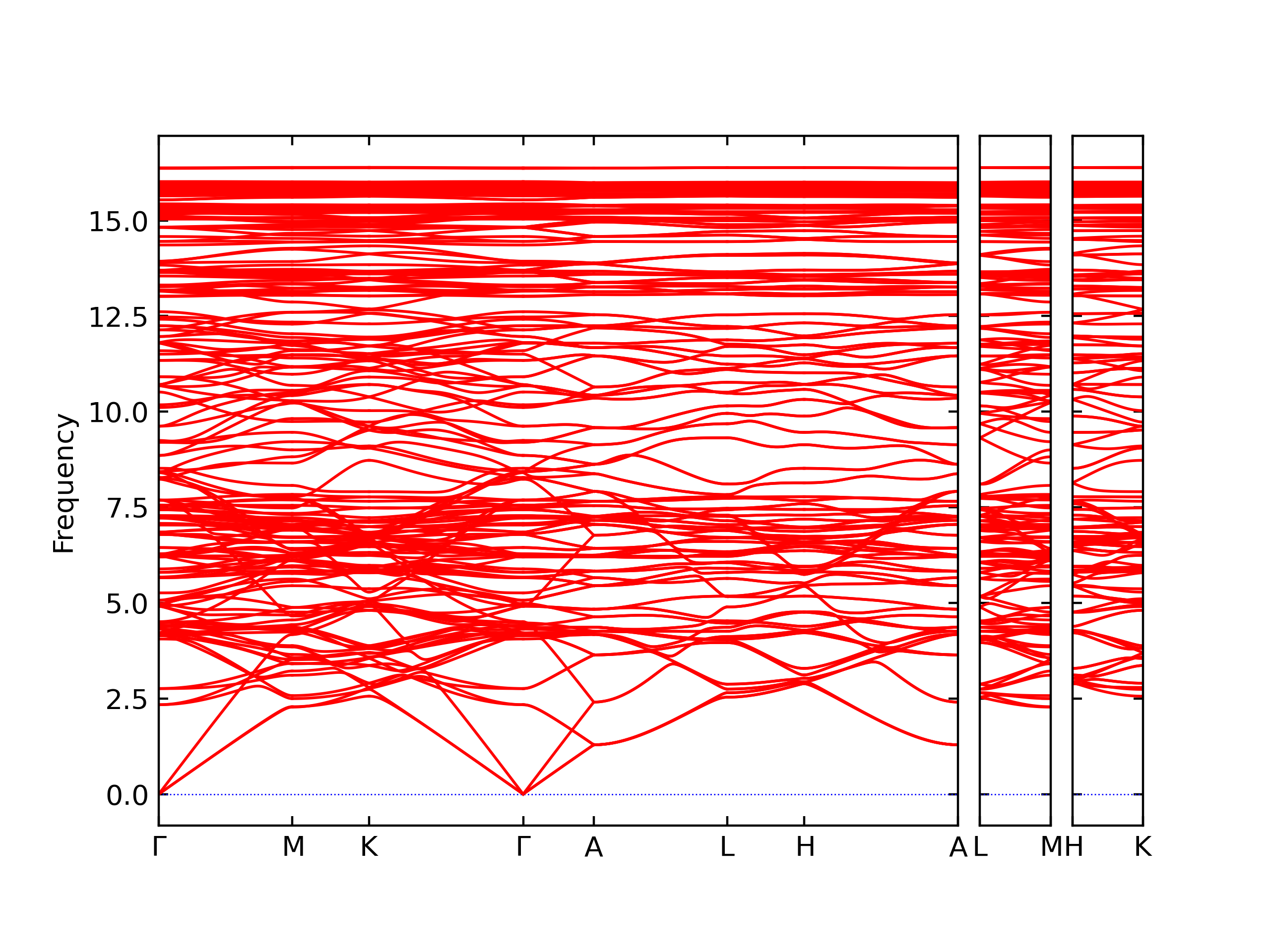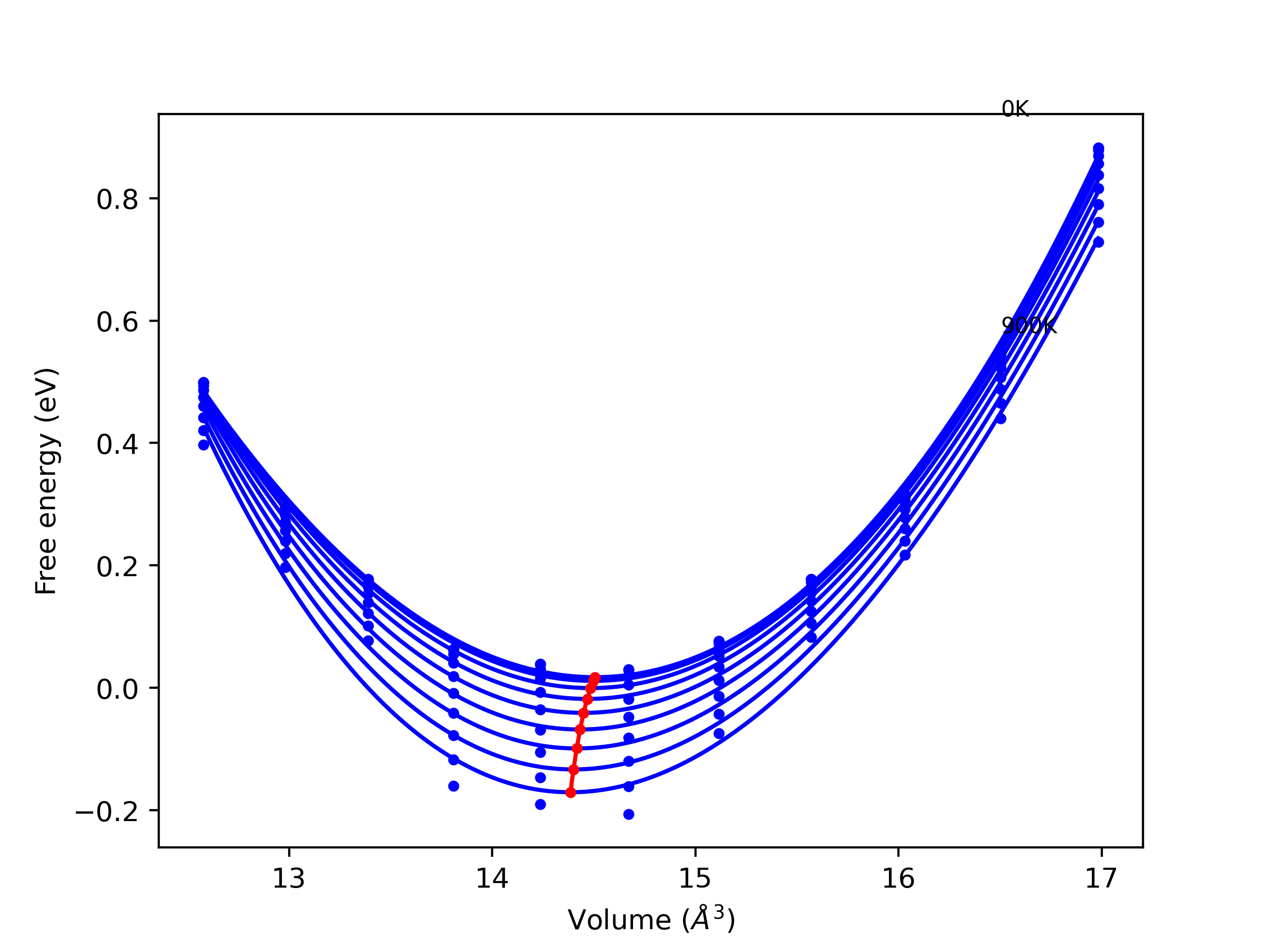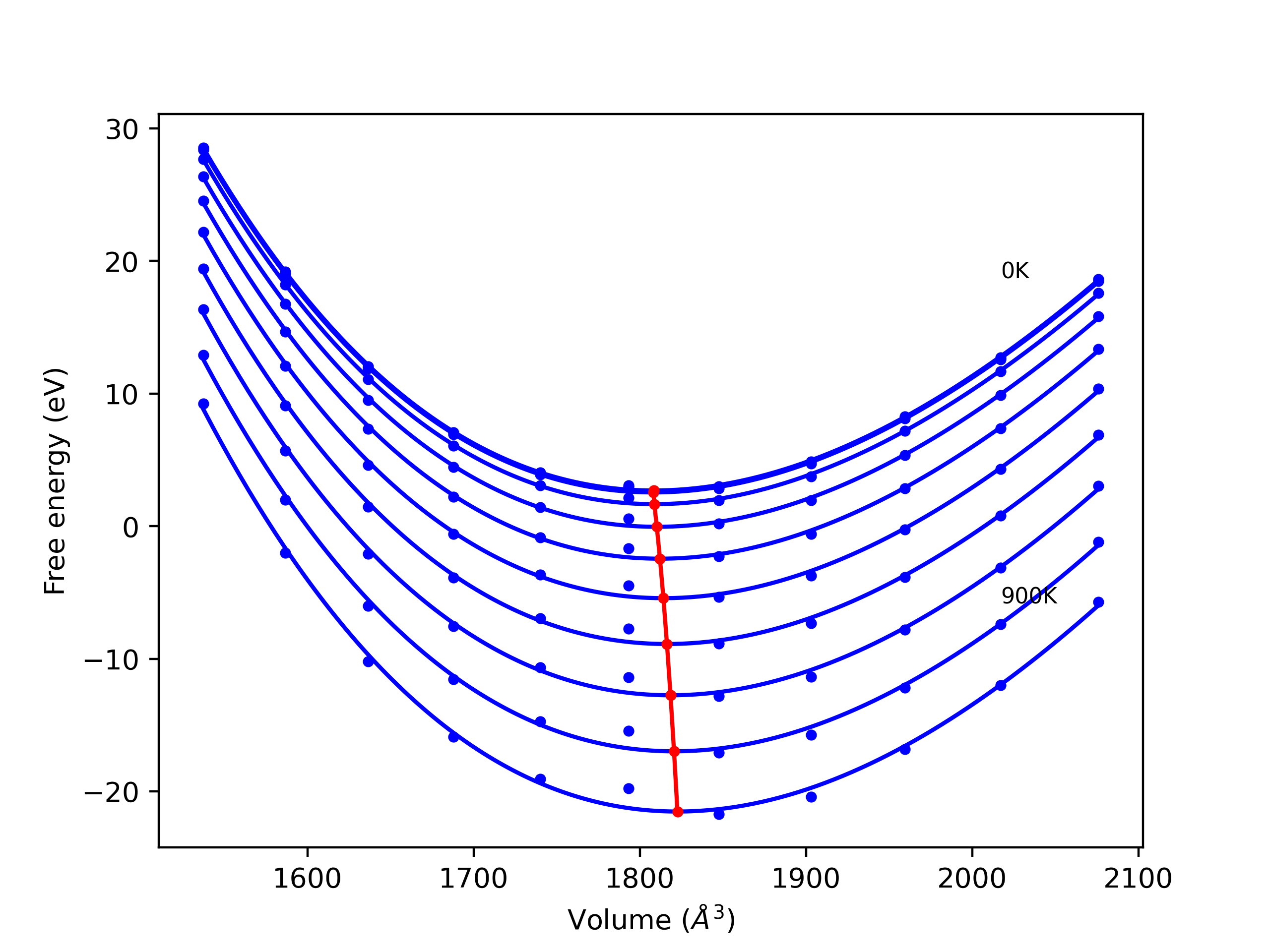 Phonon band structures and crystal properties estimated from quasi-harmonic approximation (QHA) calculations are displayed for select crystals. The calculations were performed using phonopy and LAMMPS. For the phonon calculations, 3x3 supercells of the potential-specific relaxed crystals were used. The QHA calculations were based on 11 strain states ranging from -0.05 to 0.05.