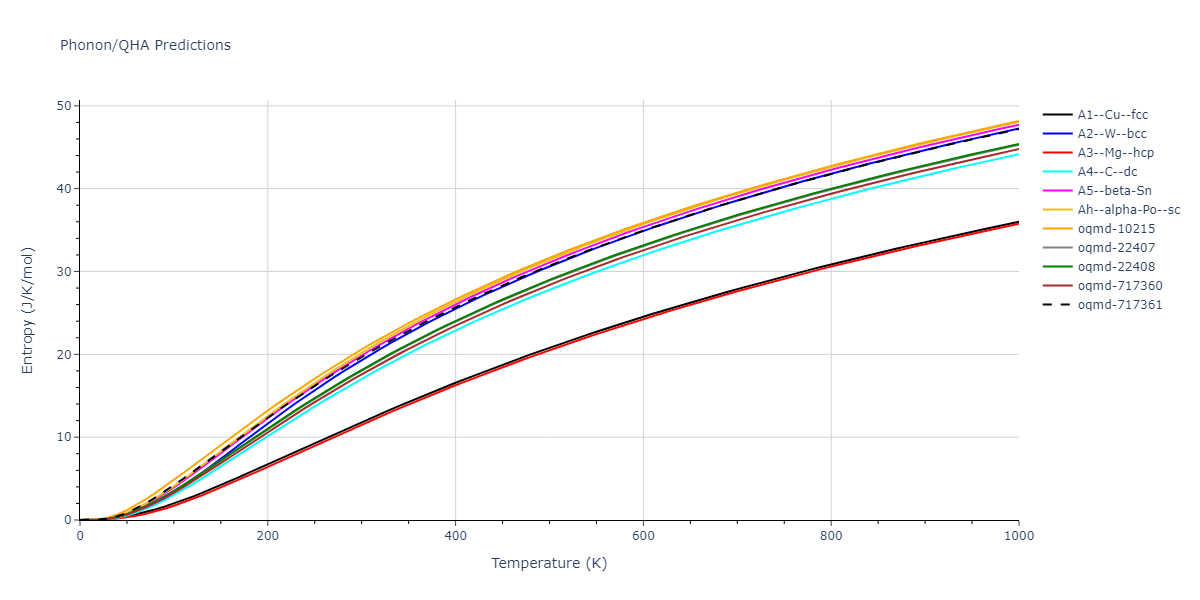 The Gibbs energies of the phases are estimated using thermodynamic integration between the interatomic potential in question and a simpler model with known Gibbs free energy values. For solids, the reference model is an Einstein solid, while for liquids it is the Uhlenbeck-Ford potential. Besides a short run at the start of the solid calculations to estimate Einstein model spring constants, the two calculations proceed similarly. Starting with the final relaxation configurations, the systems are stabilized for 25,000 steps. Then, over the next 50,000 steps the potential is swapped out for the reference potential. The system is then stabilized for another 25,000 steps with the reference model before a reverse swap of 50,000 steps is performed. The simulation ends with one final 25,000 step stabilization period. From the simulation, the irreversible work of transformation is estimated and used to compute the absolute Gibbs free energy of the target phase and potential relative to the reference potential. Entropy is estimated as the difference in enthalpy and Gibbs free energy and divided by temperature.