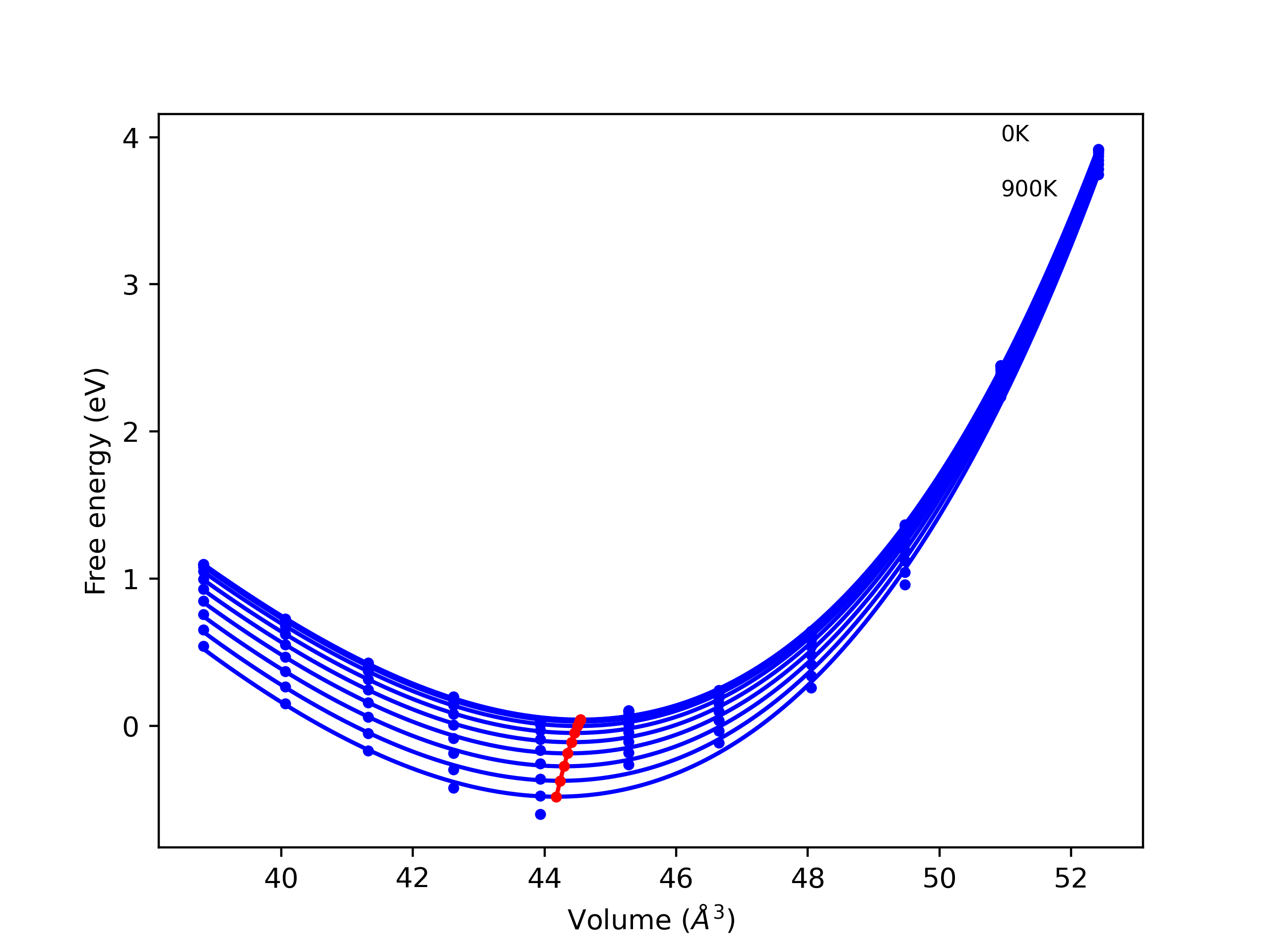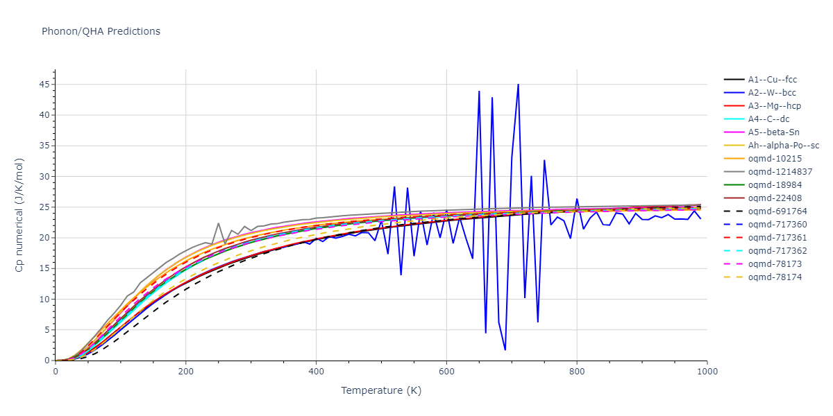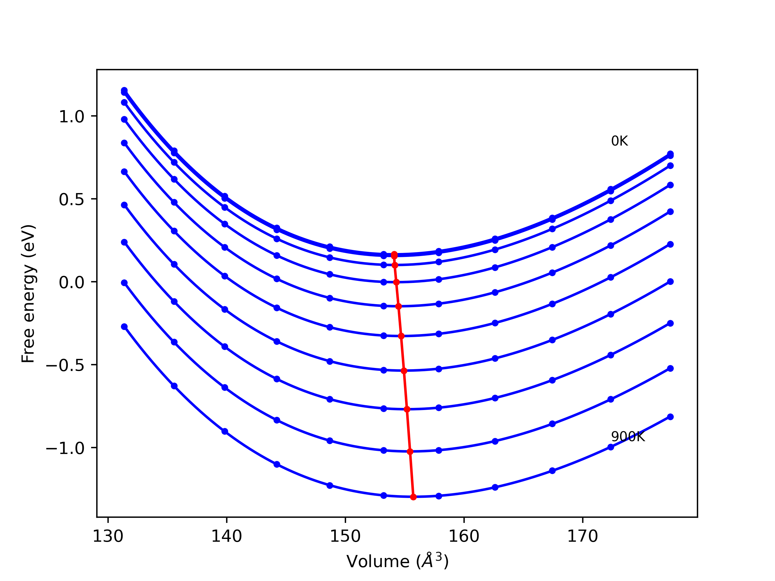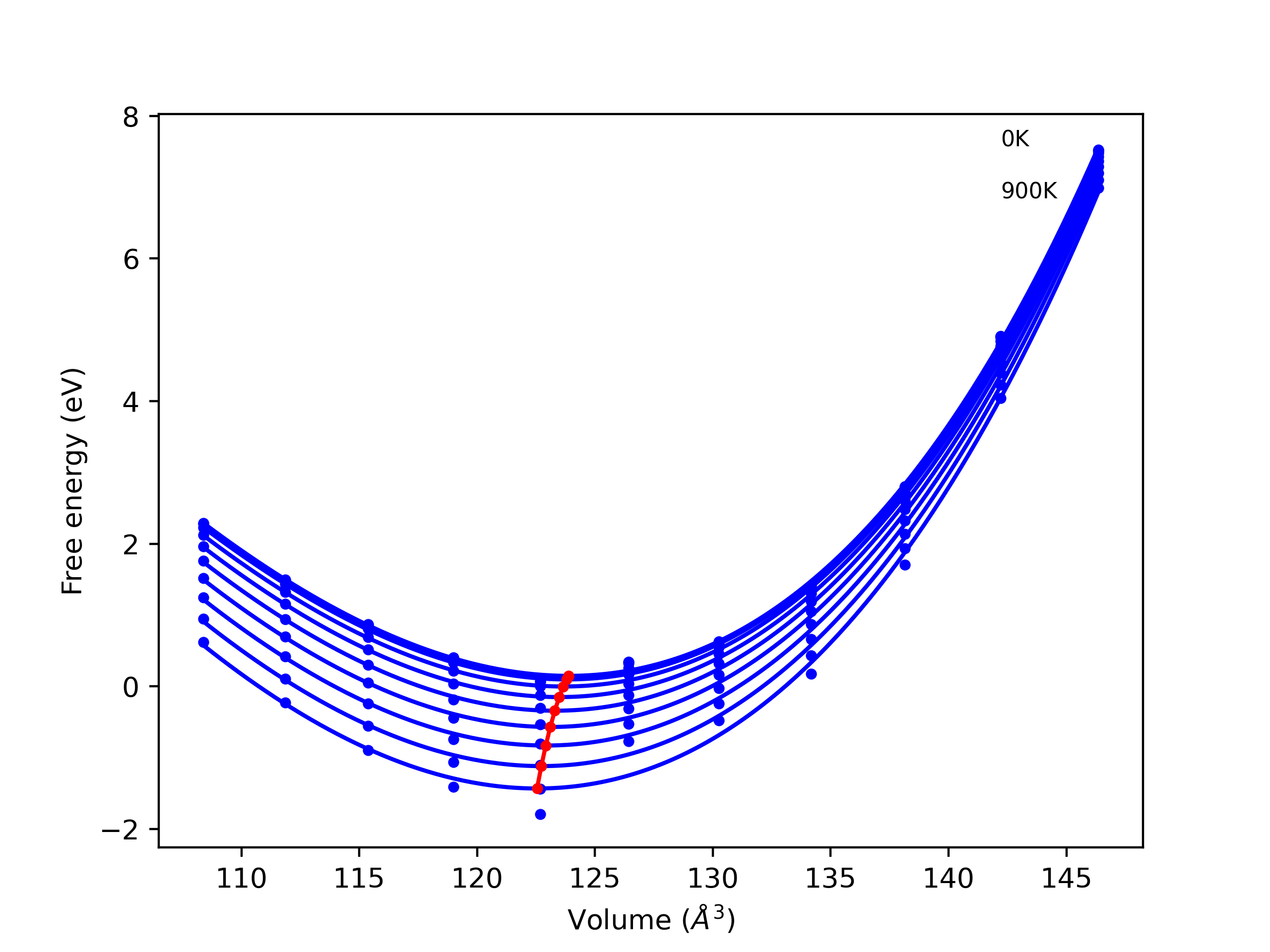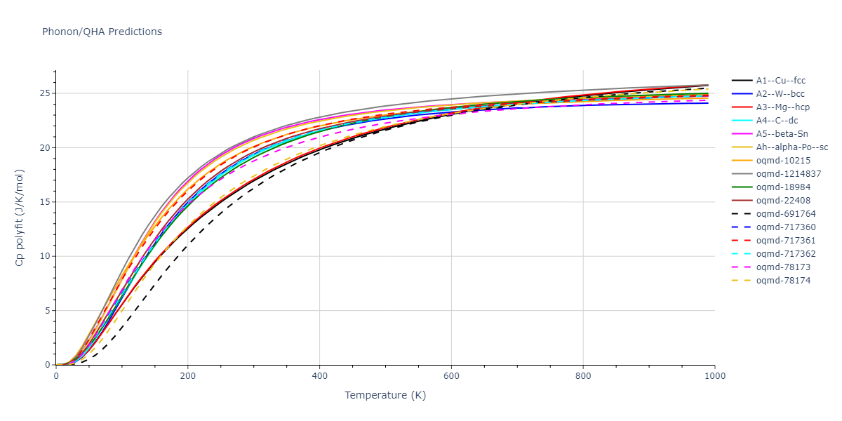 Phonon band structures and crystal properties estimated from quasi-harmonic approximation (QHA) calculations are displayed for select crystals. The calculations were performed using phonopy and LAMMPS. For the phonon calculations, 3x3 supercells of the potential-specific relaxed crystals were used. The QHA calculations were based on 11 strain states ranging from -0.05 to 0.05.