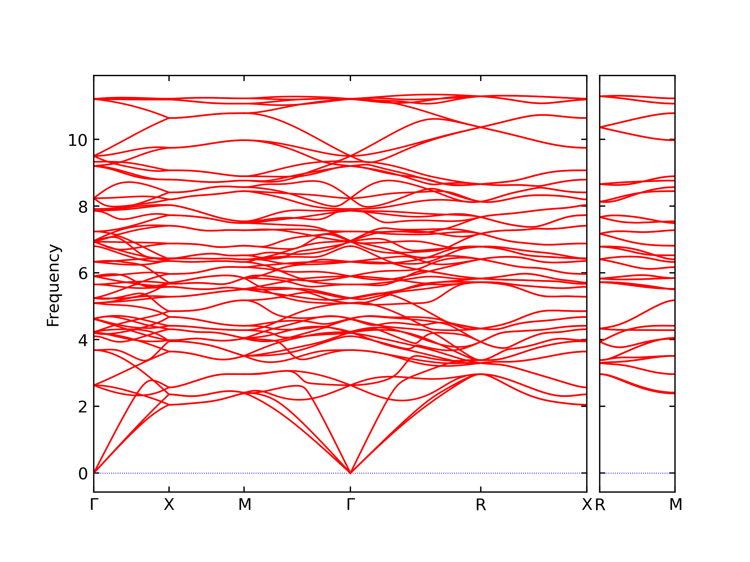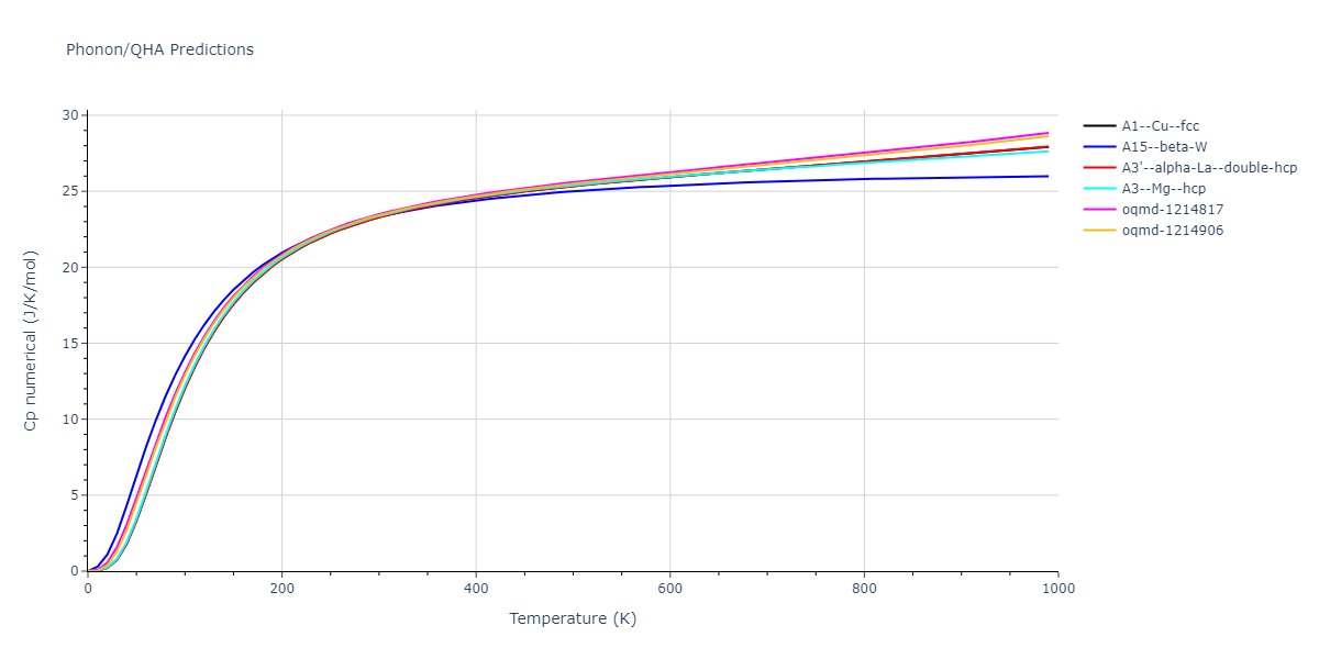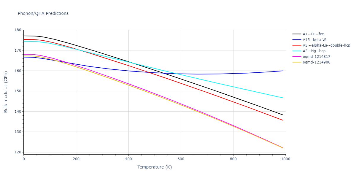 Phonon band structures and crystal properties estimated from quasi-harmonic approximation (QHA) calculations are displayed for select crystals. The calculations were performed using phonopy and LAMMPS. For the phonon calculations, 3x3 supercells of the potential-specific relaxed crystals were used. The QHA calculations were based on 11 strain states ranging from -0.05 to 0.05.