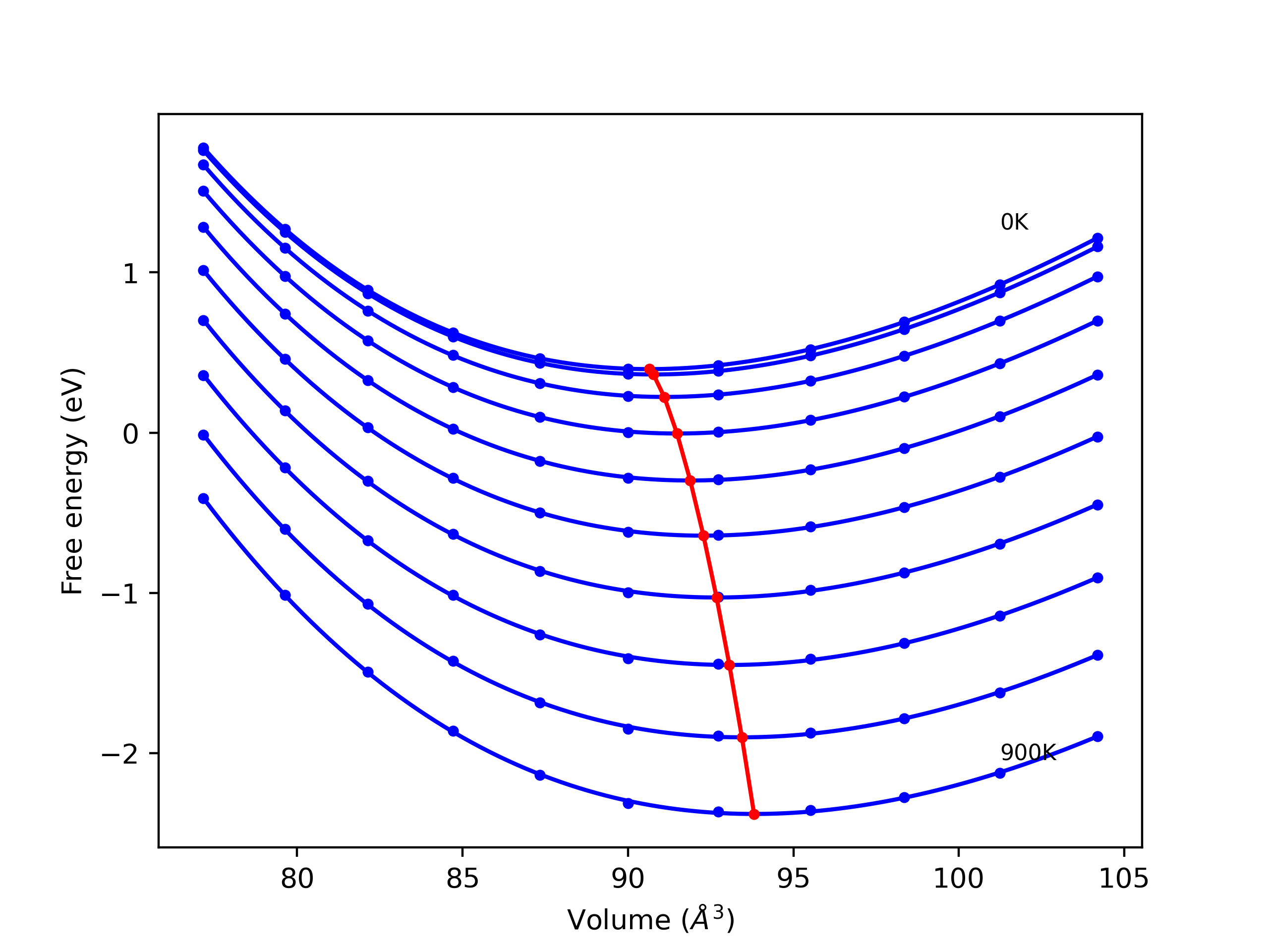 Phonon band structures and crystal properties estimated from quasi-harmonic approximation (QHA) calculations are displayed for select crystals. The calculations were performed using phonopy and LAMMPS. For the phonon calculations, 3x3 supercells of the potential-specific relaxed crystals were used. The QHA calculations were based on 11 strain states ranging from -0.05 to 0.05.
