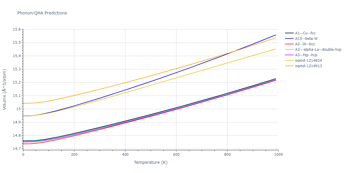 Phonon band structures and crystal properties estimated from quasi-harmonic approximation (QHA) calculations are displayed for select crystals. The calculations were performed using phonopy and LAMMPS. For the phonon calculations, 3x3 supercells of the potential-specific relaxed crystals were used. The QHA calculations were based on 11 strain states ranging from -0.05 to 0.05.