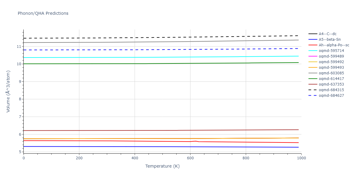 Plots of lattice and elastic constants are shown as a function of temperature. The 0K points were taken from the Crystal Structure Predictions and the Elastic Constants Predictions sections above for the unique crystal structures relaxed with the "dynamic" method. Starting from the 0 K relaxed crystal unit cells, supercell systems are created by replicating all three dimensions by the same multiplier to achieve at least 4000 atoms. The systems are then relaxed at 50 K and zero pressure using 1 million NPT steps. Lattice constants are estimated by averaging the measured box dimensions. Temperatures are iteratively increased by 50 K, with each subsequent relaxation calculation starting from the final atomic configuration at the previous temperature and relaxing for another 1 million steps.