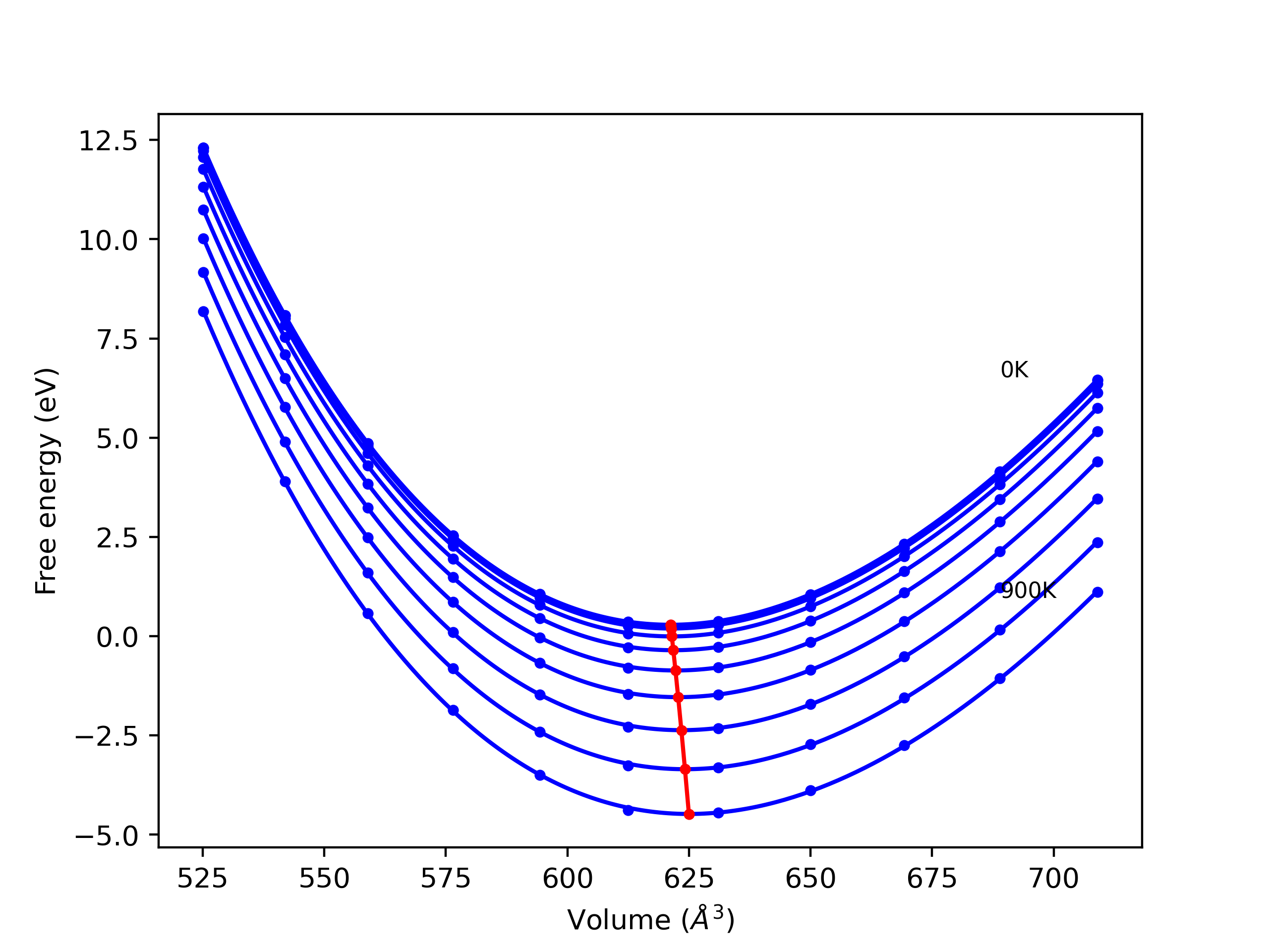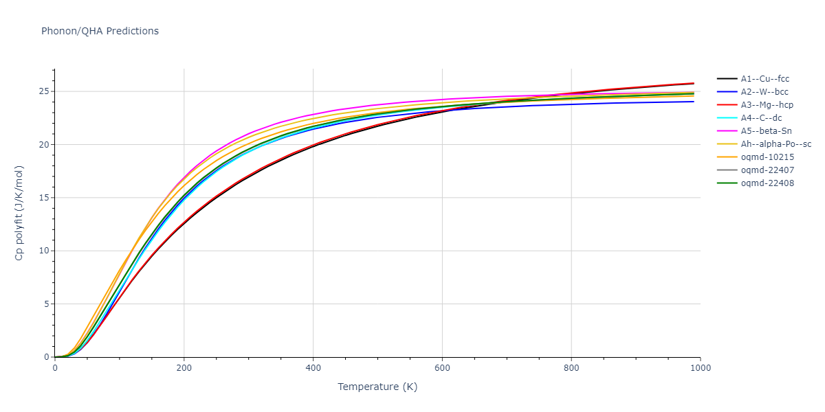 Plots of internal energy, Gibbs free energy, entropy, heat capacity and volume are shown here as a function of temperature for various crystal structures and liquid phases. The included crystal structures correspond to those in the Solid Structures vs. Temperature section, and the liquid phases to those in the Liquid Properties section. Internal energy and volume are taken from the associated structure relaxations mentioned in those previous sections. Constant pressure heat capacity is estimated using 3-point numerical derivatives of enthalpy versus temperature. Note that since all simulations done here are at 0 pressure, internal energy and enthalpy are equivalent.