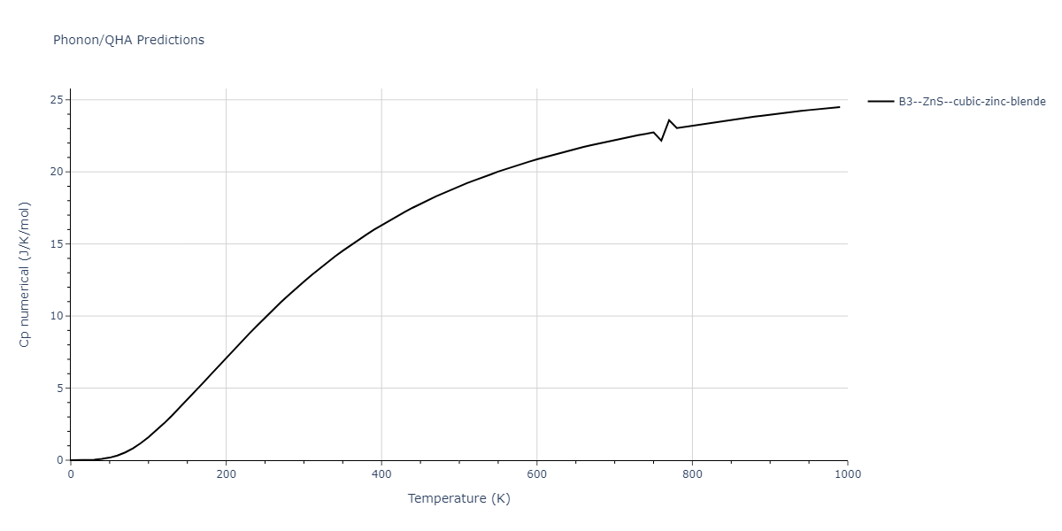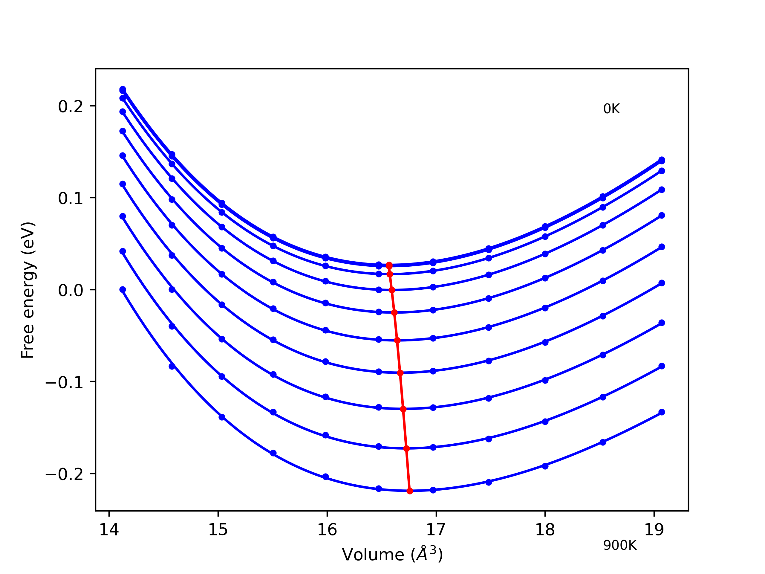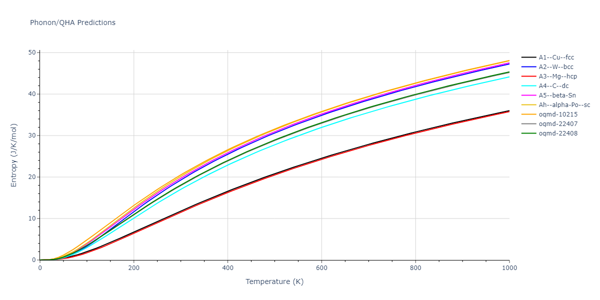 The Gibbs energies of the phases are estimated using thermodynamic integration between the interatomic potential in question and a simpler model with known Gibbs free energy values. For solids, the reference model is an Einstein solid, while for liquids it is the Uhlenbeck-Ford potential. Besides a short run at the start of the solid calculations to estimate Einstein model spring constants, the two calculations proceed similarly. Starting with the final relaxation configurations, the systems are stabilized for 25,000 steps. Then, over the next 50,000 steps the potential is swapped out for the reference potential. The system is then stabilized for another 25,000 steps with the reference model before a reverse swap of 50,000 steps is performed. The simulation ends with one final 25,000 step stabilization period. From the simulation, the irreversible work of transformation is estimated and used to compute the absolute Gibbs free energy of the target phase and potential relative to the reference potential. Entropy is estimated as the difference in enthalpy and Gibbs free energy and divided by temperature.