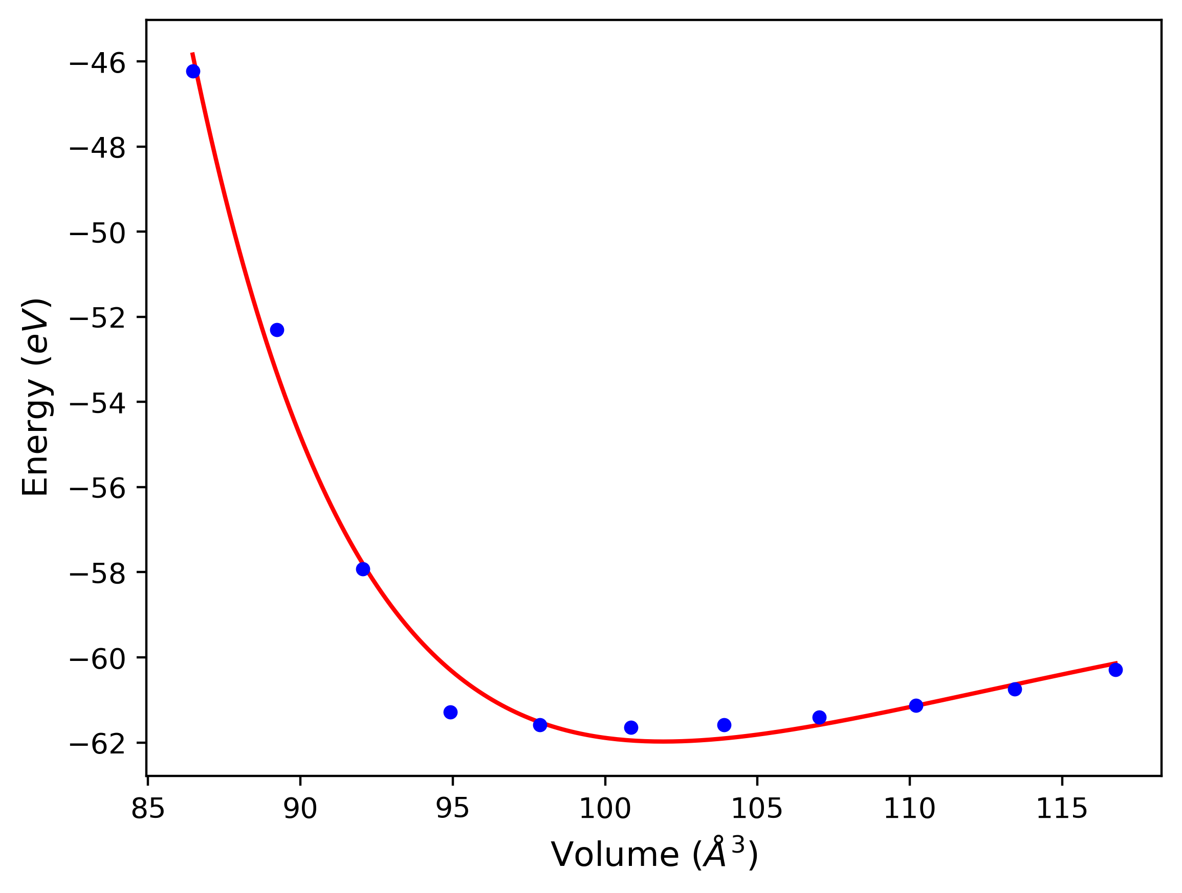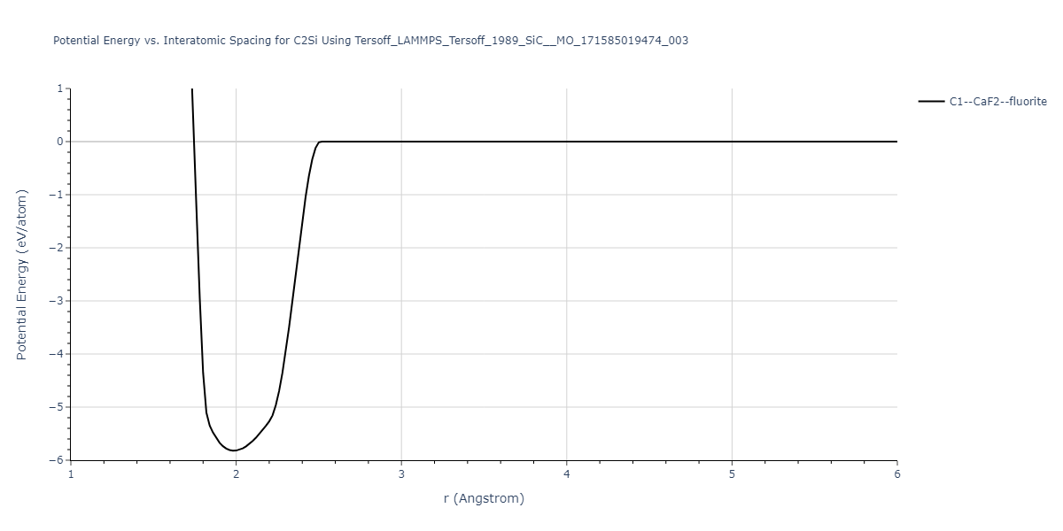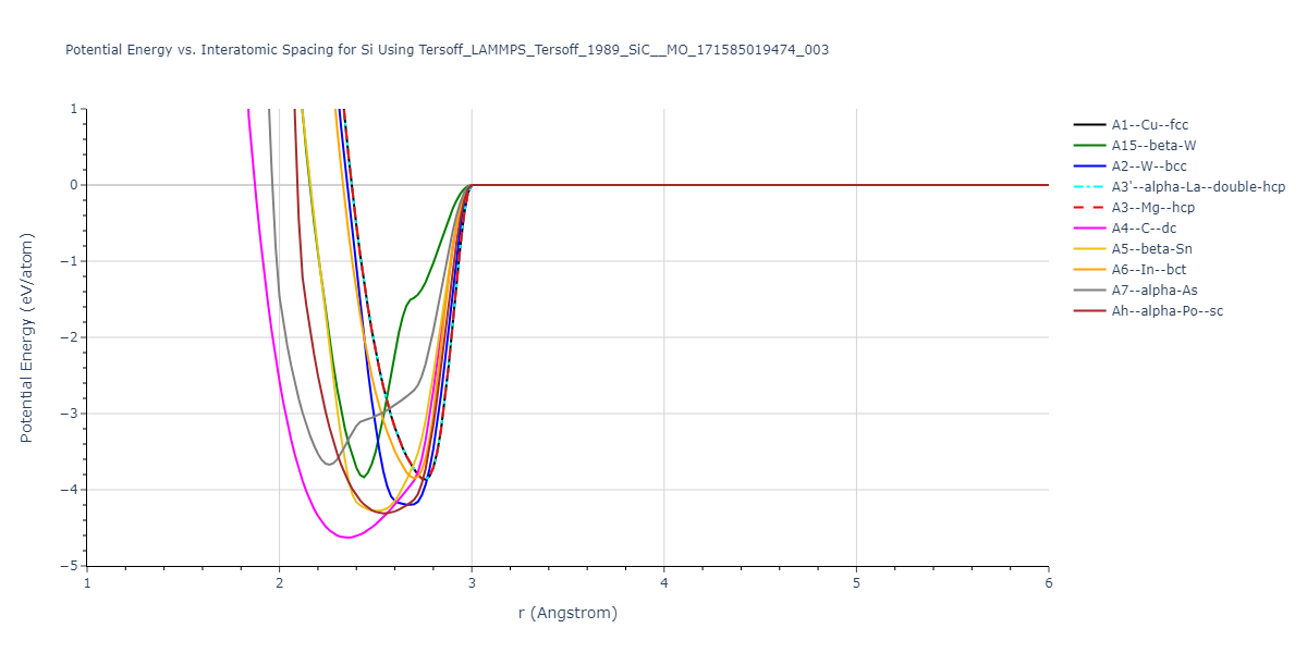 Plots of potential energy vs interatomic spacing, r, are shown below for a number of crystal structures. The structures are generated based on the ideal atomic positions and b/a and c/a lattice parameter ratios for a given crystal prototype. The size of the system is then uniformly scaled, and the energy calculated without relaxing the system. To obtain these plots, values of r are evaluated every 0.02 Å up to 6 Å.