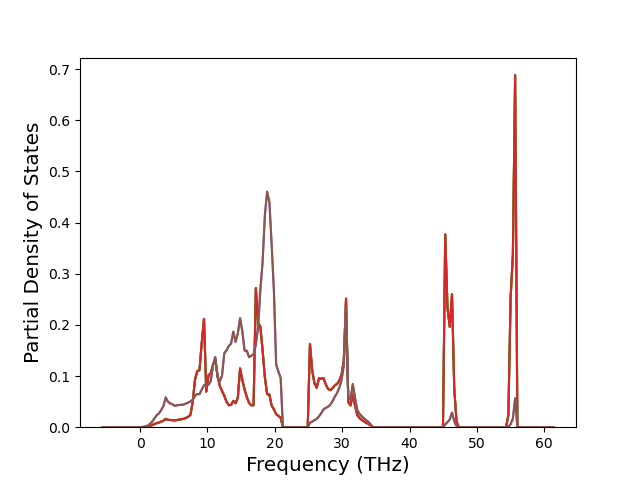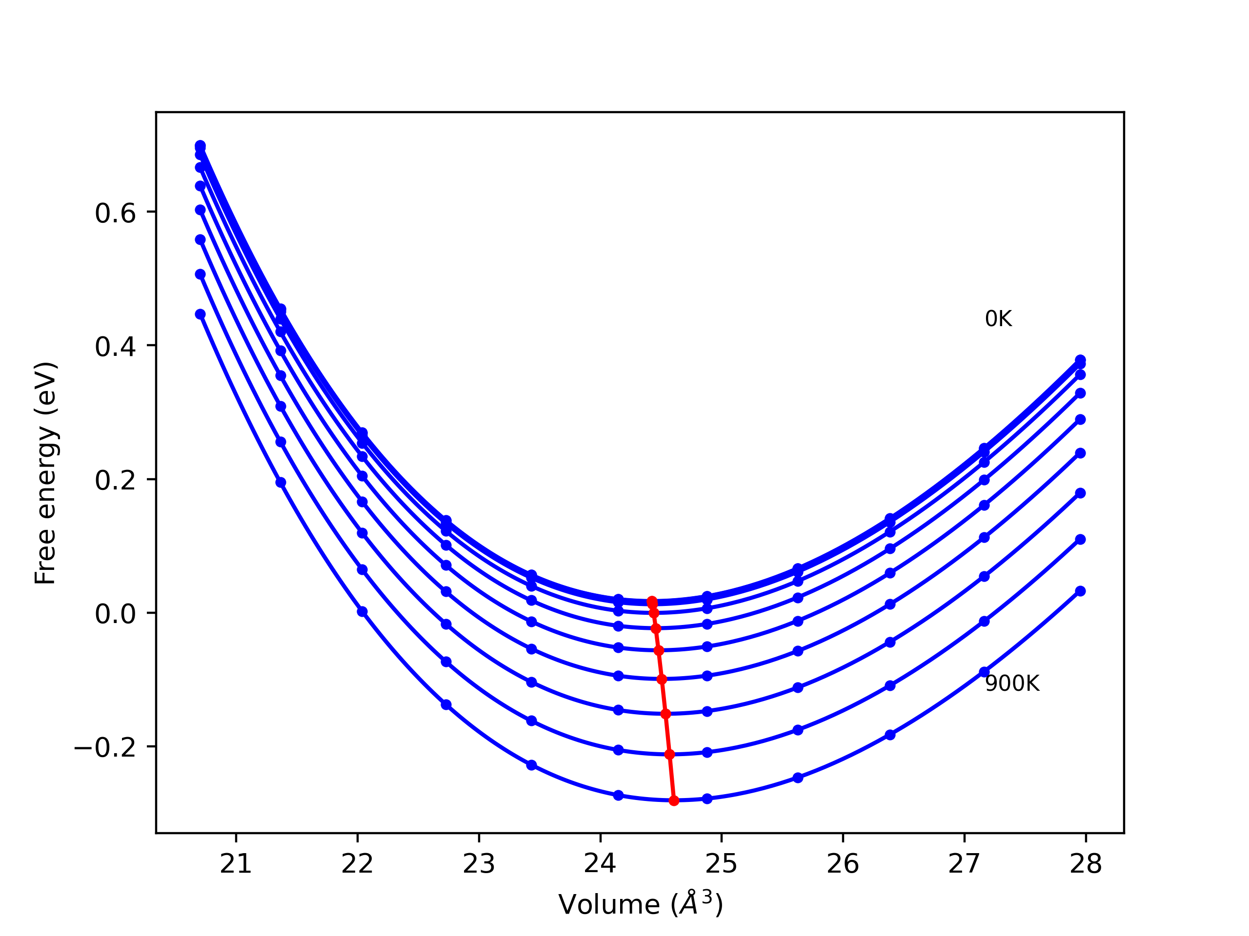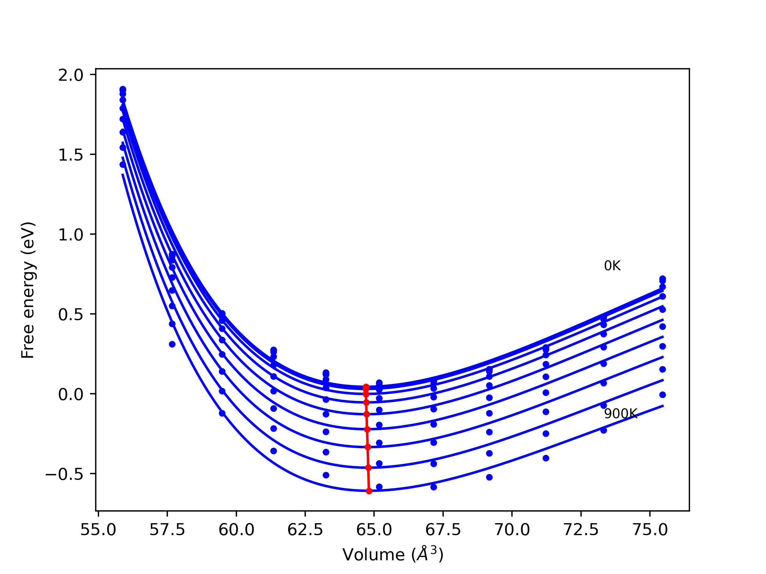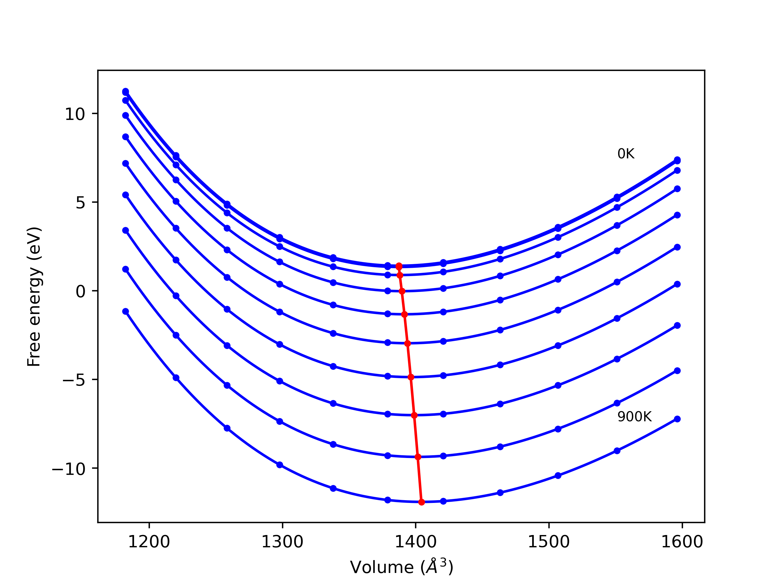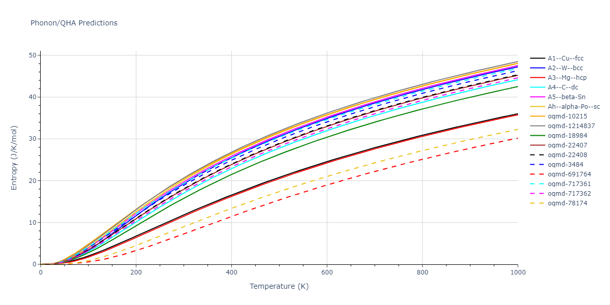 The Gibbs energies of the phases are estimated using thermodynamic integration between the interatomic potential in question and a simpler model with known Gibbs free energy values. For solids, the reference model is an Einstein solid, while for liquids it is the Uhlenbeck-Ford potential. Besides a short run at the start of the solid calculations to estimate Einstein model spring constants, the two calculations proceed similarly. Starting with the final relaxation configurations, the systems are stabilized for 25,000 steps. Then, over the next 50,000 steps the potential is swapped out for the reference potential. The system is then stabilized for another 25,000 steps with the reference model before a reverse swap of 50,000 steps is performed. The simulation ends with one final 25,000 step stabilization period. From the simulation, the irreversible work of transformation is estimated and used to compute the absolute Gibbs free energy of the target phase and potential relative to the reference potential. Entropy is estimated as the difference in enthalpy and Gibbs free energy and divided by temperature.