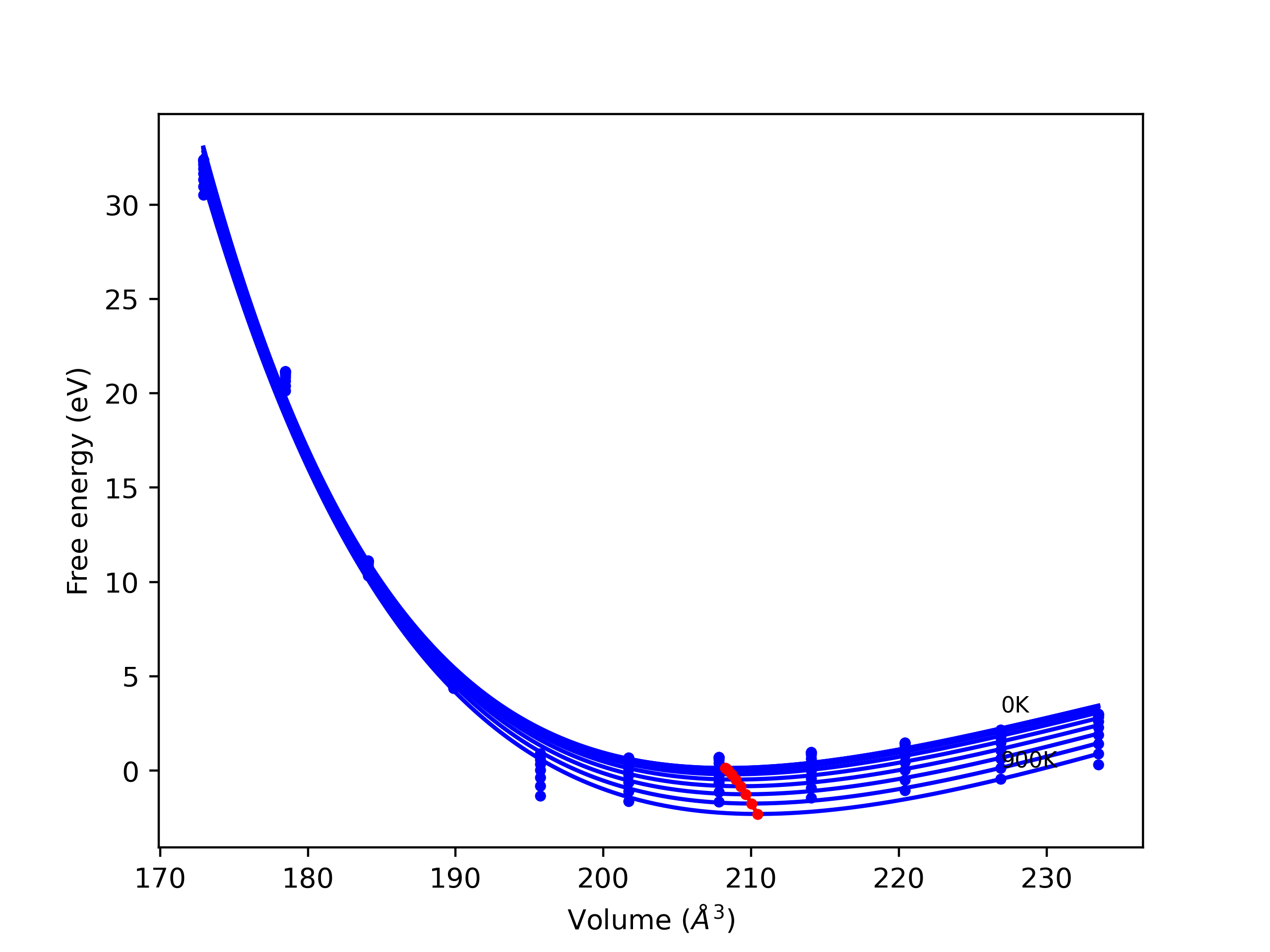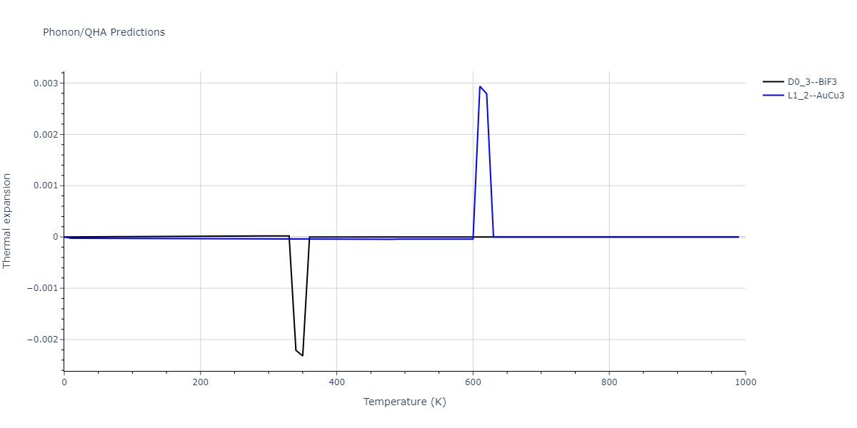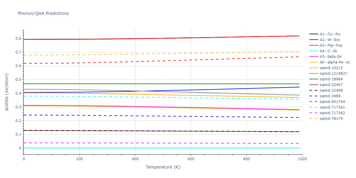 Plots of internal energy, Gibbs free energy, entropy, heat capacity and volume are shown here as a function of temperature for various crystal structures and liquid phases. The included crystal structures correspond to those in the Solid Structures vs. Temperature section, and the liquid phases to those in the Liquid Properties section. Internal energy and volume are taken from the associated structure relaxations mentioned in those previous sections. Constant pressure heat capacity is estimated using 3-point numerical derivatives of enthalpy versus temperature. Note that since all simulations done here are at 0 pressure, internal energy and enthalpy are equivalent.