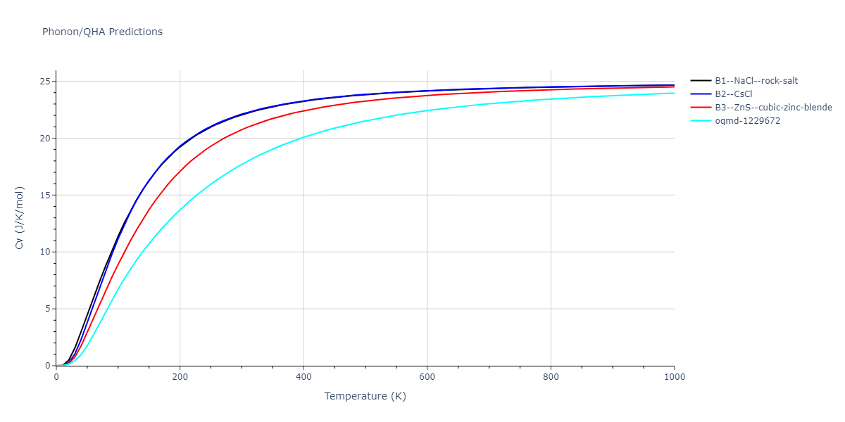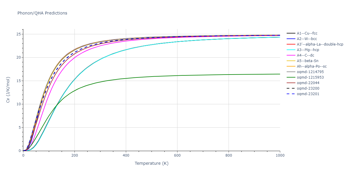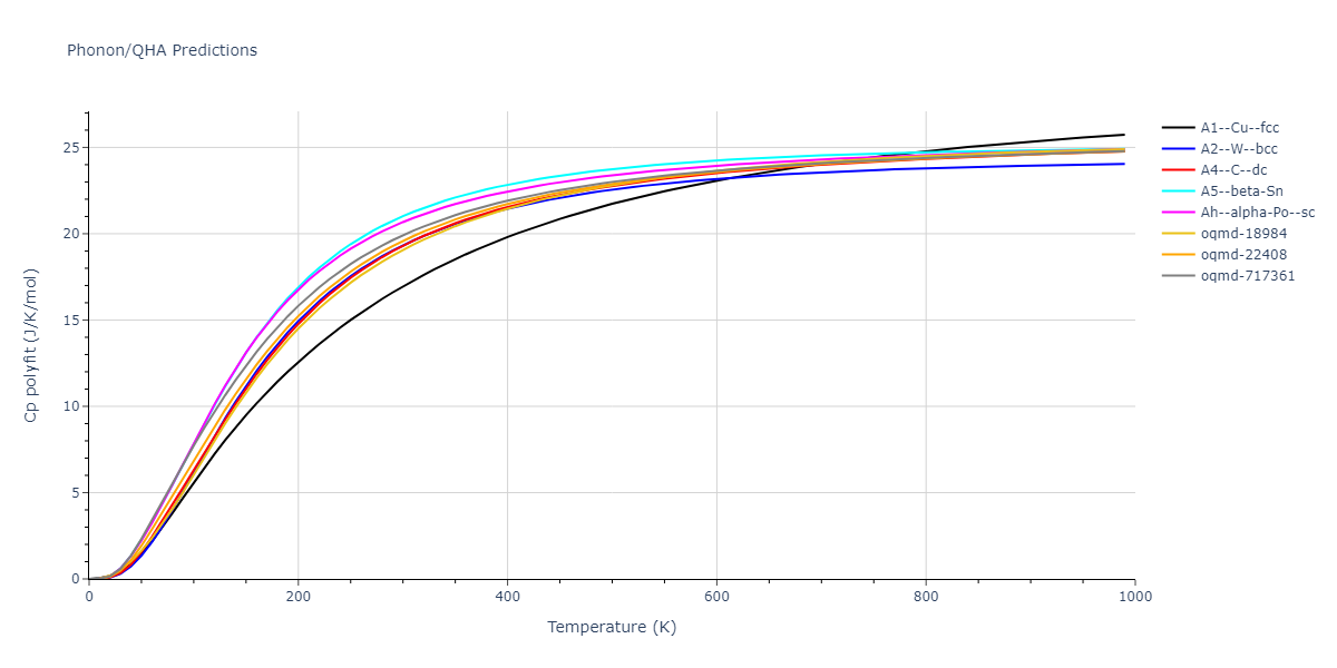Plots of internal energy, Gibbs free energy, entropy, heat capacity and volume are shown here as a function of temperature for various crystal structures and liquid phases. The included crystal structures correspond to those in the Solid Structures vs. Temperature section, and the liquid phases to those in the Liquid Properties section. Internal energy and volume are taken from the associated structure relaxations mentioned in those previous sections. Constant pressure heat capacity is estimated using 3-point numerical derivatives of enthalpy versus temperature. Note that since all simulations done here are at 0 pressure, internal energy and enthalpy are equivalent.