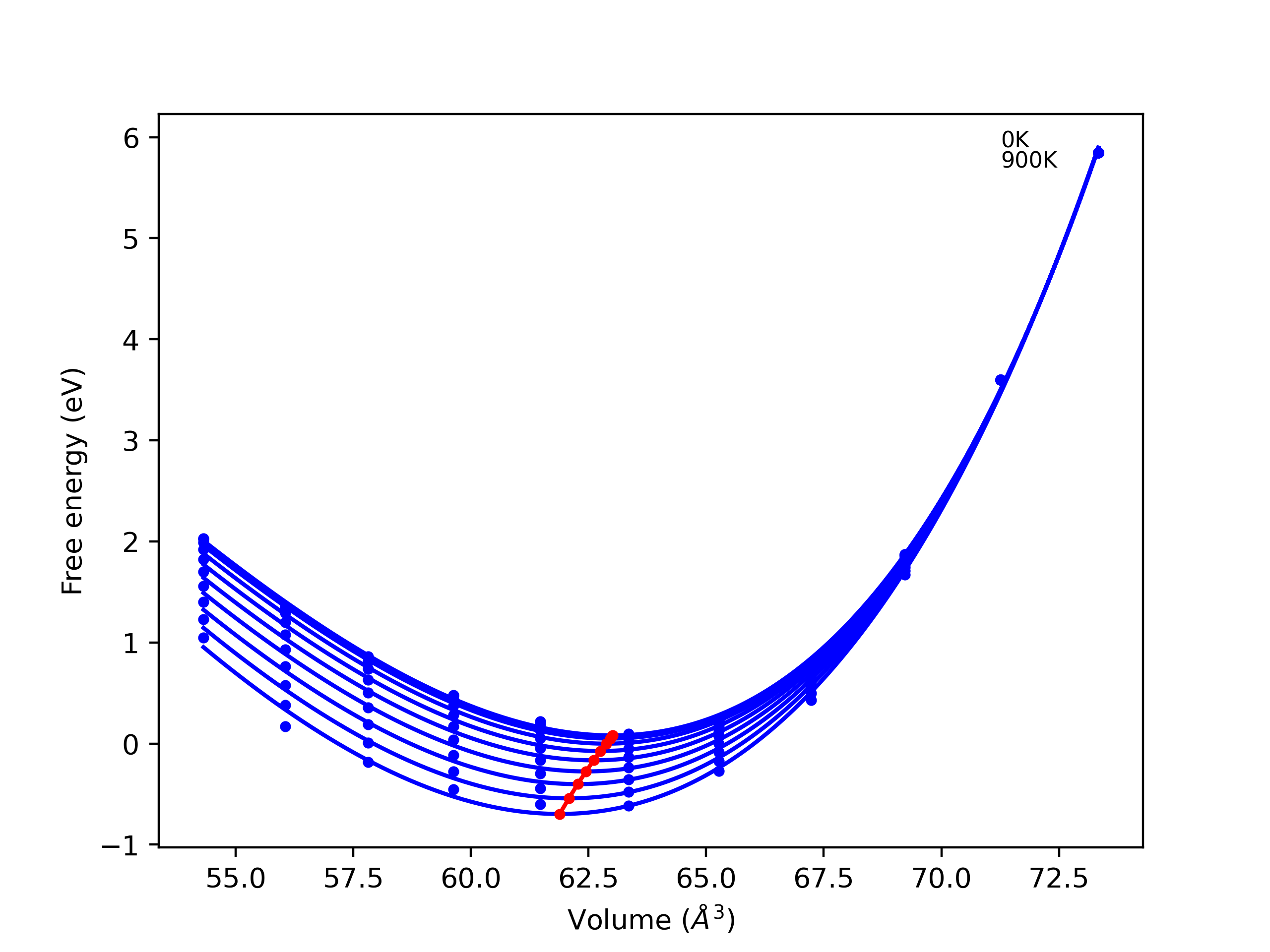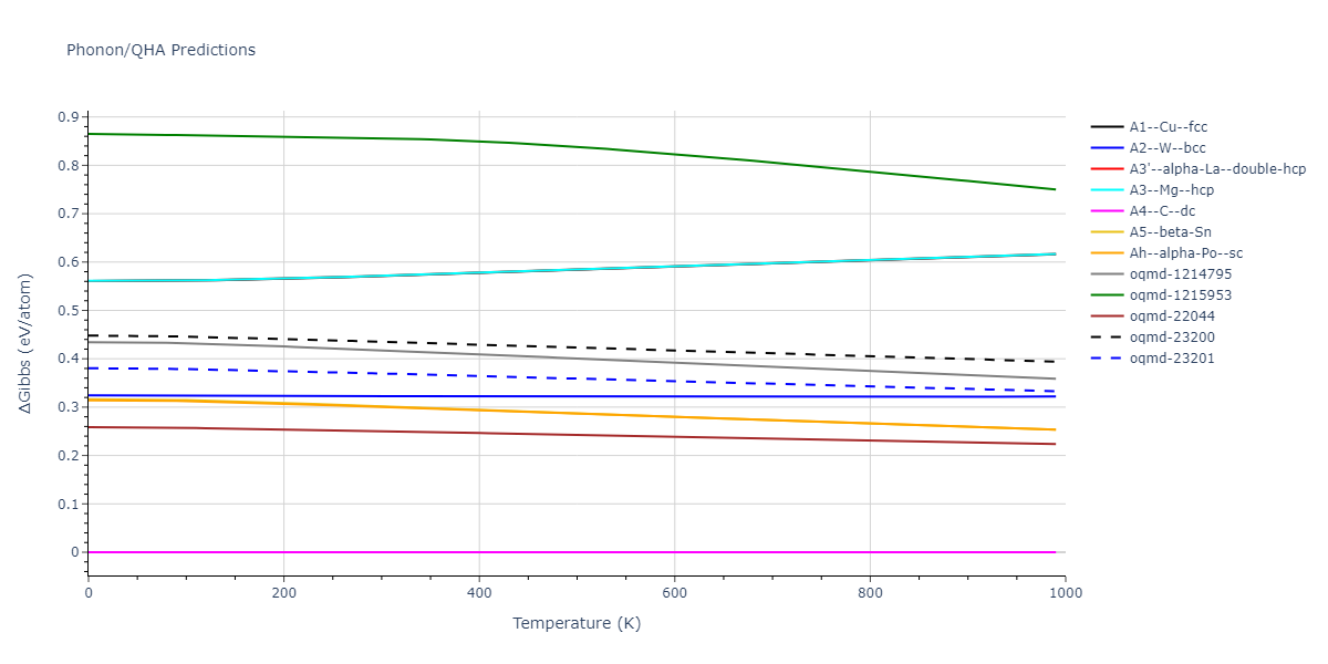 The Gibbs energies of the phases are estimated using thermodynamic integration between the interatomic potential in question and a simpler model with known Gibbs free energy values. For solids, the reference model is an Einstein solid, while for liquids it is the Uhlenbeck-Ford potential. Besides a short run at the start of the solid calculations to estimate Einstein model spring constants, the two calculations proceed similarly. Starting with the final relaxation configurations, the systems are stabilized for 25,000 steps. Then, over the next 50,000 steps the potential is swapped out for the reference potential. The system is then stabilized for another 25,000 steps with the reference model before a reverse swap of 50,000 steps is performed. The simulation ends with one final 25,000 step stabilization period. From the simulation, the irreversible work of transformation is estimated and used to compute the absolute Gibbs free energy of the target phase and potential relative to the reference potential. Entropy is estimated as the difference in enthalpy and Gibbs free energy and divided by temperature.