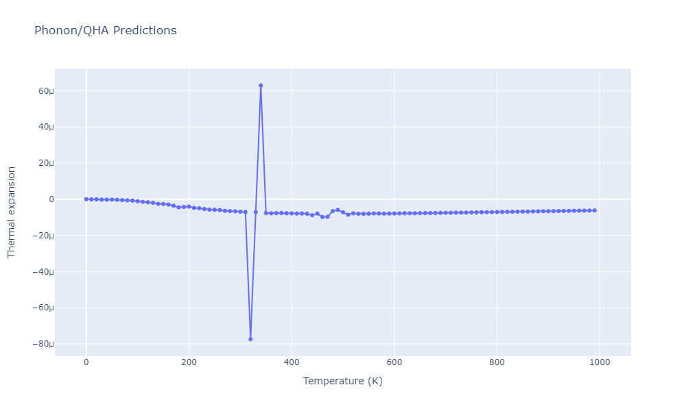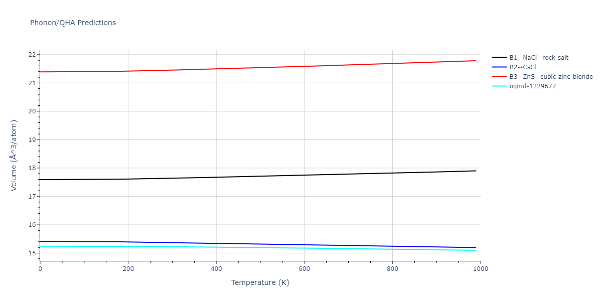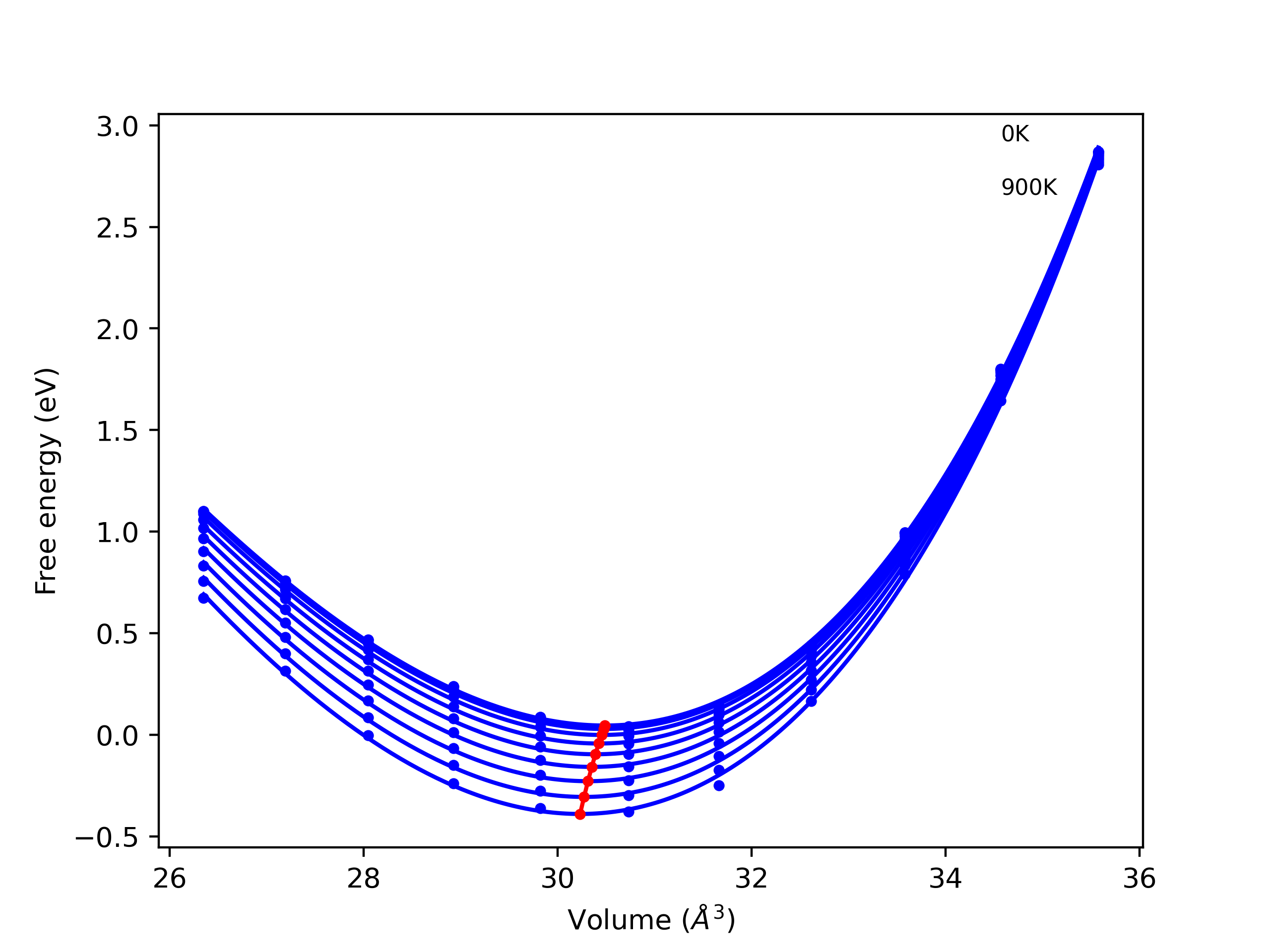 Plots of lattice and elastic constants are shown as a function of temperature. The 0K points were taken from the Crystal Structure Predictions and the Elastic Constants Predictions sections above for the unique crystal structures relaxed with the "dynamic" method. Starting from the 0 K relaxed crystal unit cells, supercell systems are created by replicating all three dimensions by the same multiplier to achieve at least 4000 atoms. The systems are then relaxed at 50 K and zero pressure using 1 million NPT steps. Lattice constants are estimated by averaging the measured box dimensions. Temperatures are iteratively increased by 50 K, with each subsequent relaxation calculation starting from the final atomic configuration at the previous temperature and relaxing for another 1 million steps.
