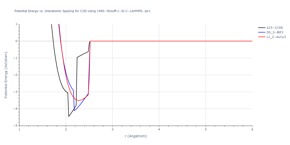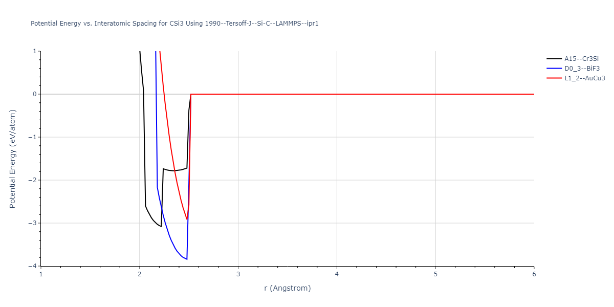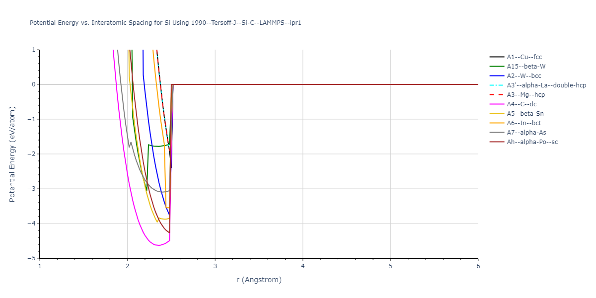 Plots of potential energy vs interatomic spacing, r, are shown below for a number of crystal structures. The structures are generated based on the ideal atomic positions and b/a and c/a lattice parameter ratios for a given crystal prototype. The size of the system is then uniformly scaled, and the energy calculated without relaxing the system. To obtain these plots, values of r are evaluated every 0.02 Å up to 6 Å.