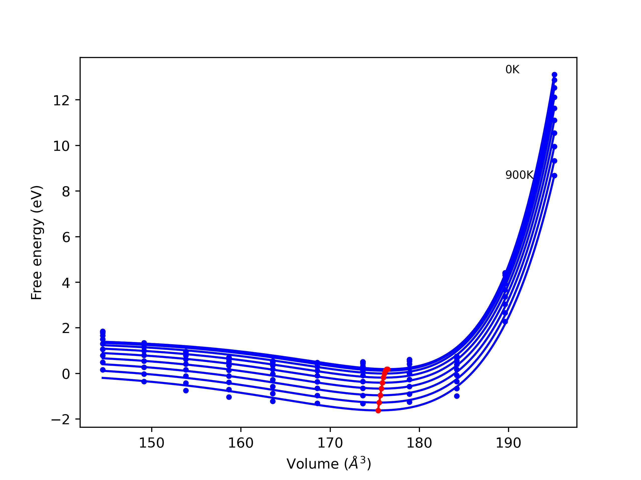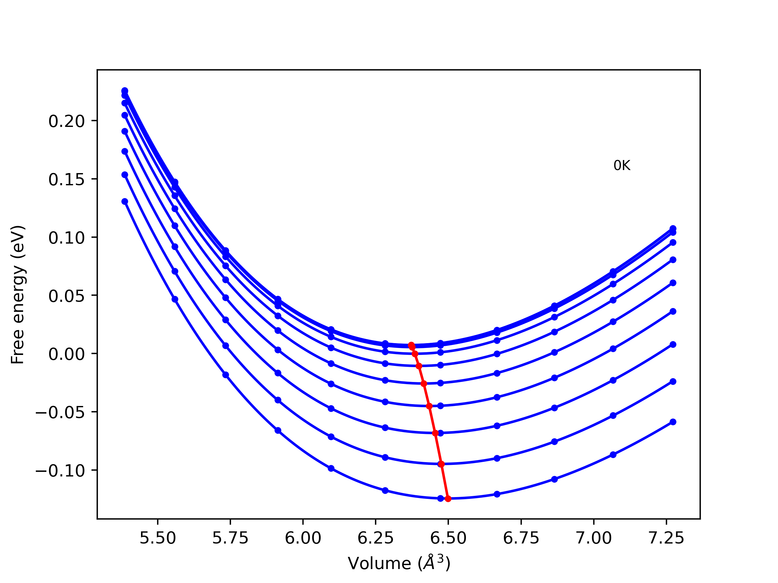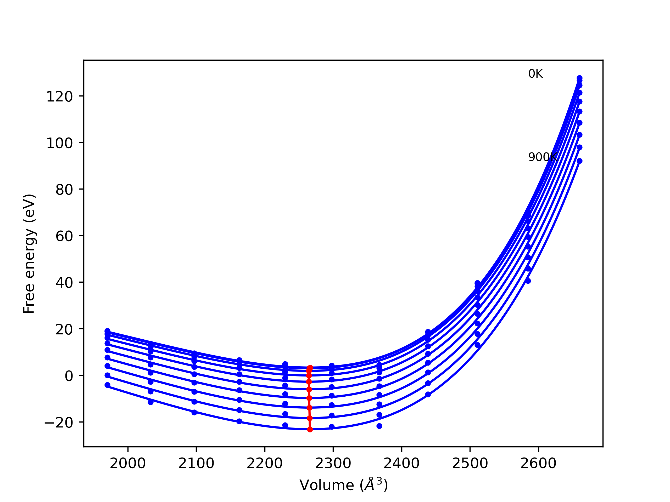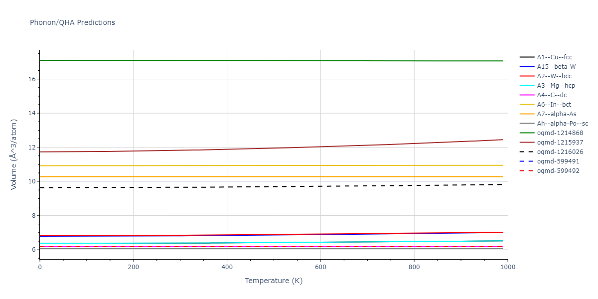 Plots of internal energy, Gibbs free energy, entropy, heat capacity and volume are shown here as a function of temperature for various crystal structures and liquid phases. The included crystal structures correspond to those in the Solid Structures vs. Temperature section, and the liquid phases to those in the Liquid Properties section. Internal energy and volume are taken from the associated structure relaxations mentioned in those previous sections. Constant pressure heat capacity is estimated using 3-point numerical derivatives of enthalpy versus temperature. Note that since all simulations done here are at 0 pressure, internal energy and enthalpy are equivalent.