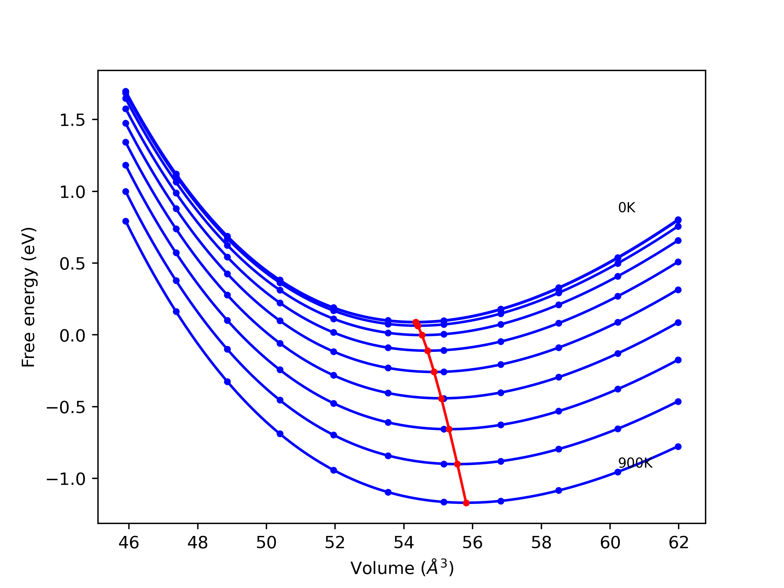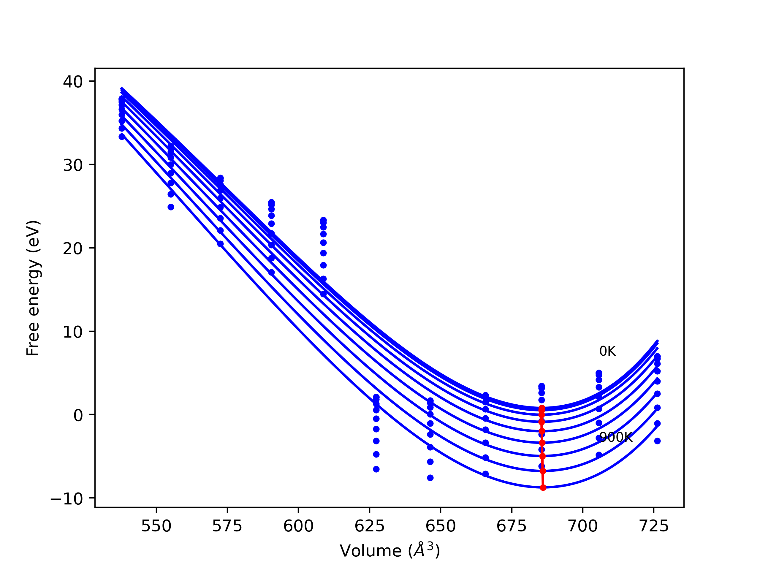 The Gibbs energies of the phases are estimated using thermodynamic integration between the interatomic potential in question and a simpler model with known Gibbs free energy values. For solids, the reference model is an Einstein solid, while for liquids it is the Uhlenbeck-Ford potential. Besides a short run at the start of the solid calculations to estimate Einstein model spring constants, the two calculations proceed similarly. Starting with the final relaxation configurations, the systems are stabilized for 25,000 steps. Then, over the next 50,000 steps the potential is swapped out for the reference potential. The system is then stabilized for another 25,000 steps with the reference model before a reverse swap of 50,000 steps is performed. The simulation ends with one final 25,000 step stabilization period. From the simulation, the irreversible work of transformation is estimated and used to compute the absolute Gibbs free energy of the target phase and potential relative to the reference potential. Entropy is estimated as the difference in enthalpy and Gibbs free energy and divided by temperature.
