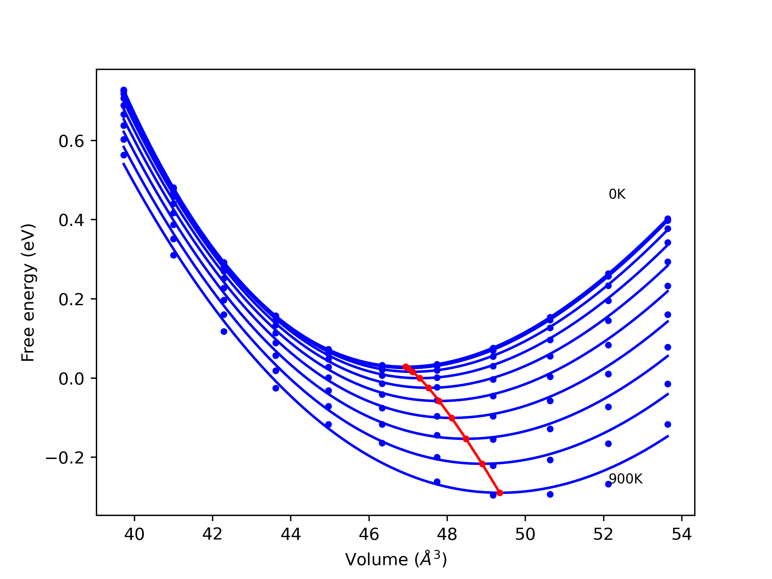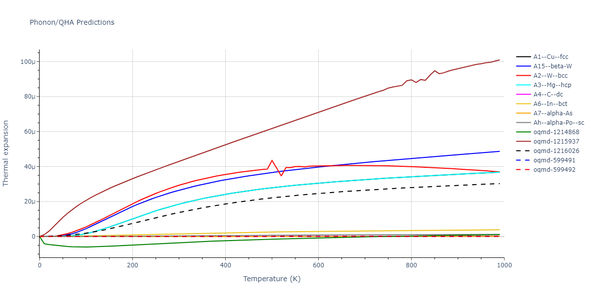 Plots of lattice and elastic constants are shown as a function of temperature. The 0K points were taken from the Crystal Structure Predictions and the Elastic Constants Predictions sections above for the unique crystal structures relaxed with the "dynamic" method. Starting from the 0 K relaxed crystal unit cells, supercell systems are created by replicating all three dimensions by the same multiplier to achieve at least 4000 atoms. The systems are then relaxed at 50 K and zero pressure using 1 million NPT steps. Lattice constants are estimated by averaging the measured box dimensions. Temperatures are iteratively increased by 50 K, with each subsequent relaxation calculation starting from the final atomic configuration at the previous temperature and relaxing for another 1 million steps.