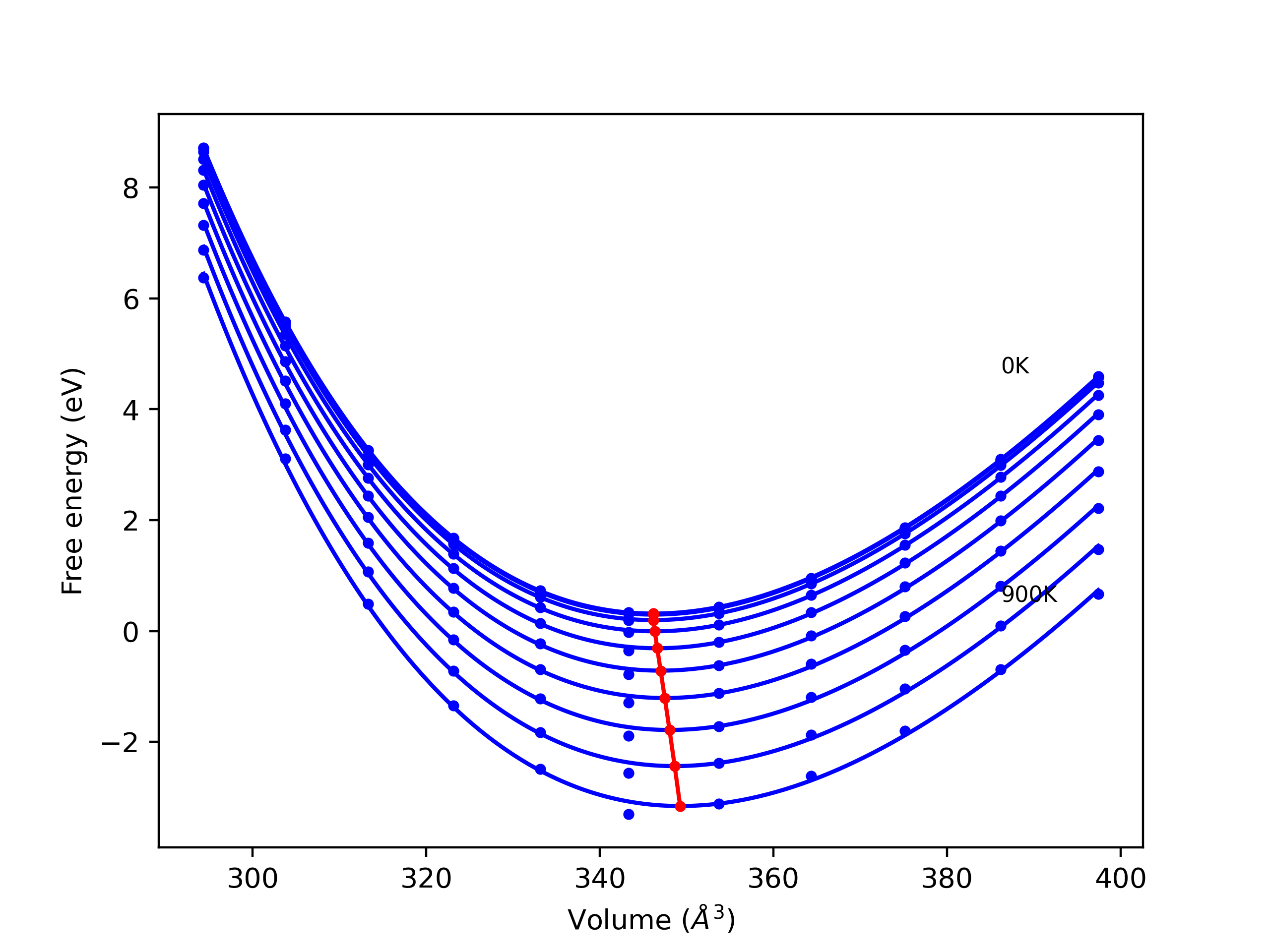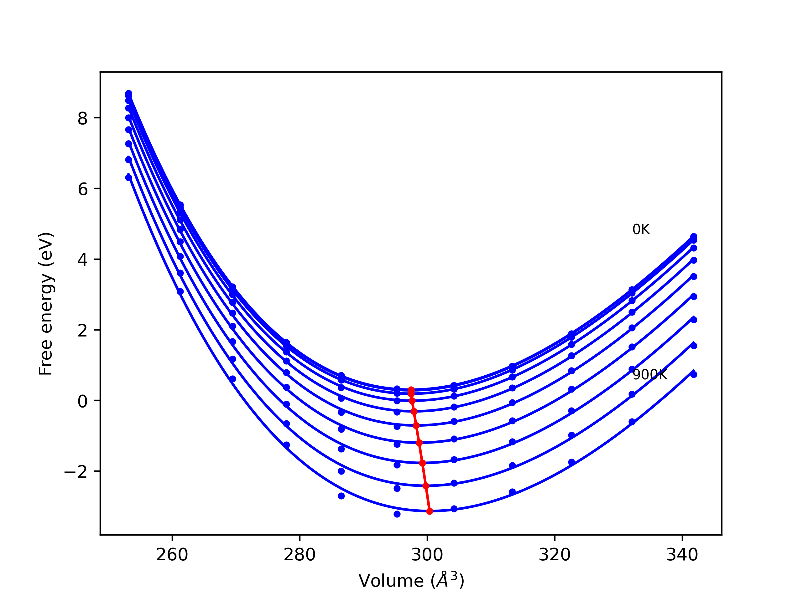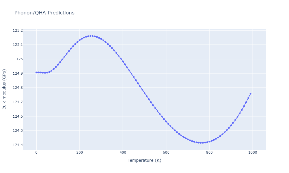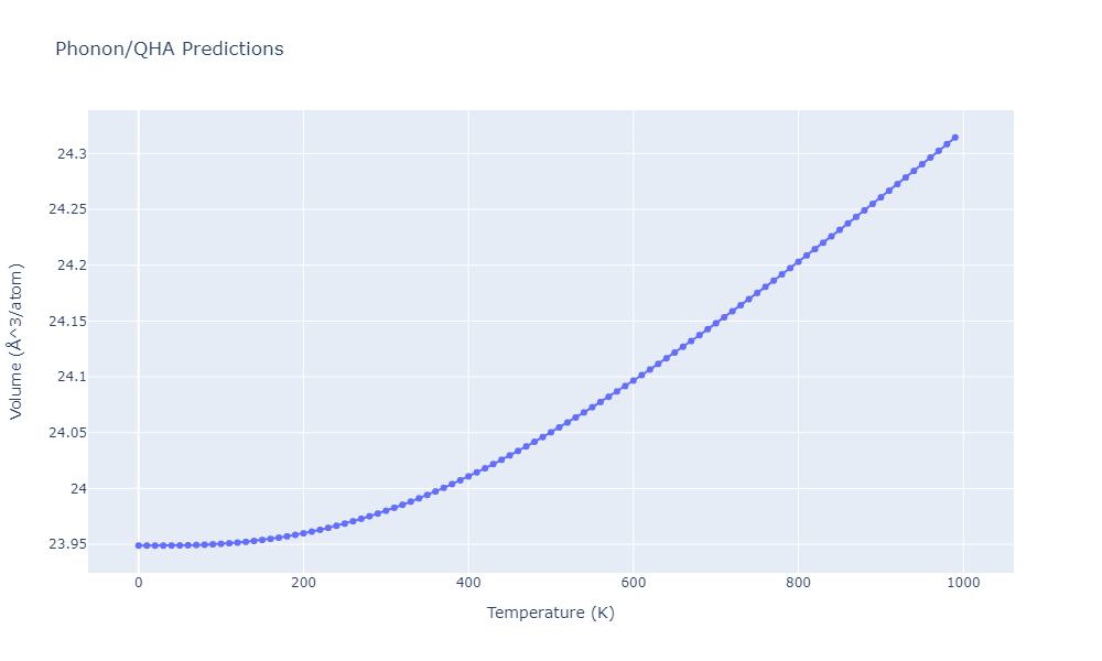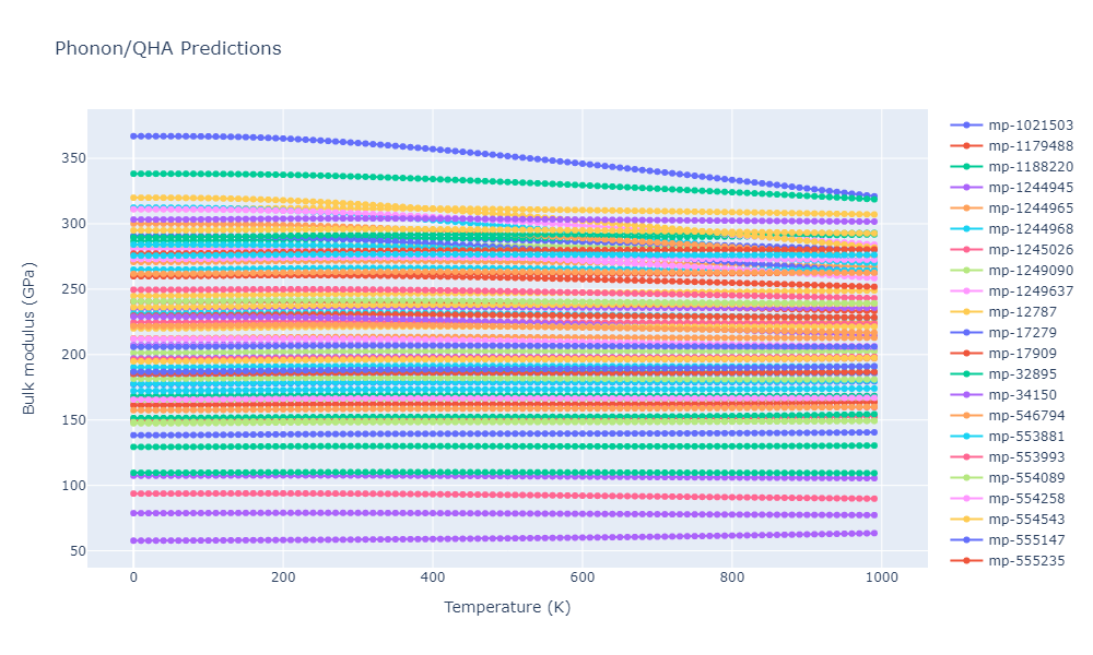 Phonon band structures and crystal properties estimated from quasi-harmonic approximation (QHA) calculations are displayed for select crystals. The calculations were performed using phonopy and LAMMPS. For the phonon calculations, 3x3 supercells of the potential-specific relaxed crystals were used. The QHA calculations were based on 11 strain states ranging from -0.05 to 0.05.