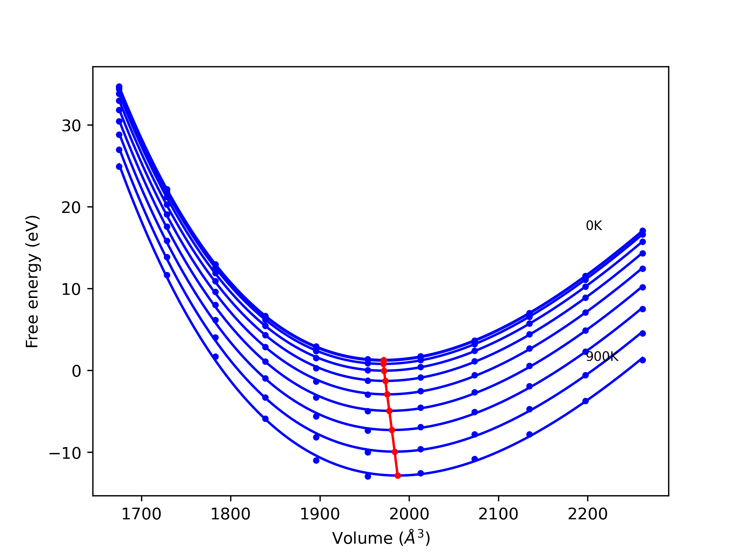 Plots of internal energy, Gibbs free energy, entropy, heat capacity and volume are shown here as a function of temperature for various crystal structures and liquid phases. The included crystal structures correspond to those in the Solid Structures vs. Temperature section, and the liquid phases to those in the Liquid Properties section. Internal energy and volume are taken from the associated structure relaxations mentioned in those previous sections. Constant pressure heat capacity is estimated using 3-point numerical derivatives of enthalpy versus temperature. Note that since all simulations done here are at 0 pressure, internal energy and enthalpy are equivalent.