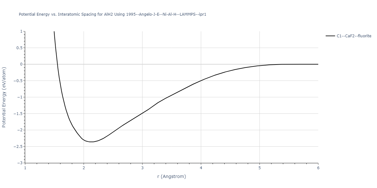 Plots of potential energy vs interatomic spacing, r, are shown below for a number of crystal structures. The structures are generated based on the ideal atomic positions and b/a and c/a lattice parameter ratios for a given crystal prototype. The size of the system is then uniformly scaled, and the energy calculated without relaxing the system. To obtain these plots, values of r are evaluated every 0.02 Å up to 6 Å.
