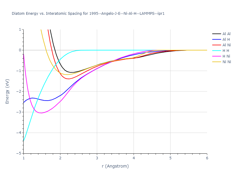 Plots of the potential energy vs interatomic spacing, r, are shown below for all diatom sets associated with the interatomic potential. This calculation provides insights into the functional form of the potential's two-body interactions. A system consisting of only two atoms is created, and the potential energy is evaluated for the atoms separated by 0.02 Å <= r <= 6.0> Å in intervals of 0.02 Å. Two plots are shown: one for the "standard" interaction distance range, and one for small values of r. The small r plot is useful for determining whether the potential is suitable for radiation studies.