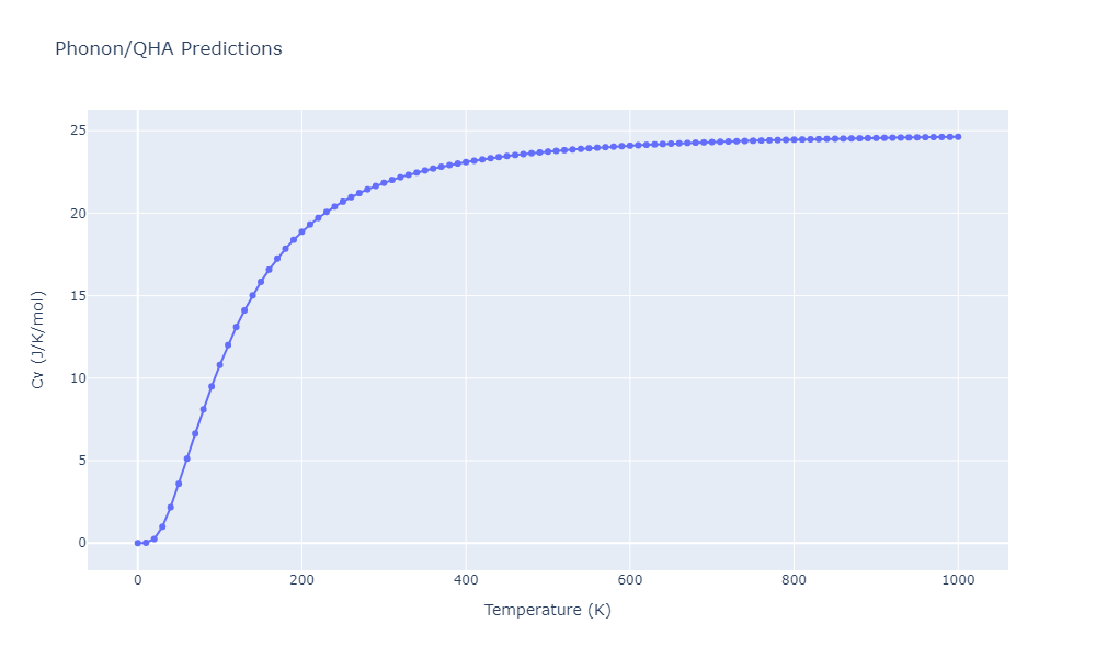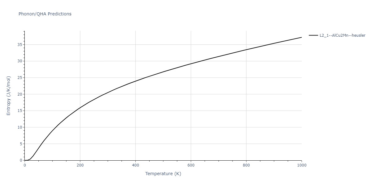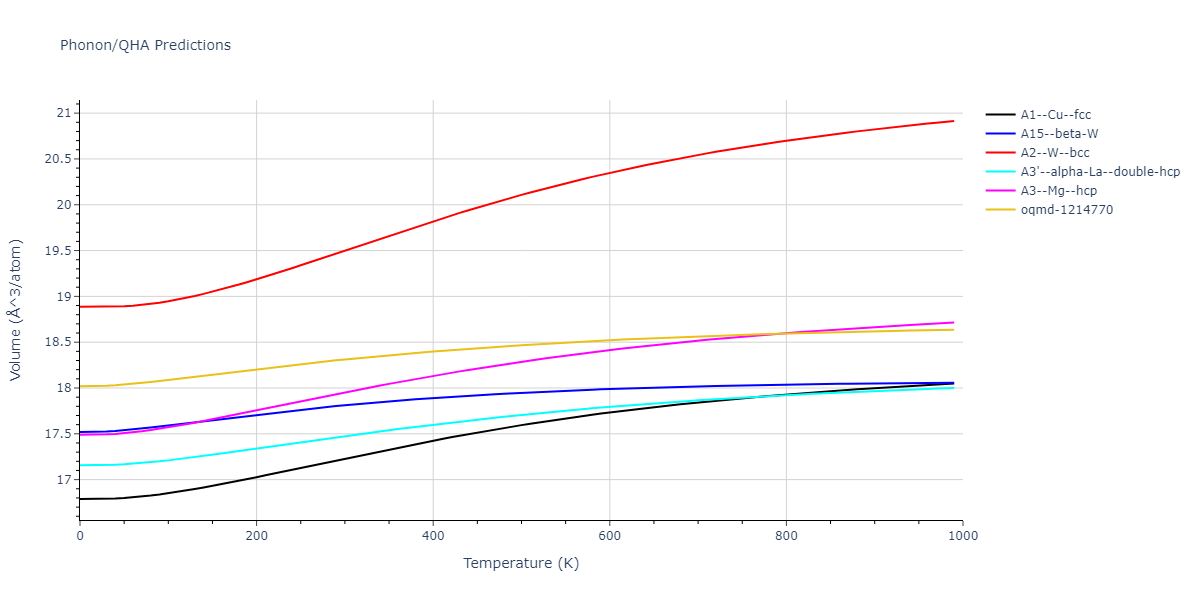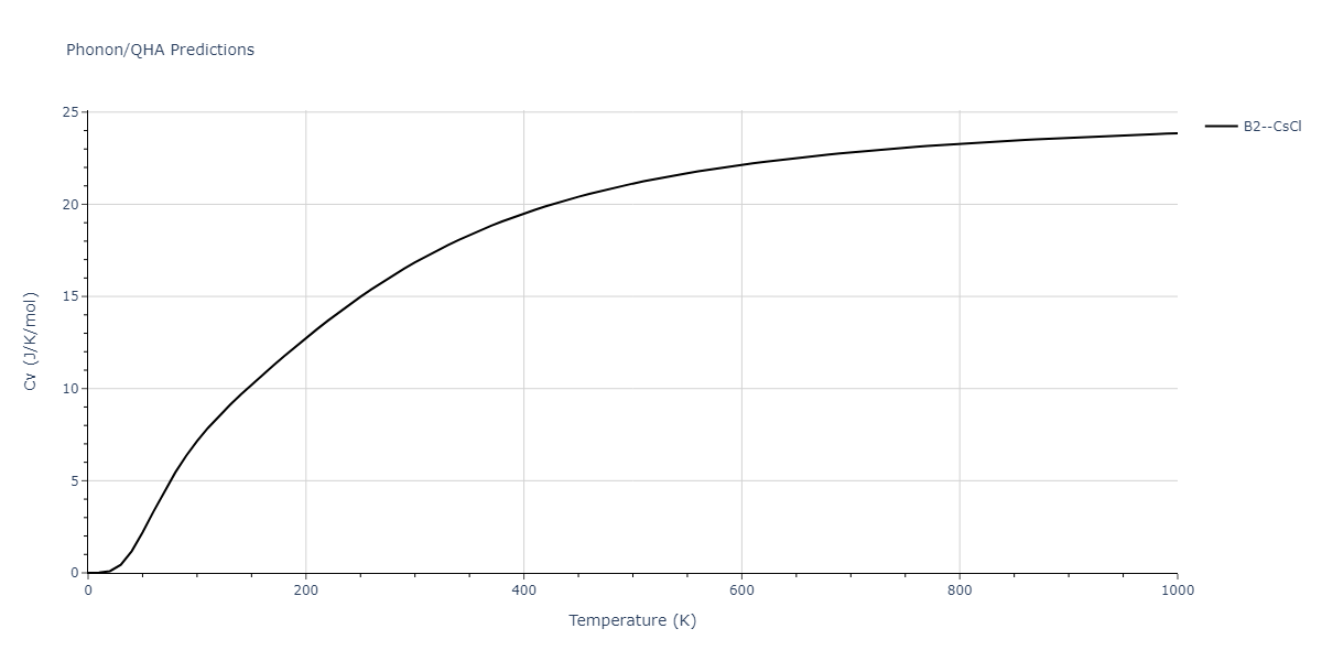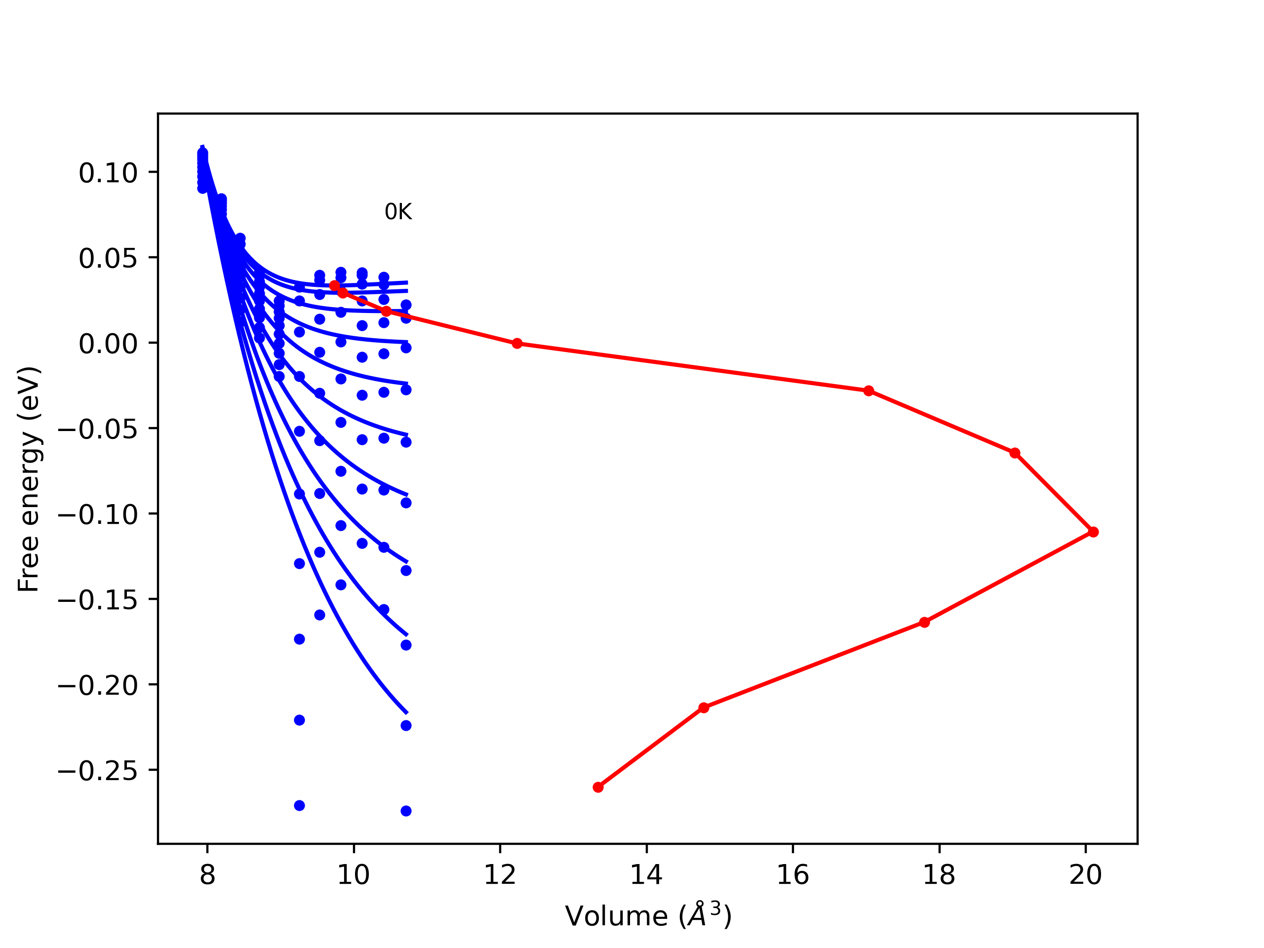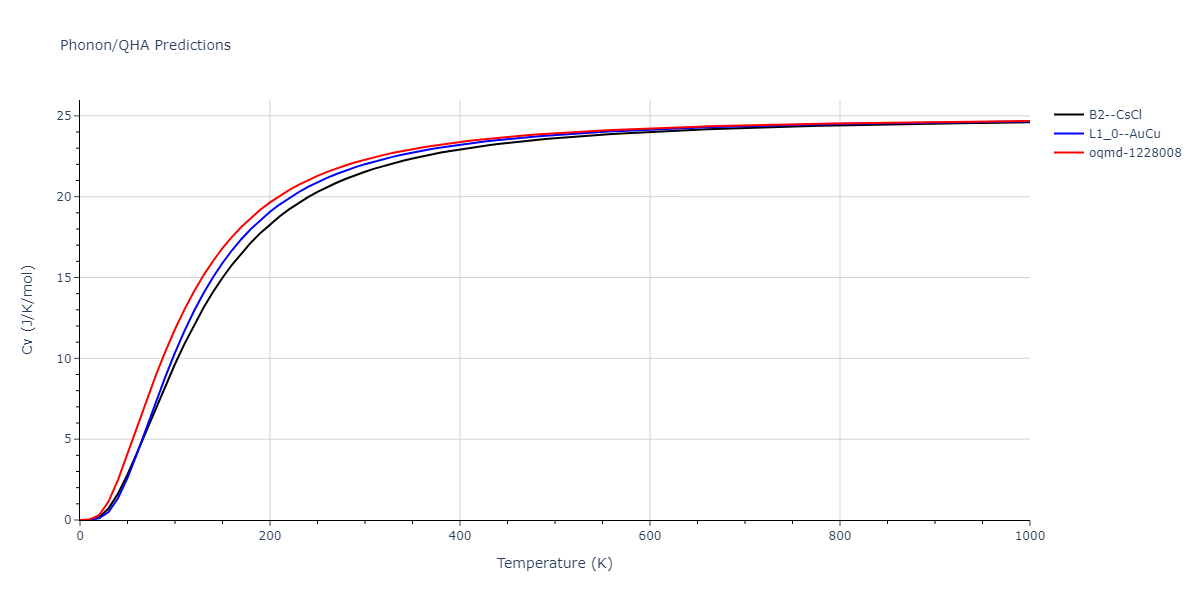 Plots of internal energy, Gibbs free energy, entropy, heat capacity and volume are shown here as a function of temperature for various crystal structures and liquid phases. The included crystal structures correspond to those in the Solid Structures vs. Temperature section, and the liquid phases to those in the Liquid Properties section. Internal energy and volume are taken from the associated structure relaxations mentioned in those previous sections. Constant pressure heat capacity is estimated using 3-point numerical derivatives of enthalpy versus temperature. Note that since all simulations done here are at 0 pressure, internal energy and enthalpy are equivalent.