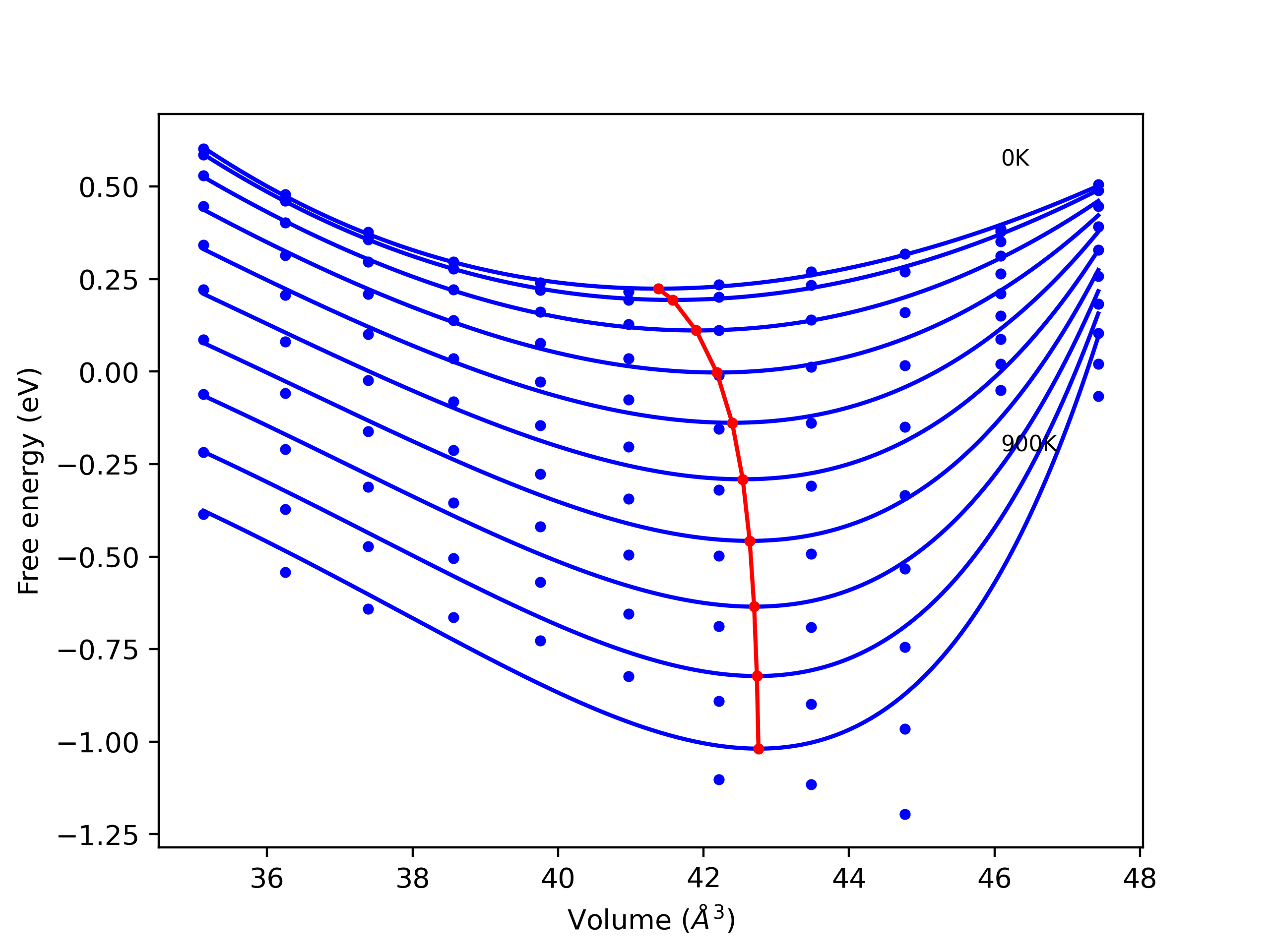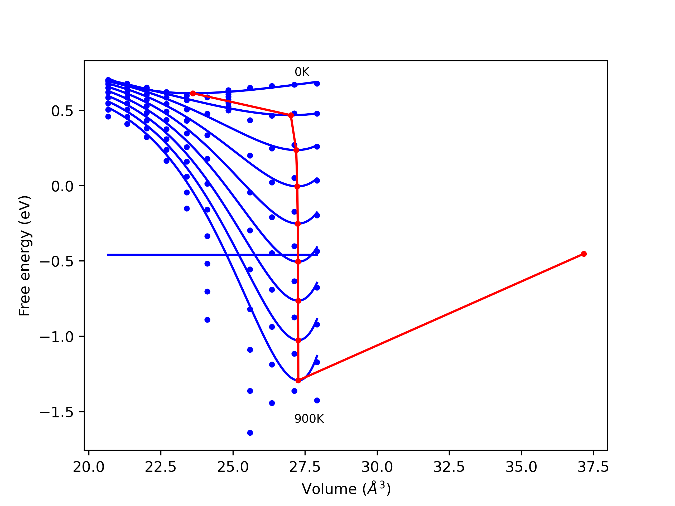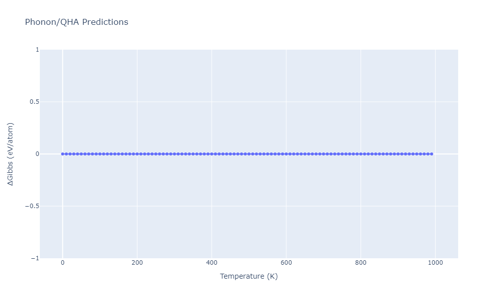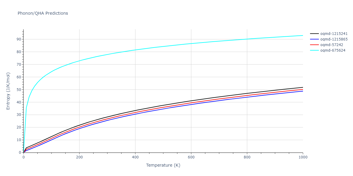 The Gibbs energies of the phases are estimated using thermodynamic integration between the interatomic potential in question and a simpler model with known Gibbs free energy values. For solids, the reference model is an Einstein solid, while for liquids it is the Uhlenbeck-Ford potential. Besides a short run at the start of the solid calculations to estimate Einstein model spring constants, the two calculations proceed similarly. Starting with the final relaxation configurations, the systems are stabilized for 25,000 steps. Then, over the next 50,000 steps the potential is swapped out for the reference potential. The system is then stabilized for another 25,000 steps with the reference model before a reverse swap of 50,000 steps is performed. The simulation ends with one final 25,000 step stabilization period. From the simulation, the irreversible work of transformation is estimated and used to compute the absolute Gibbs free energy of the target phase and potential relative to the reference potential. Entropy is estimated as the difference in enthalpy and Gibbs free energy and divided by temperature.