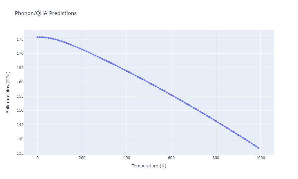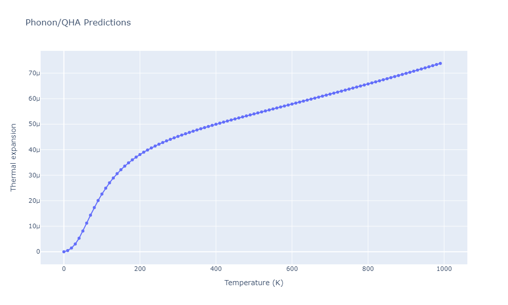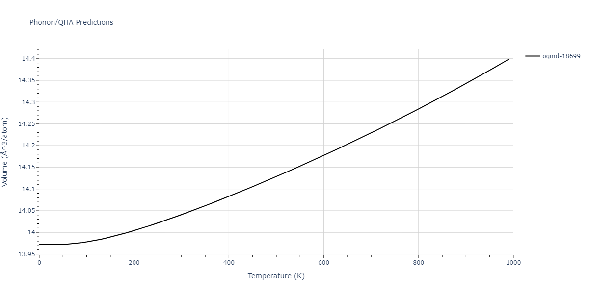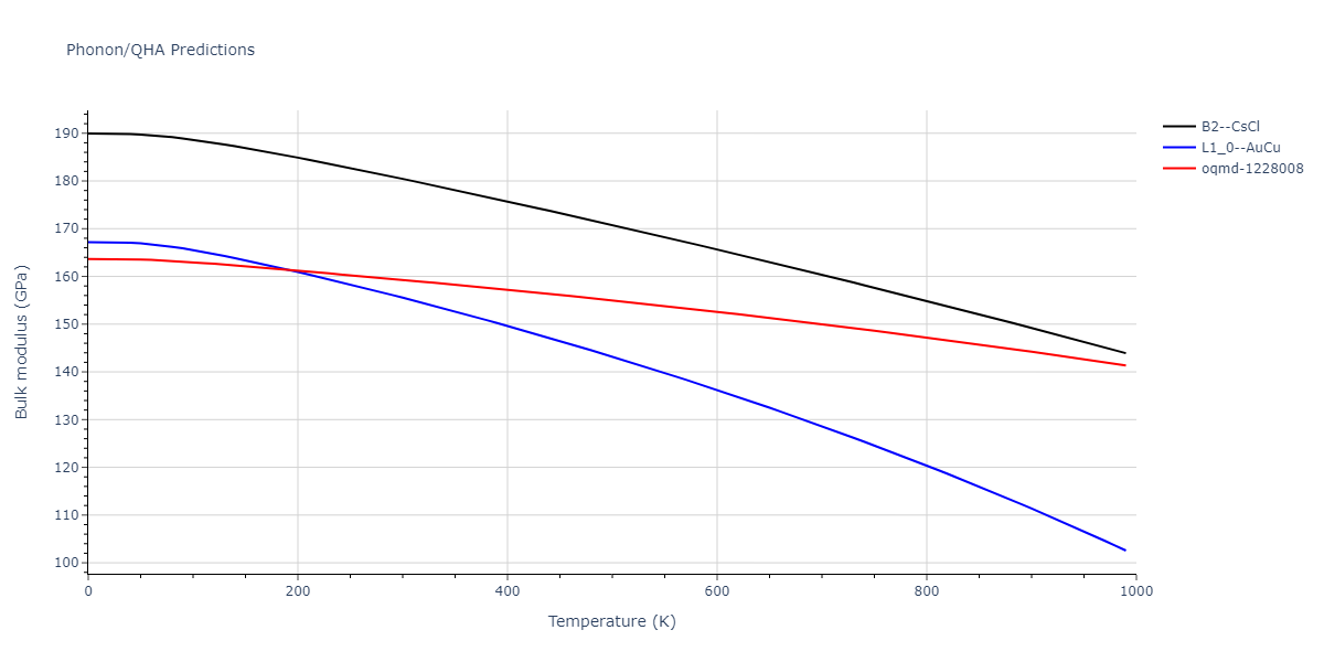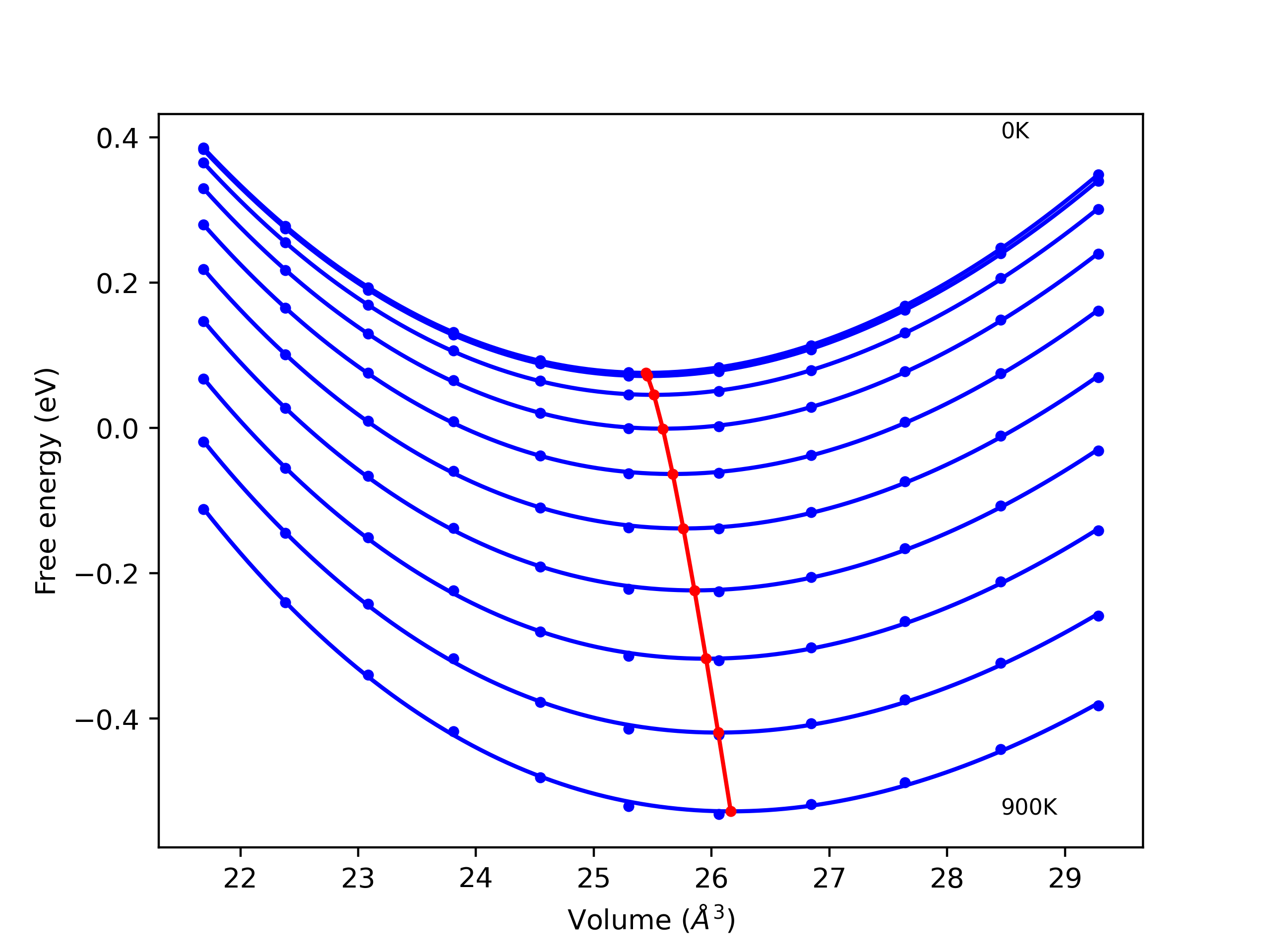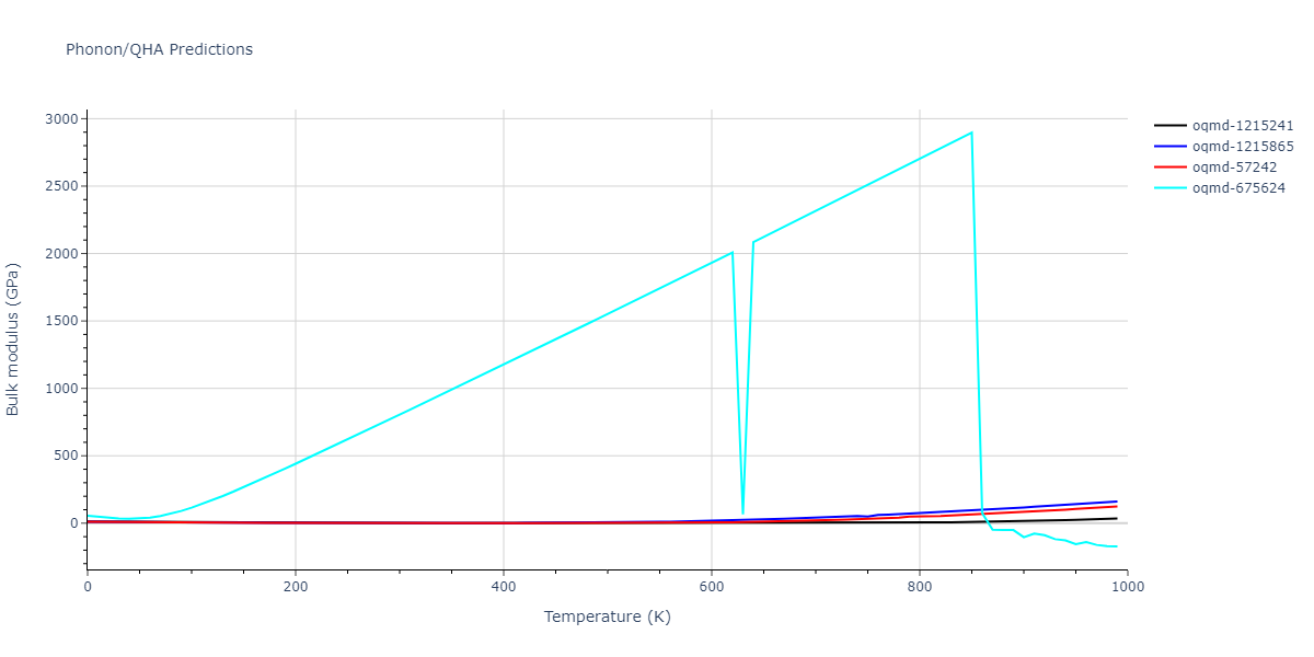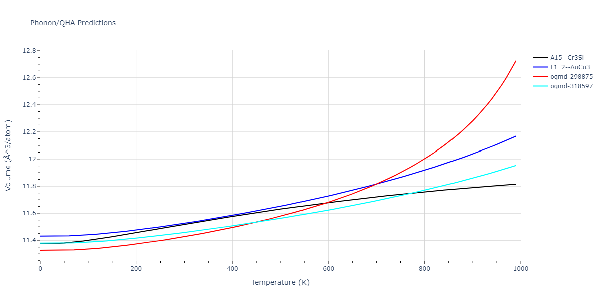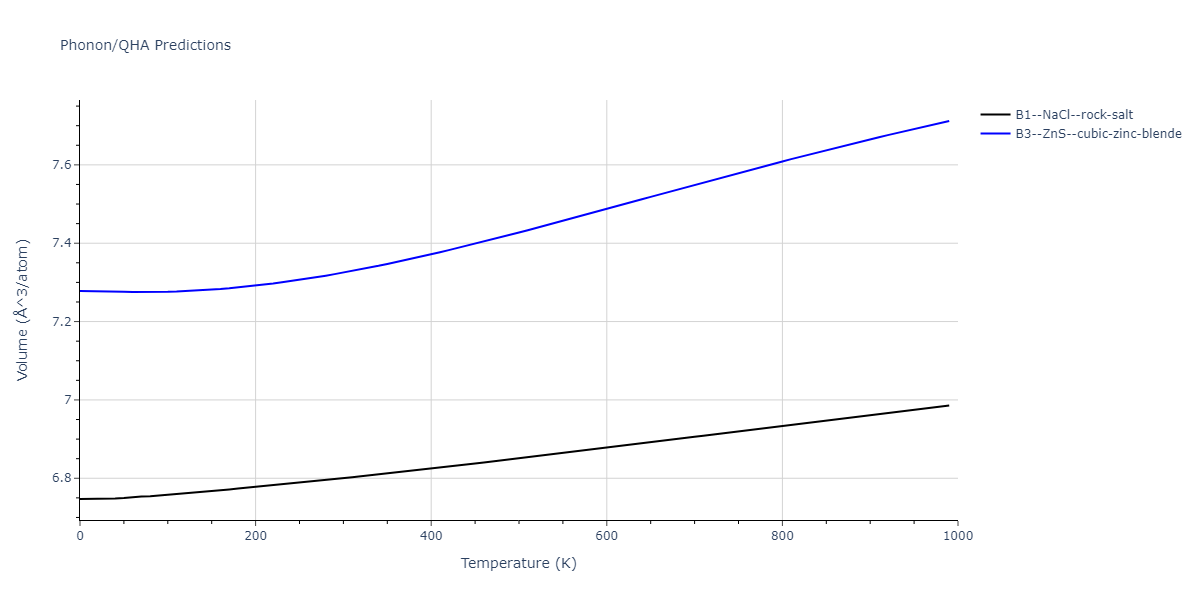 Plots of lattice and elastic constants are shown as a function of temperature. The 0K points were taken from the Crystal Structure Predictions and the Elastic Constants Predictions sections above for the unique crystal structures relaxed with the "dynamic" method. Starting from the 0 K relaxed crystal unit cells, supercell systems are created by replicating all three dimensions by the same multiplier to achieve at least 4000 atoms. The systems are then relaxed at 50 K and zero pressure using 1 million NPT steps. Lattice constants are estimated by averaging the measured box dimensions. Temperatures are iteratively increased by 50 K, with each subsequent relaxation calculation starting from the final atomic configuration at the previous temperature and relaxing for another 1 million steps.